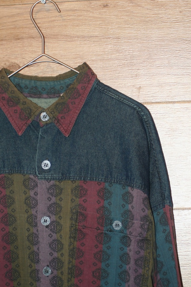 ※阿佐ヶ谷"雑踏"に在庫ございます。 回転速度による物理法則のジャイロ効果をソースにしたチーム名はユニークな集団だったのでしょう。 稀に見られるフロント切り替えのボーリングシャツ。 ボタンは開閉できるようになっており、レイヤードの様な印象を与えるシャツは現行のアイテムとは違う違和感のないパターン構成。 カラーリングも素晴らしいですね。 Men's Sくらい 身幅56cm 着丈62cm 袖丈22cm 着用モデル170cm 2404063