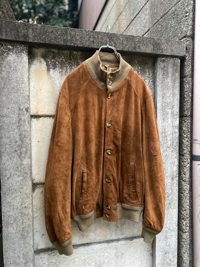 ※祐天寺"電波赤丸"に在庫ございます。 キャラメル色のスウェードブルゾン。 柔らかくて、光の向きで表情が変わります。 キャラメル色が溶けかけた午後の光みたいで、袖と襟の部分だけが、すこし冷めたコーヒーの色をしてます。重さがあって、体温でなじんでいく素材だと思います。 何言ってんの?と思った方にちゃんと服の説明。 この手の中でも見かけない配色の2トーンというのがポイント。 左袖には同色のワッペンデザイン。完全にミリタリーオマージュですね。 滅茶苦茶カッコいいです。 Men's L 身幅64cm 着丈67cm 袖丈68cm d0698