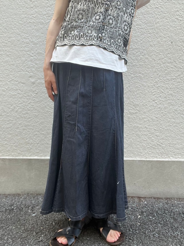※阿佐ヶ谷"雑踏"に在庫ございます。 線を足して、生地を削って、ちょっと揺らして。 深いネイビーに落としたデニムスカート。 ほんのりマーメイドシルエットですが、むしろ街のざらつきを感じる一着です。 しっかりとベルトループ付き、履いておけば間違いないやつです。 ウエスト68cm 着丈75cm 着画モデル151cm 25060104