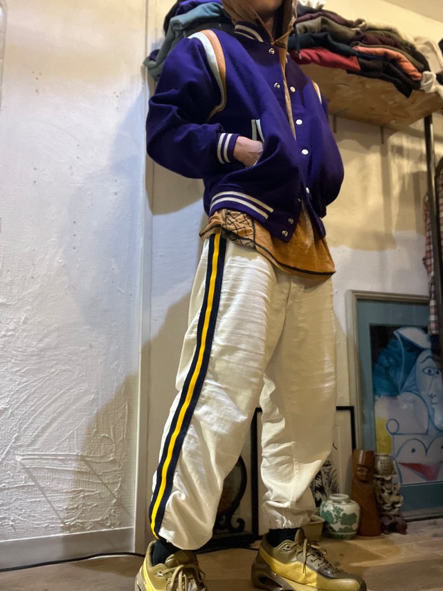 ※阿佐ヶ谷"雑踏"に在庫ございます。 生成りのボディに、一本走るサイドライン。 スポーツ由来の軽さはあるのに、どこか力の抜けた表情。太すぎず細すぎず、溜まり方がちょうどいいのが気分です。 シルクを触れているかのようなとろみ。でも生地はしっかりとしていて、ビンテージならでは雰囲気がちゃんとあります。 ラフに見えて、ちゃんと計算が効いてるやつ。トップスを選ばない懐の深さ。 気づいたらこればっかり履いてる、そんな予感がします。 ウエスト92cm 股上34cm 股下61cm ワタリ35cm 裾幅11cm 着用モデル170cm 2511026