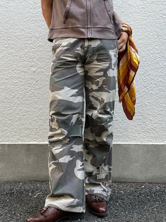 ※祐天寺"電波赤丸"に在庫ございます。 無骨な中にもどこか静寂を湛えた、カモフラ柄のイージーパンツ。 本来は景色に溶け込むための「迷彩」という柄。使い込まれてクタクタになったコットンの風合い。リップストップからも安心感を与えてくれます。 「軍モノはこう着るべき」なんて既成概念は、このワイドなシルエットの中に溶かしてしまえばいいんです。 ウエスト〜78cm 股上27cm 股下72cm ワタリ30cm 裾幅26cm 着用モデル170cm 2508157 d0732