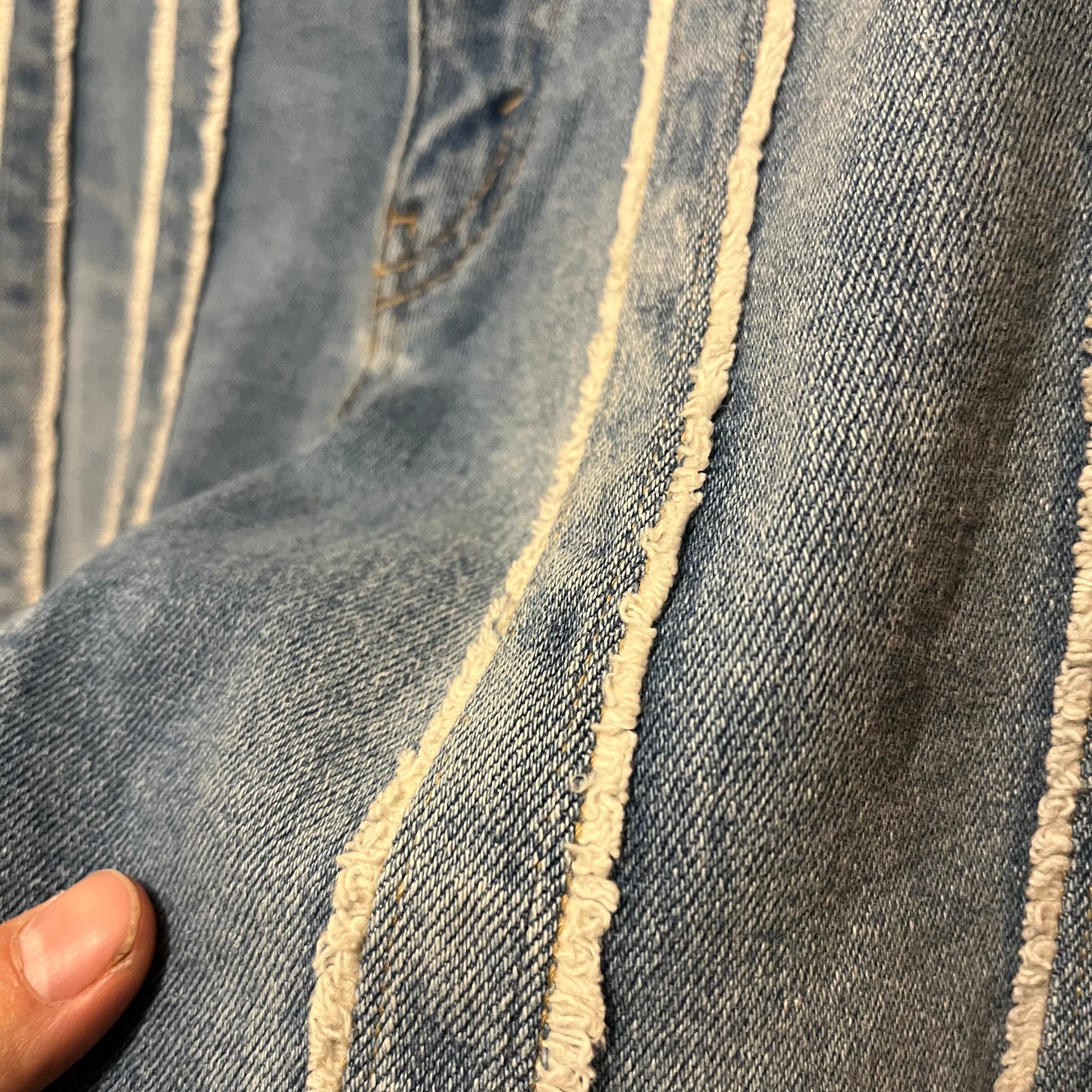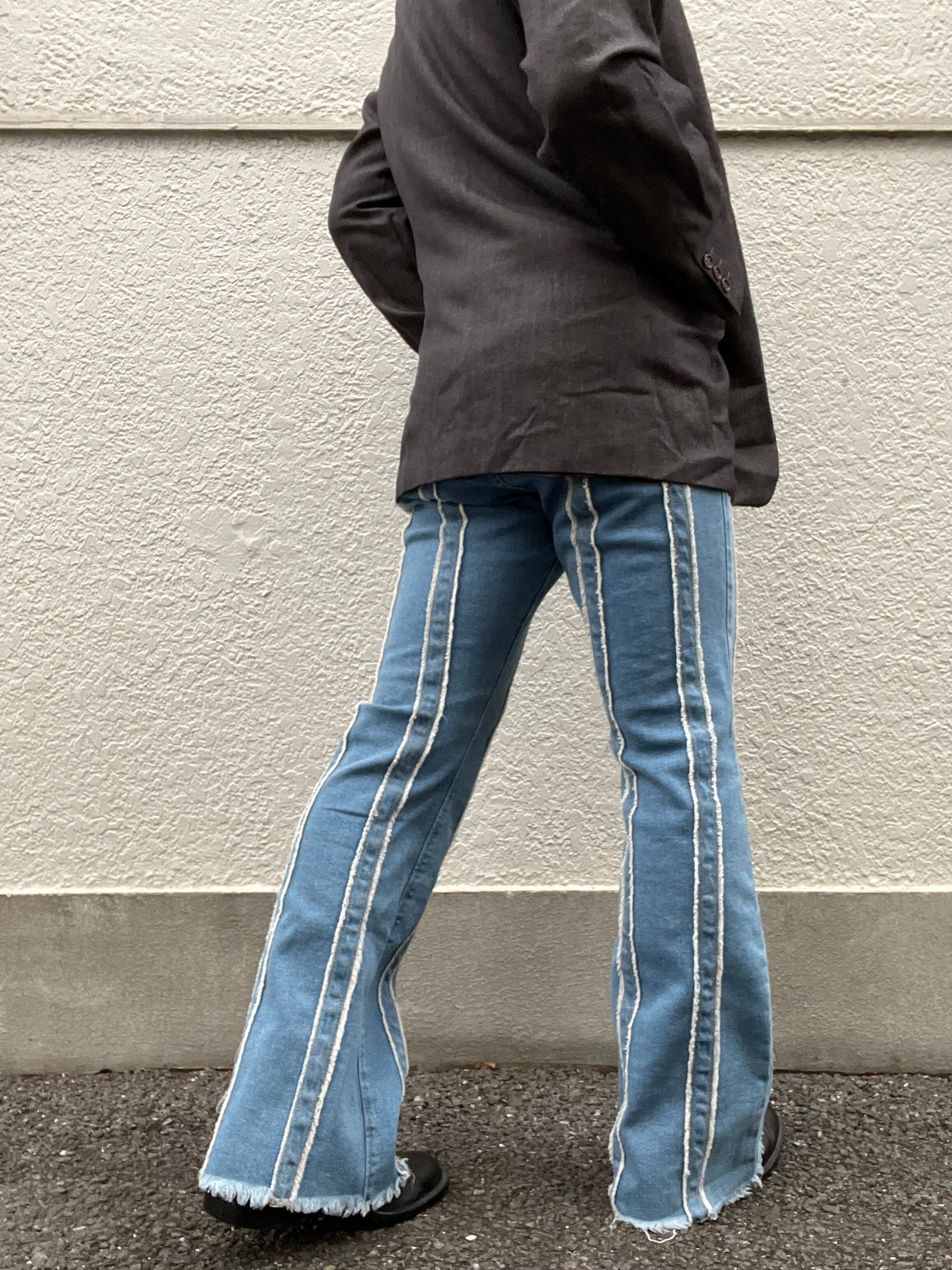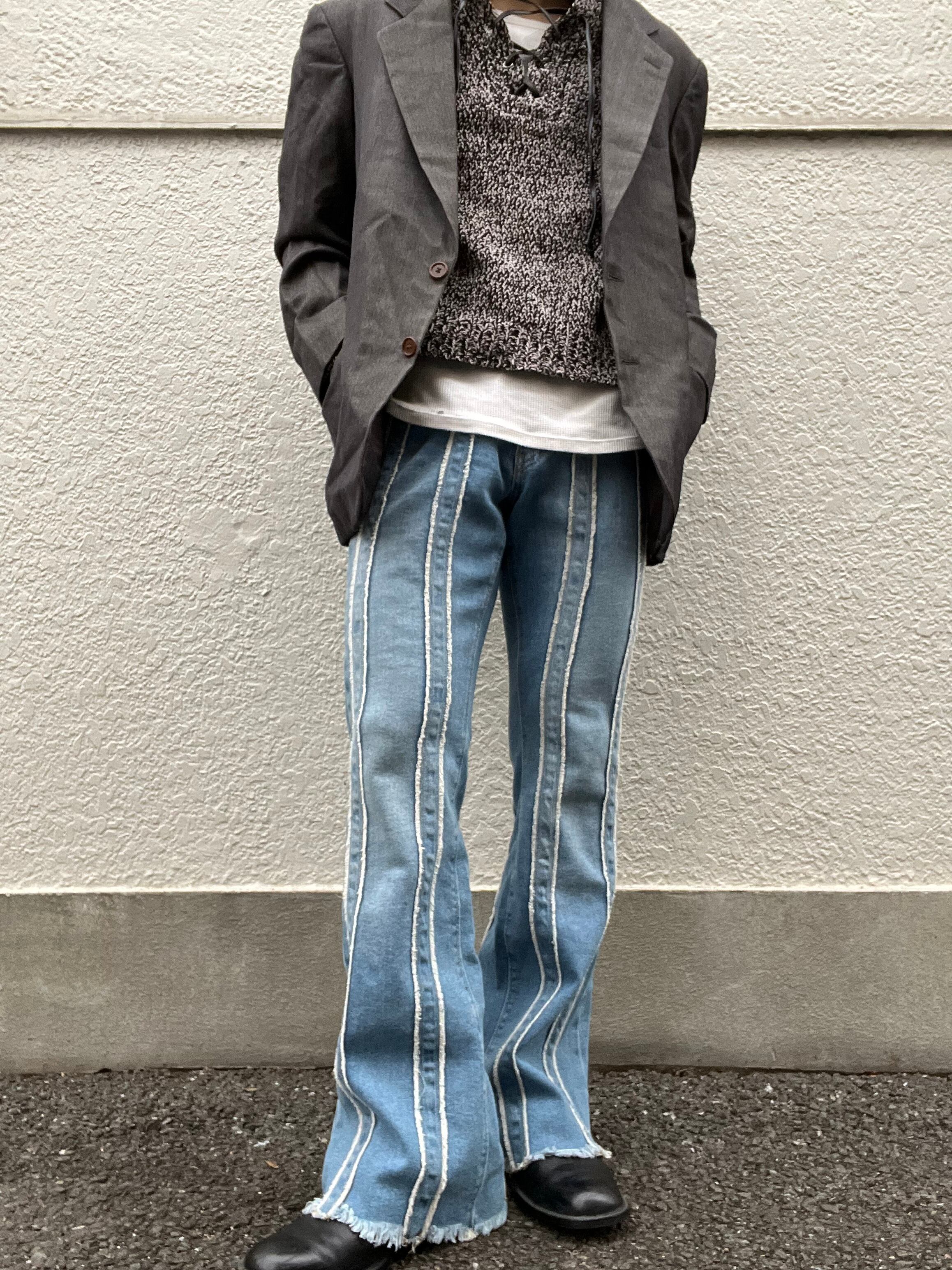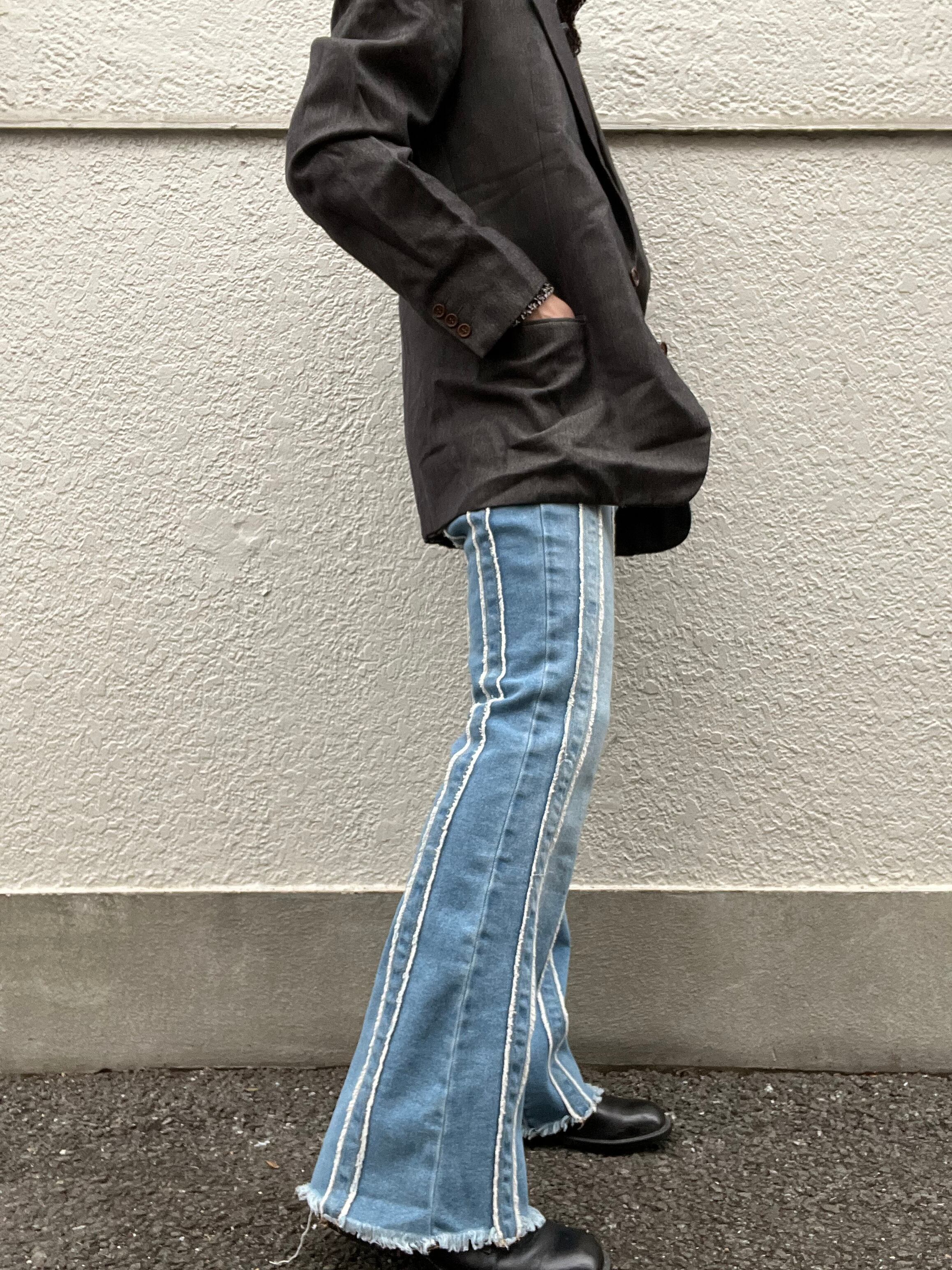 元々かなり細身なフレアシルエットですが、ウエスト太めをチョイスしたので、程よいゆるさで馴染みます。