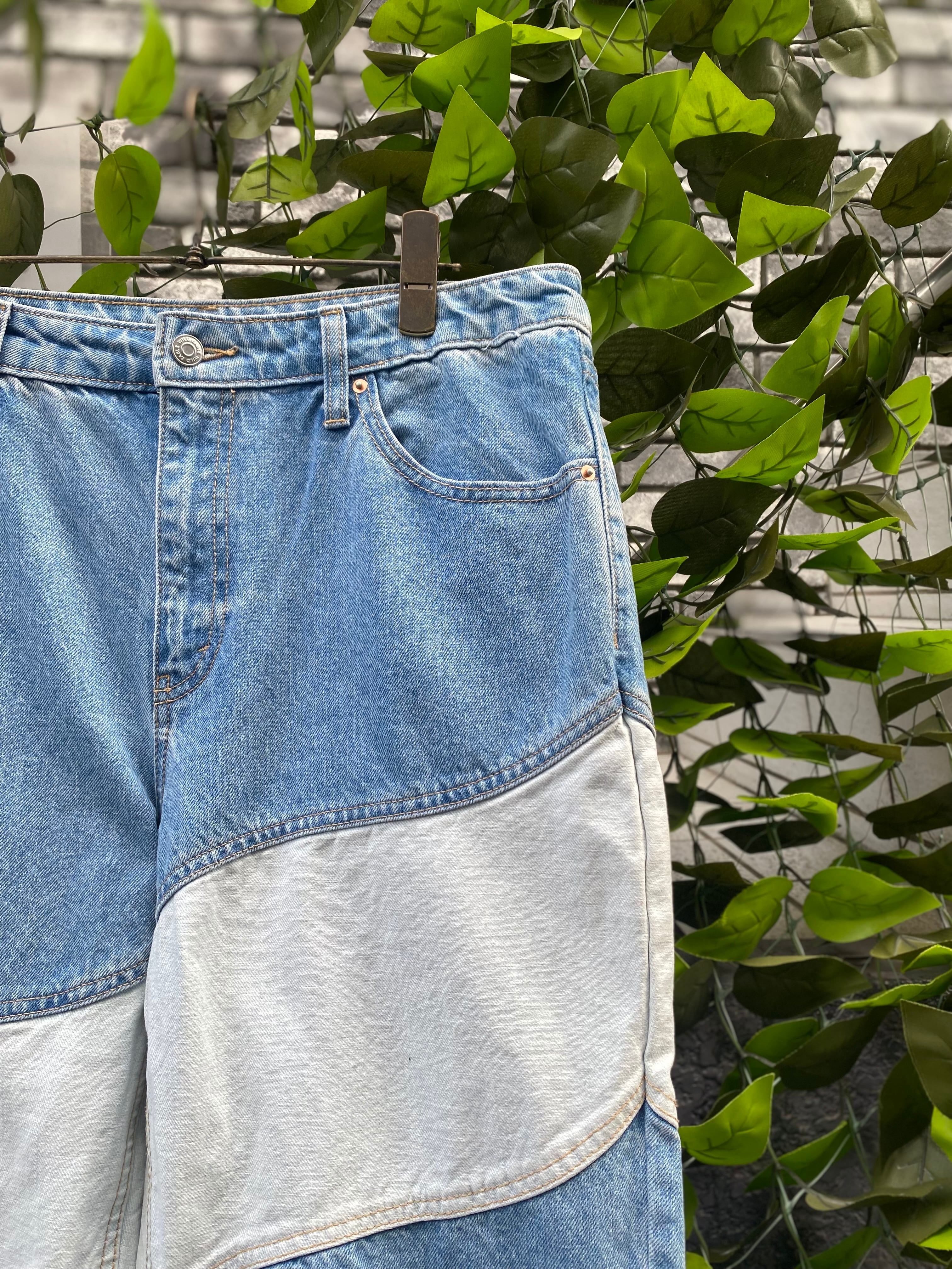 斜めに切り替えたデザインデニムは緩めなシルエットながらも個性豊かな一着に。