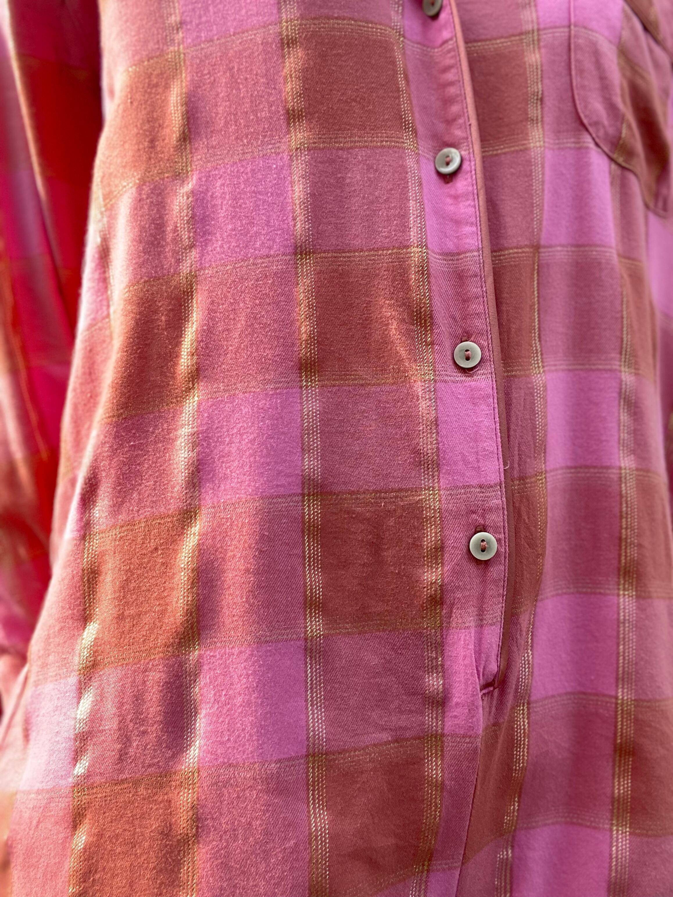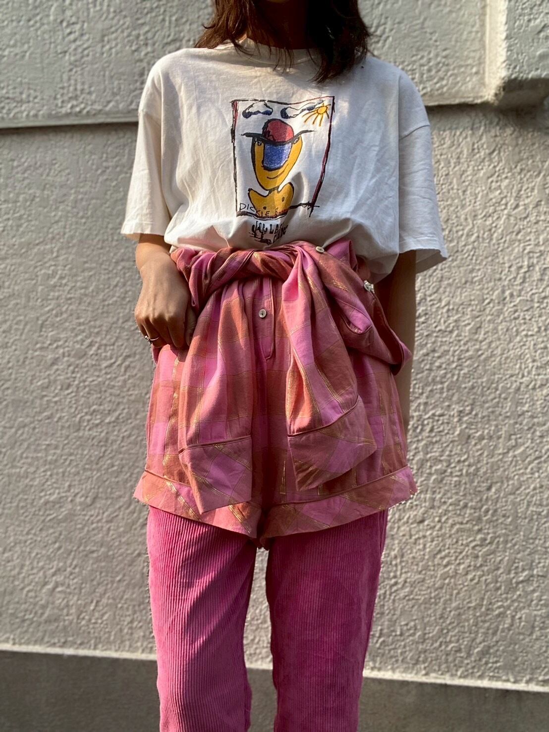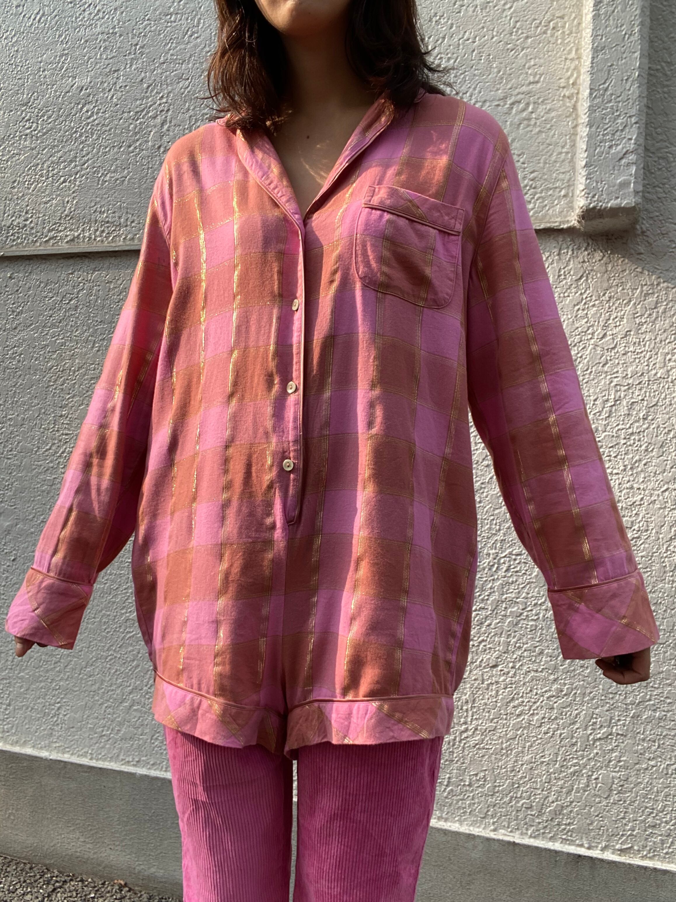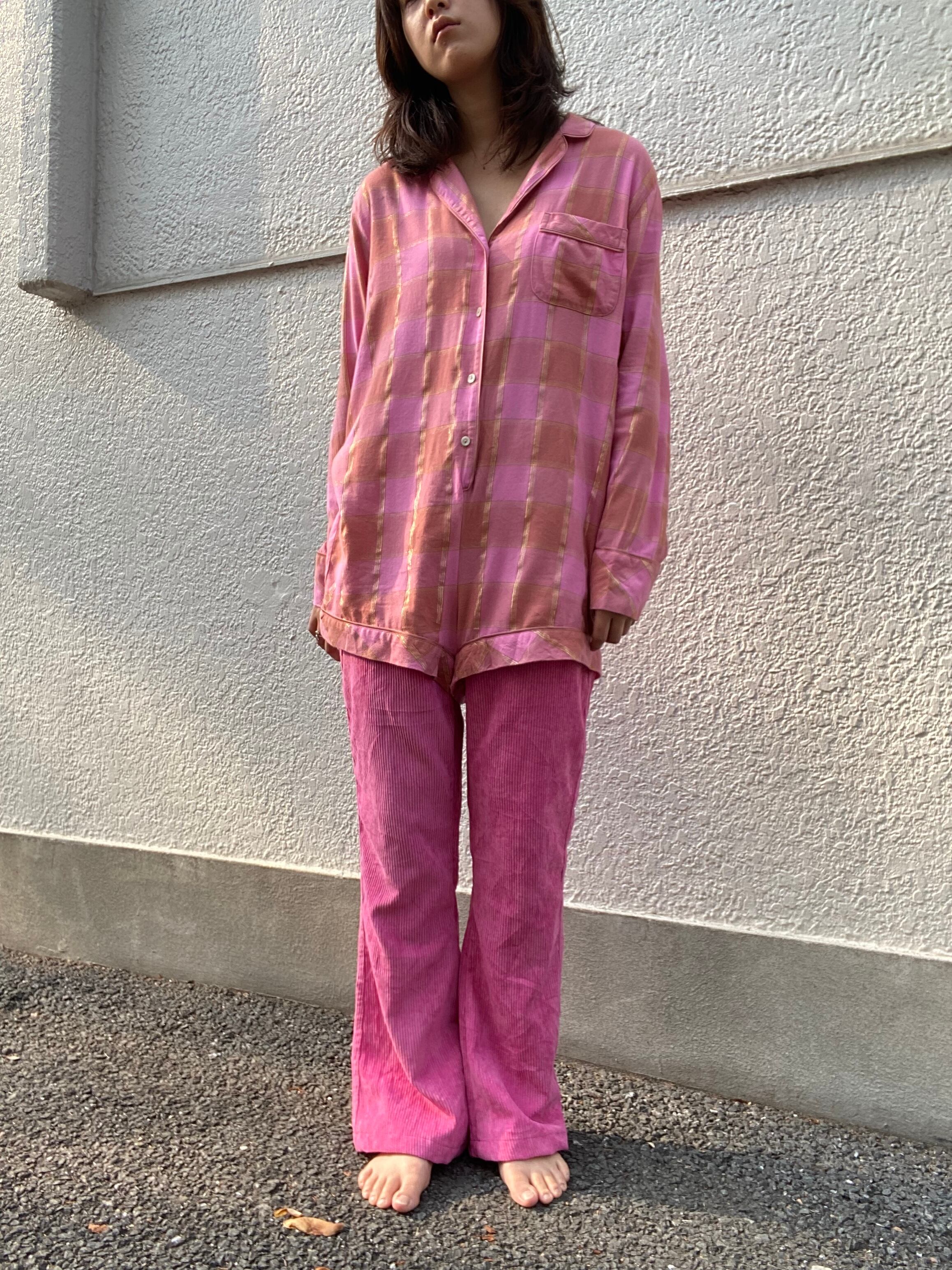 ピンク×ゴールドのゴージャスな配色に加え、パジャマシャツらしいハーフパンツ丈。