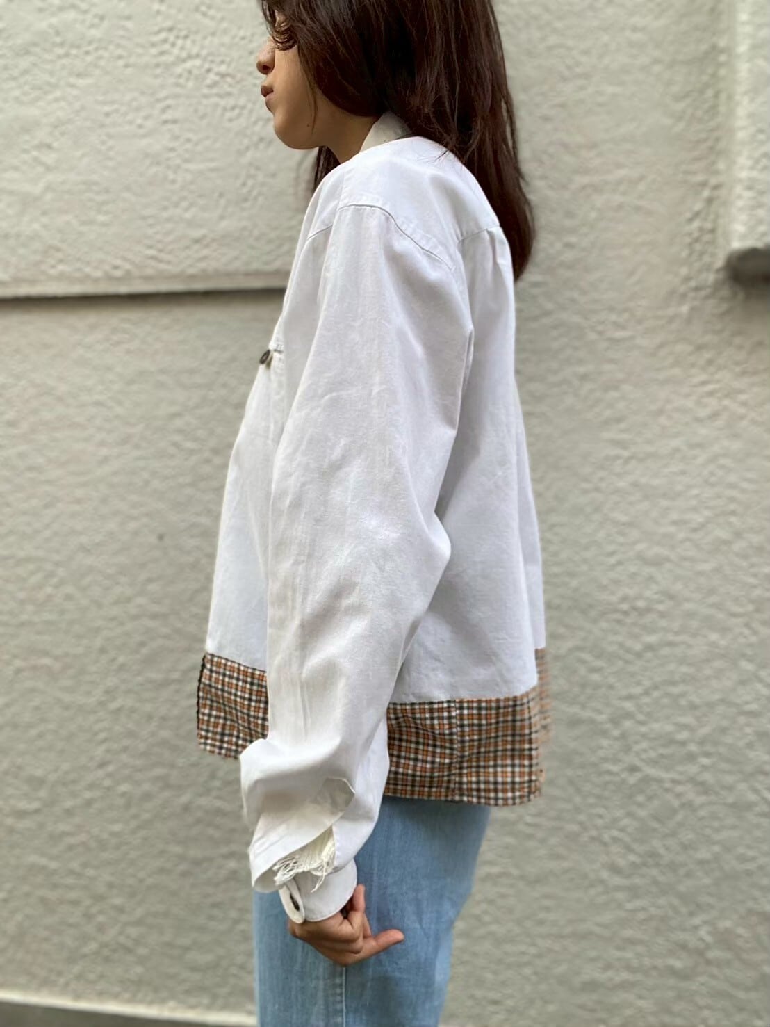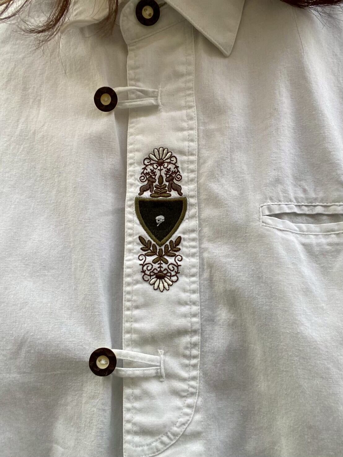 裾のチェック部分も同じチロリアンシャツで、刺繍の色味に合わせてチョイス。
