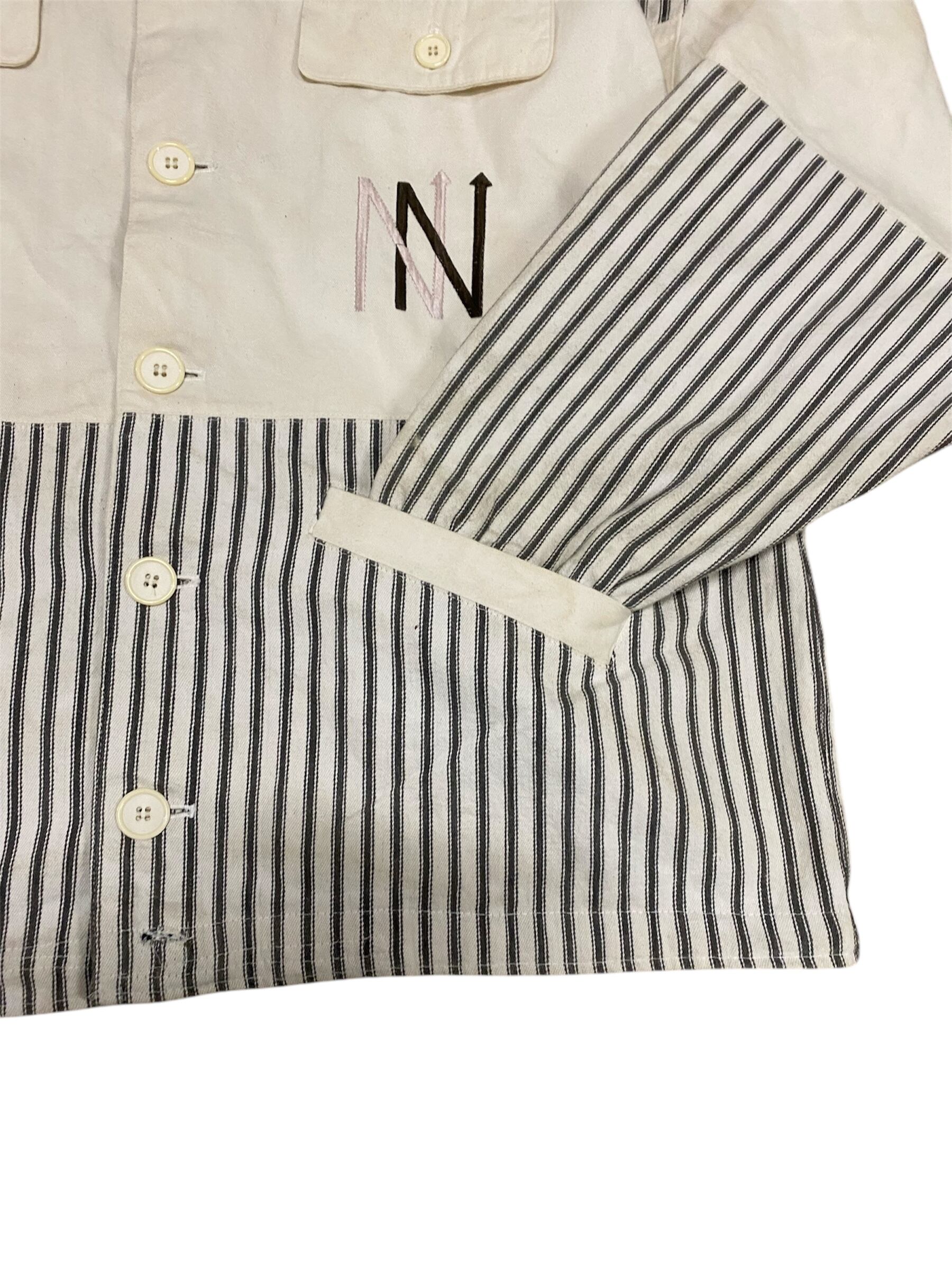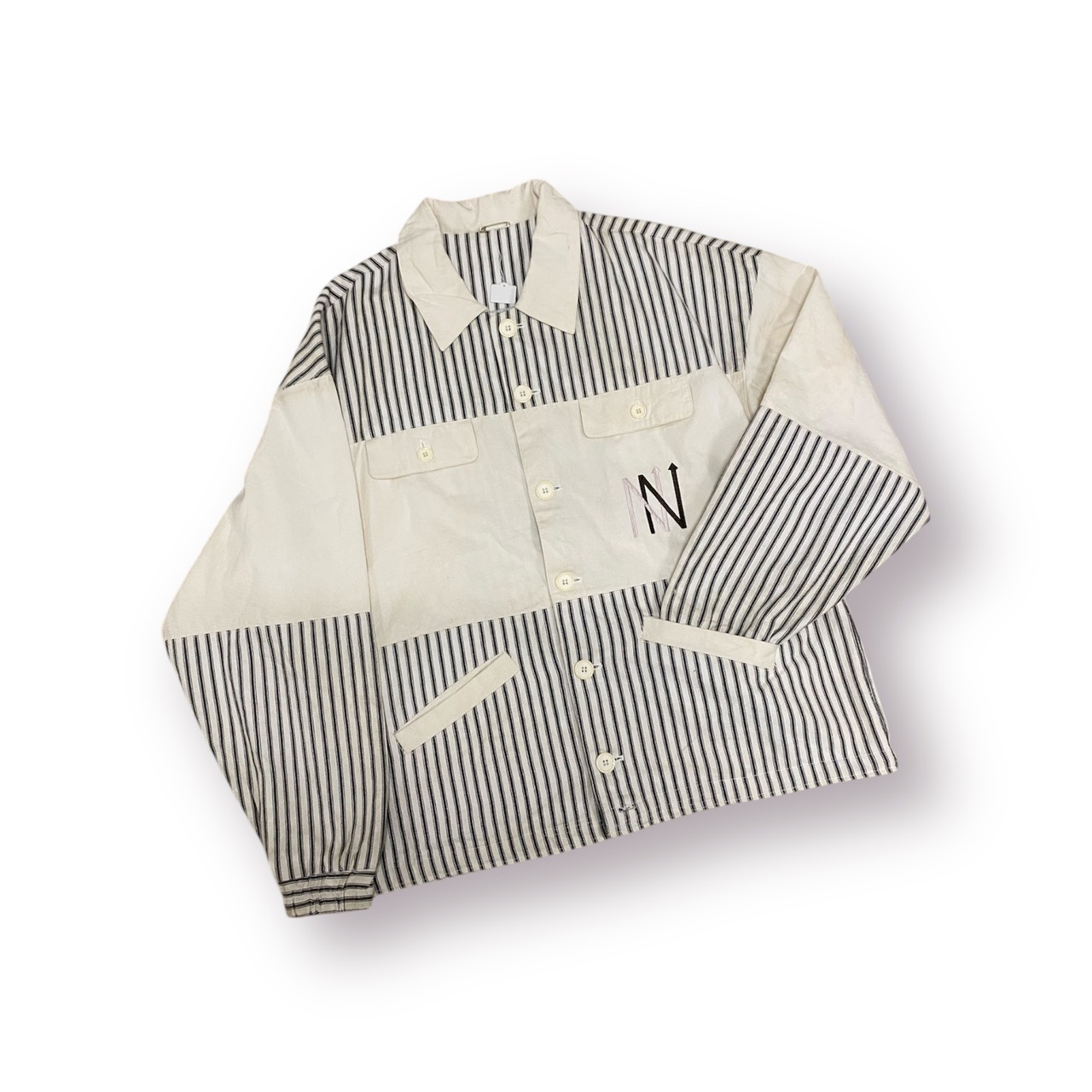ストライプ柄を採用するだけでかなりスタイリッシュな印象に。薄手のコットンなのでライトアウターとして丁度良いでしょう。