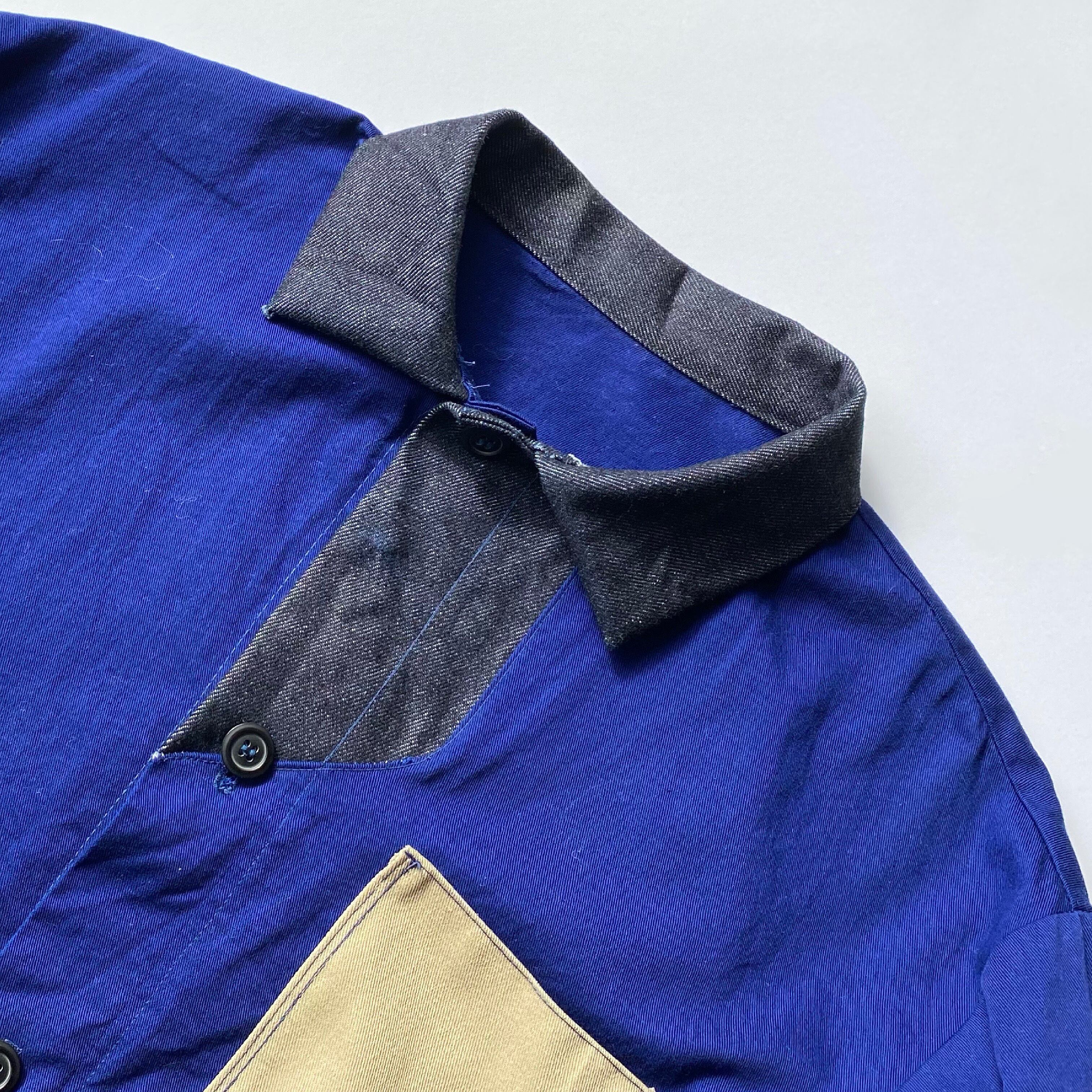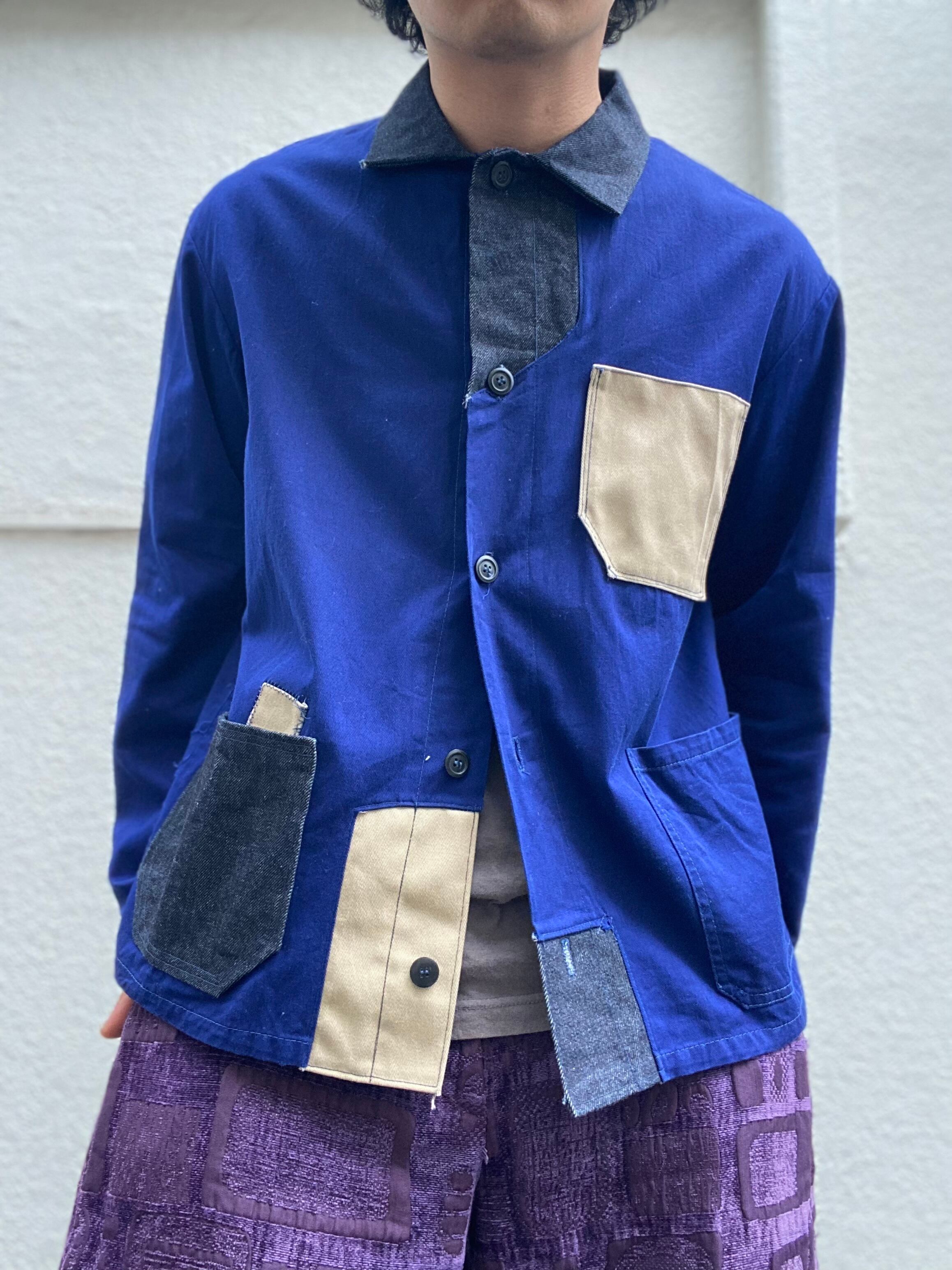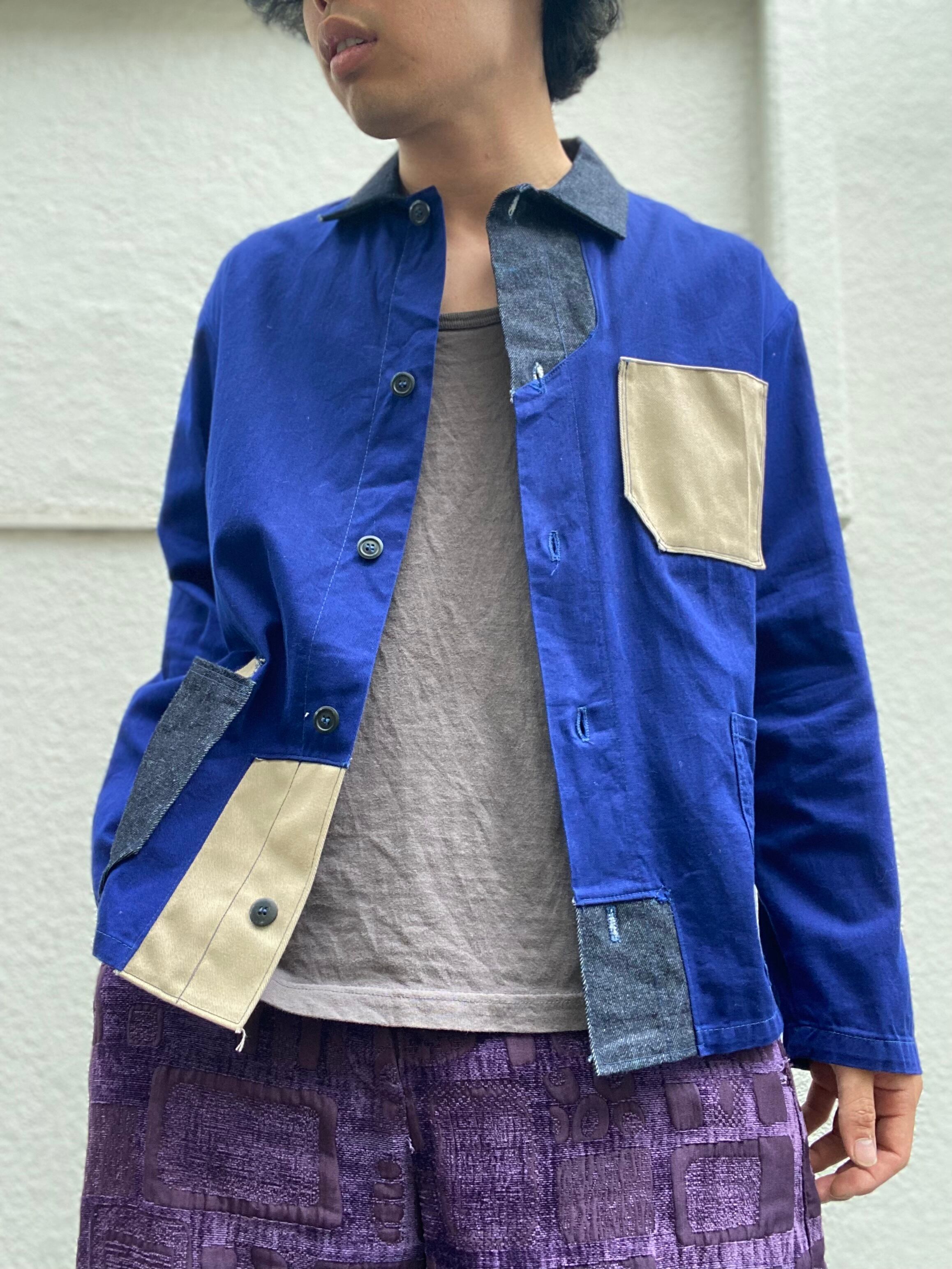 ボディはユーロジャケット、ブラック部分はジャパンビンテージのブラックデニム、ベージュ部分はアメリカのチノパン生地を使用したカルチャーMixのリメイクジャケット。