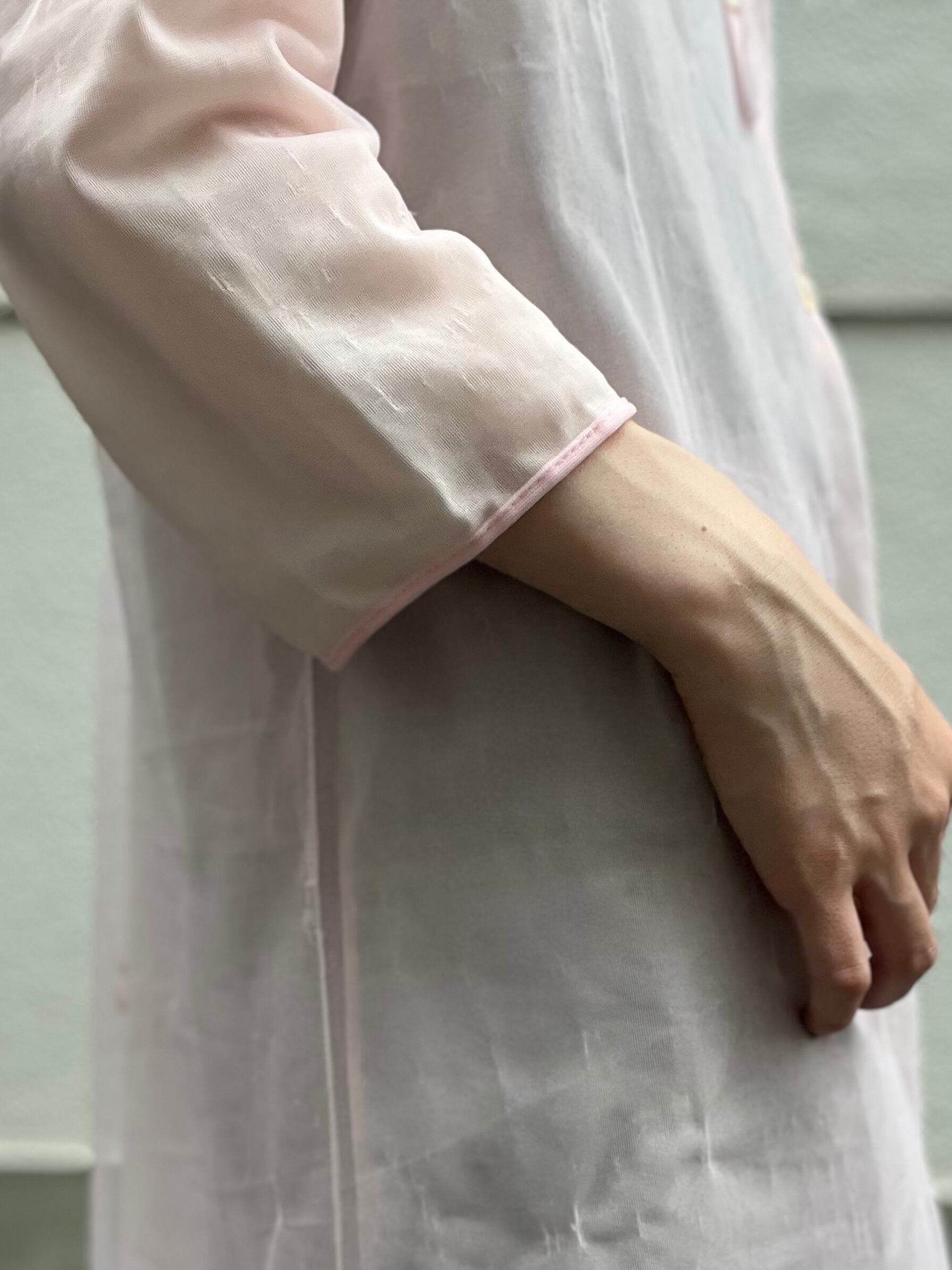 この一着の真価は、その「透け感」を通して、下に重ねるものの意味を劇的に変えてくれるところにあります。