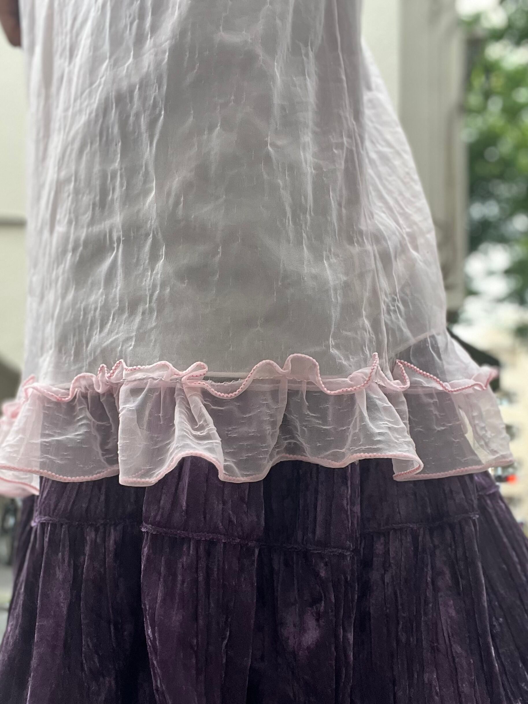 首元を優しく包み込む、過剰なまでに繊細なティアードフリル。胸元の小さなボタンとリボンが、この「眠れるドレス」を、確かな表現としての日常着へと繋ぎ止めています。