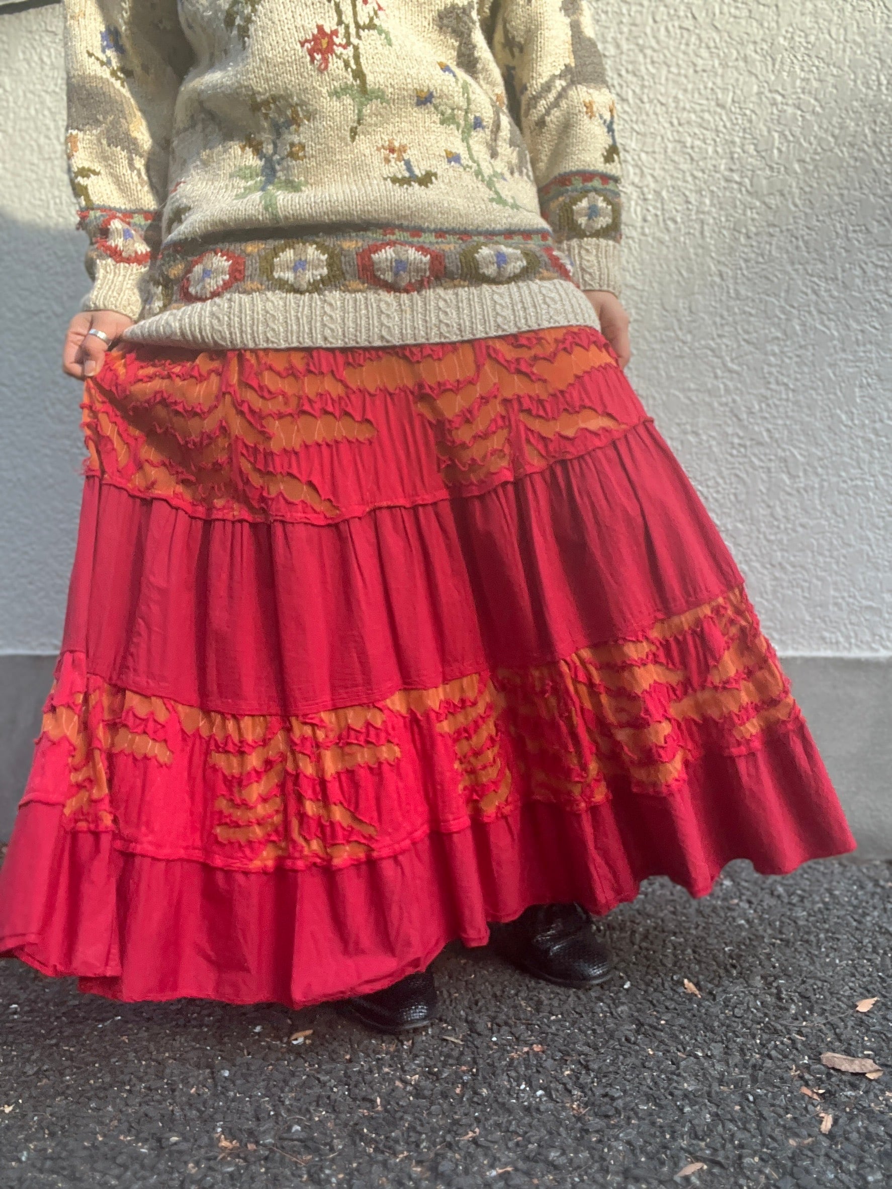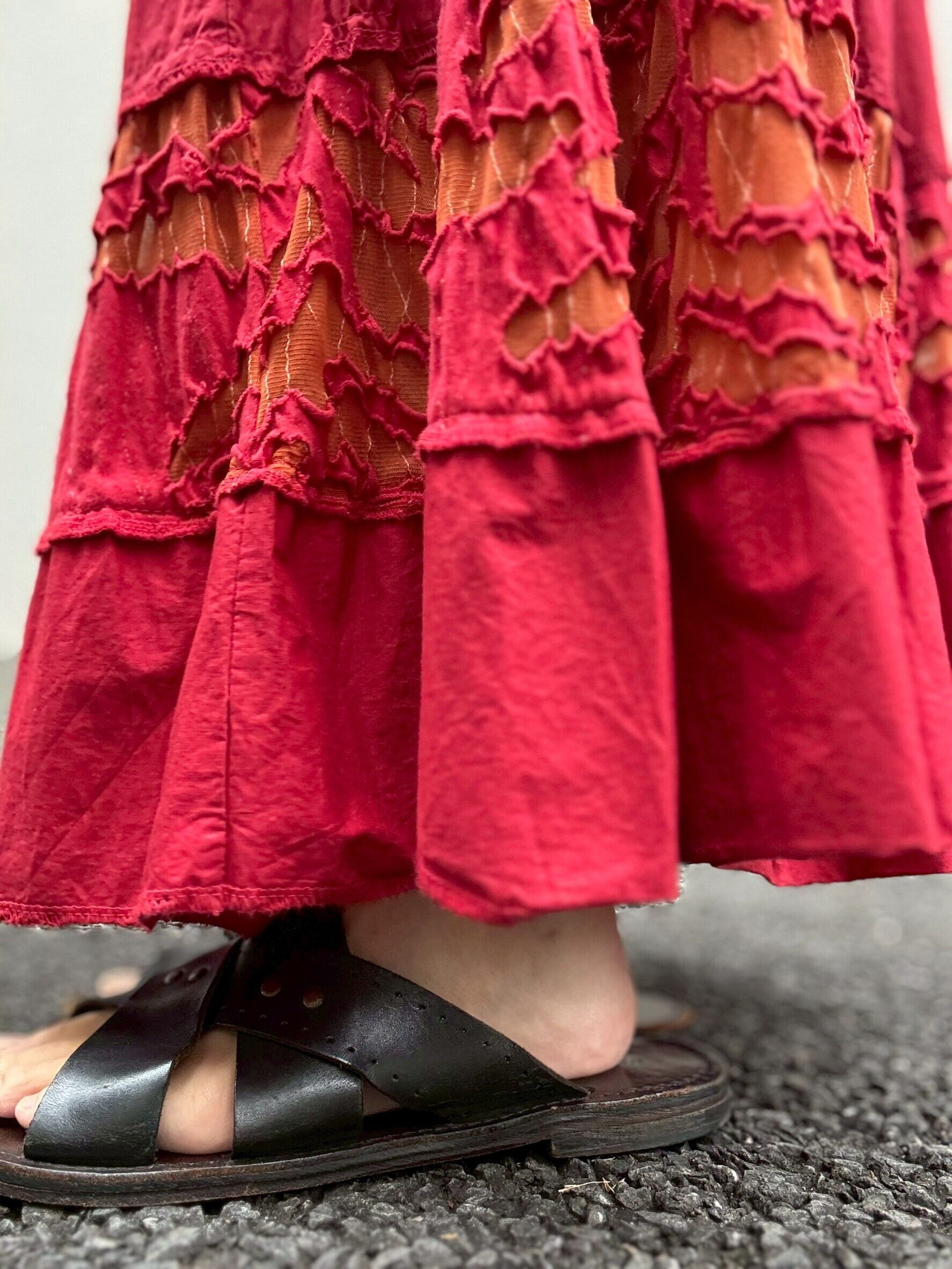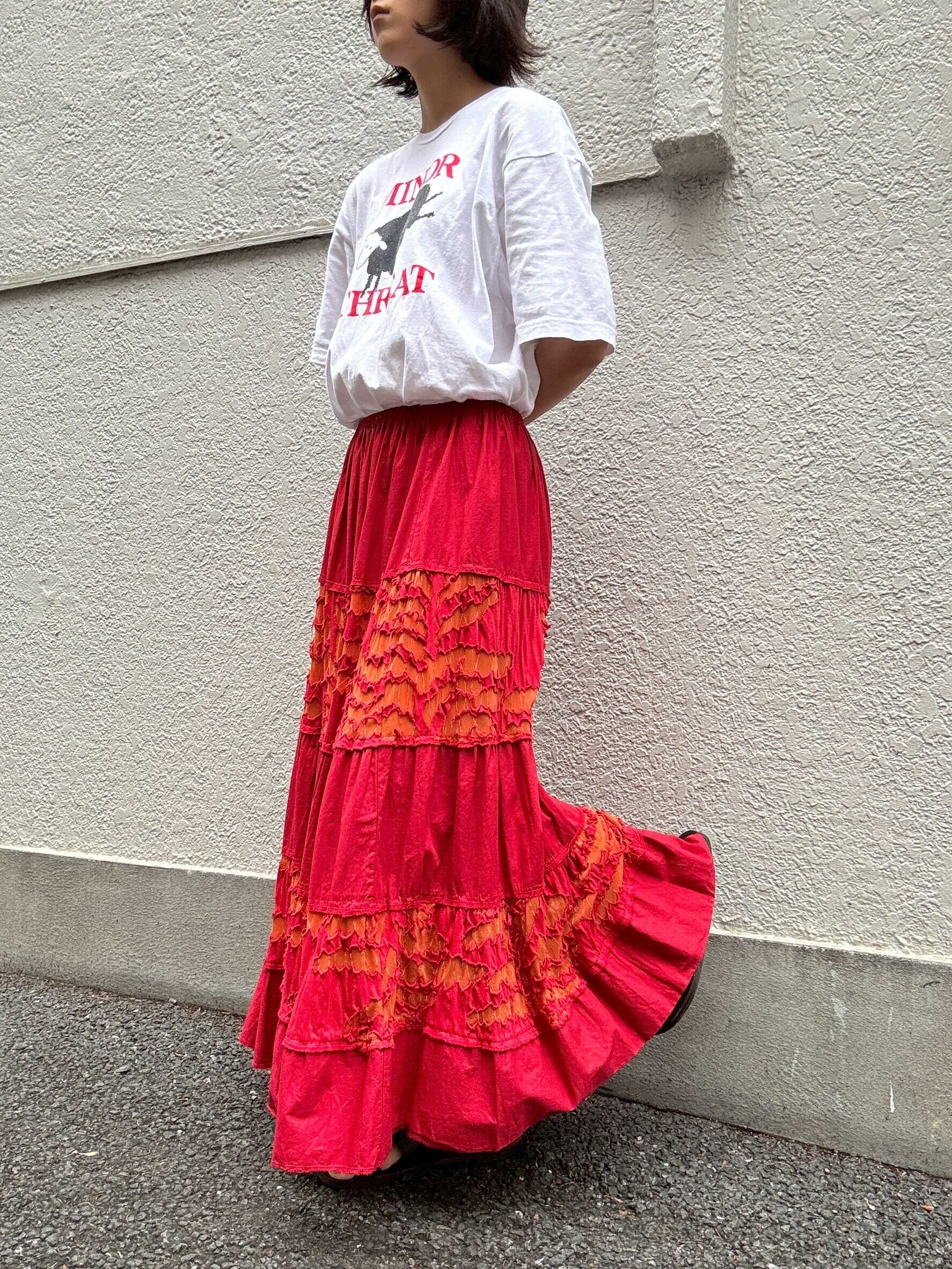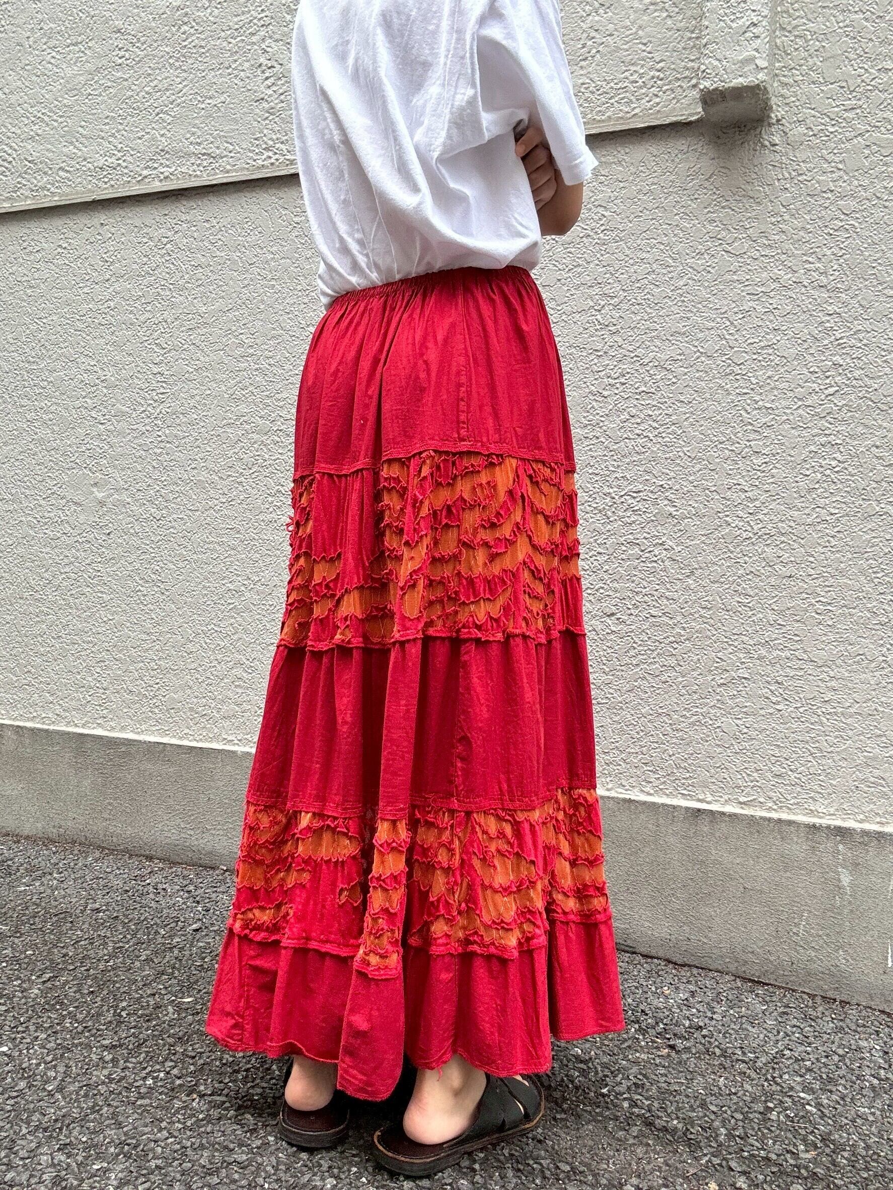 真っ赤なスカートに、オレンジのギャザーが縫い込まれた一本。