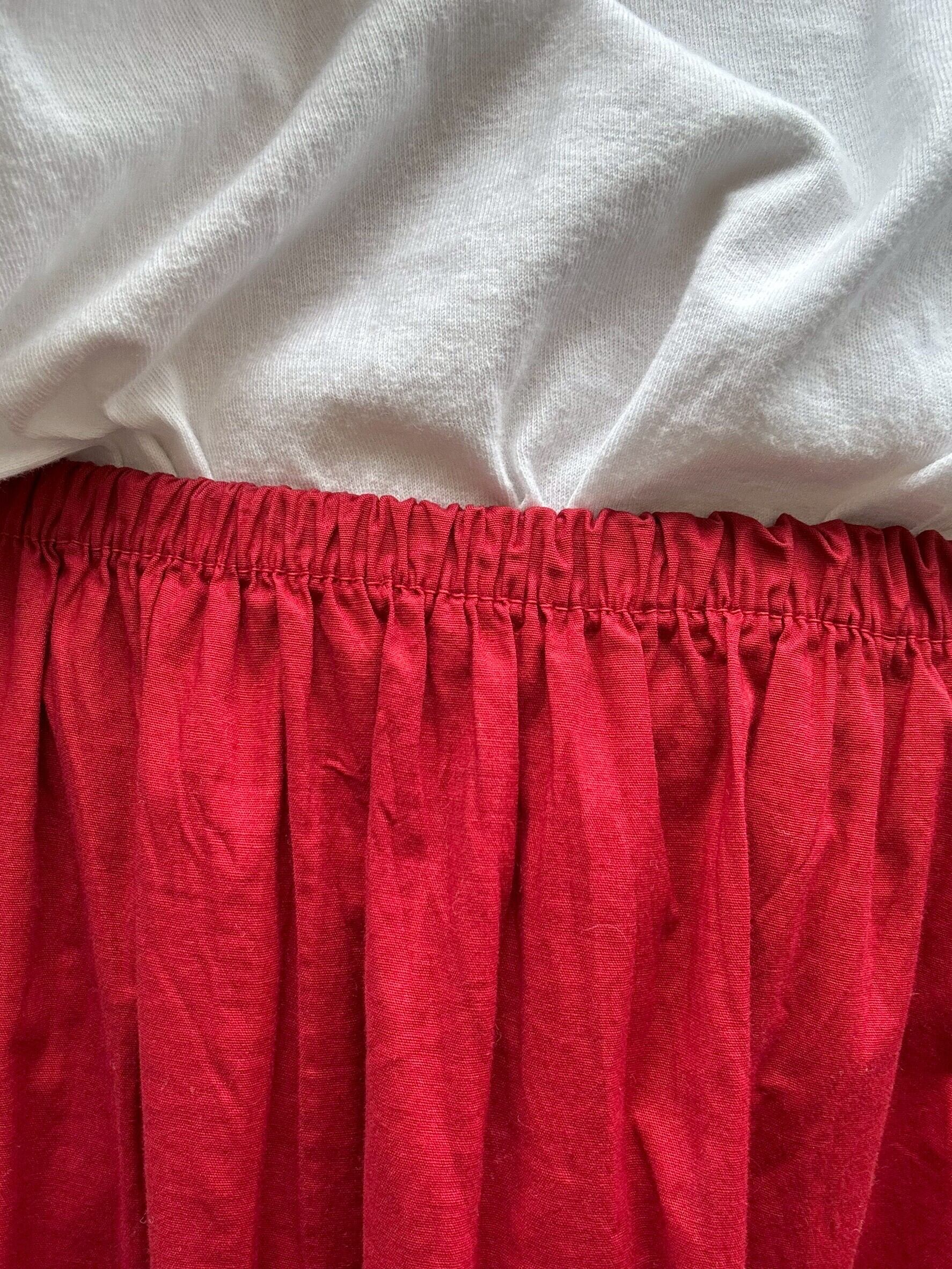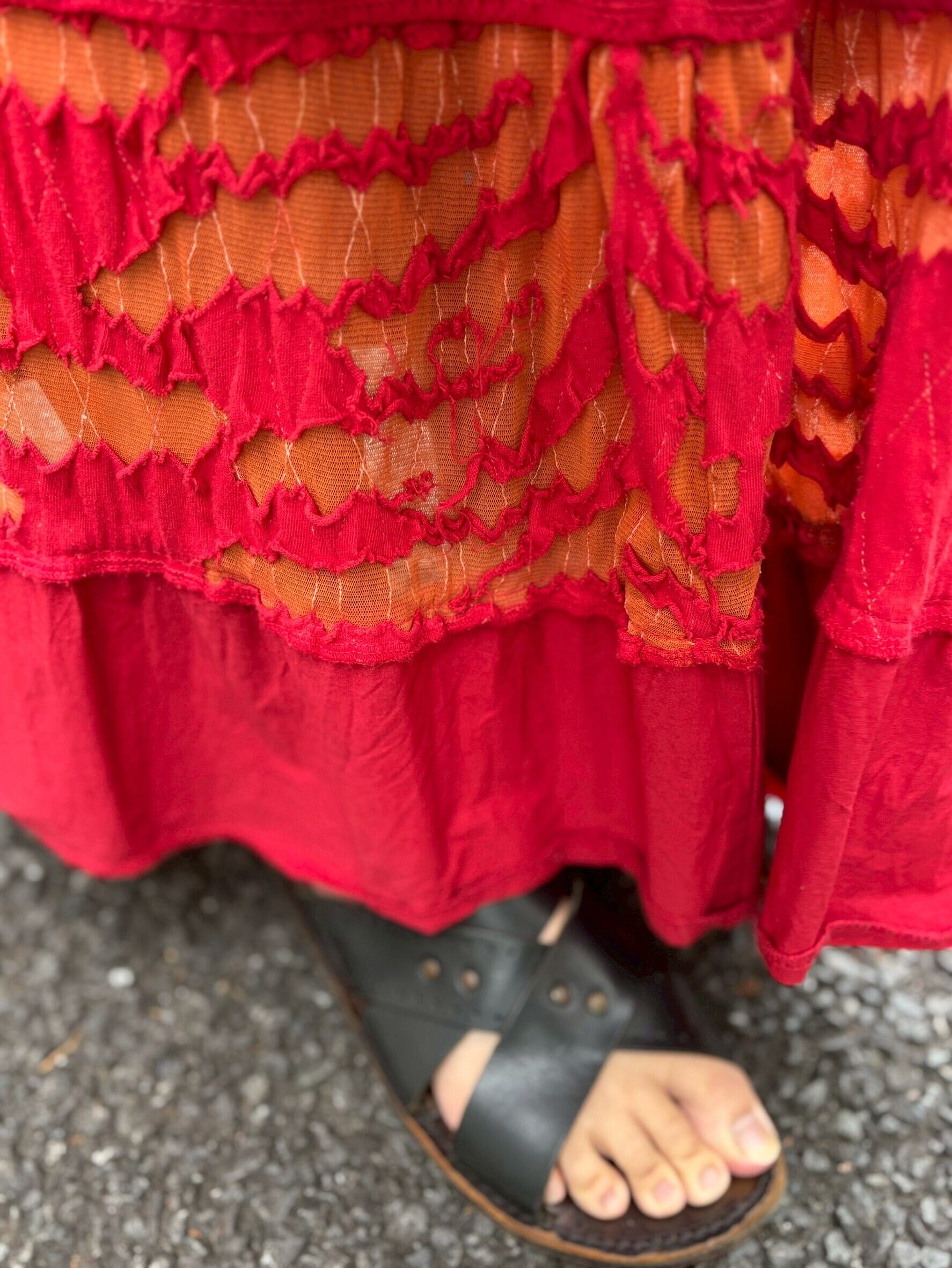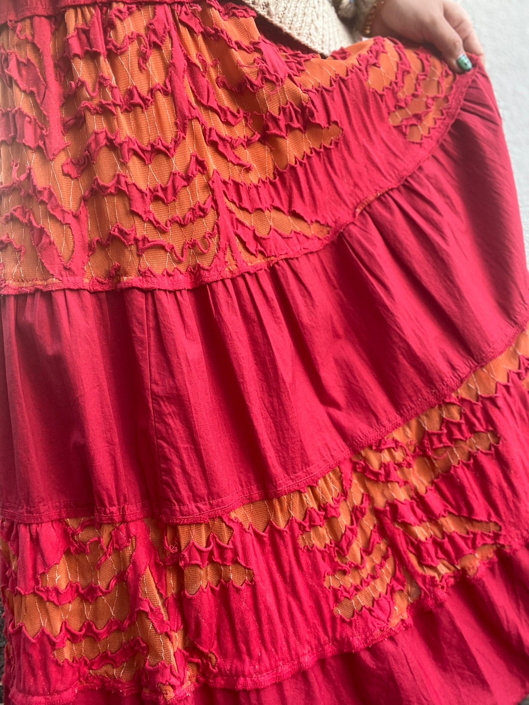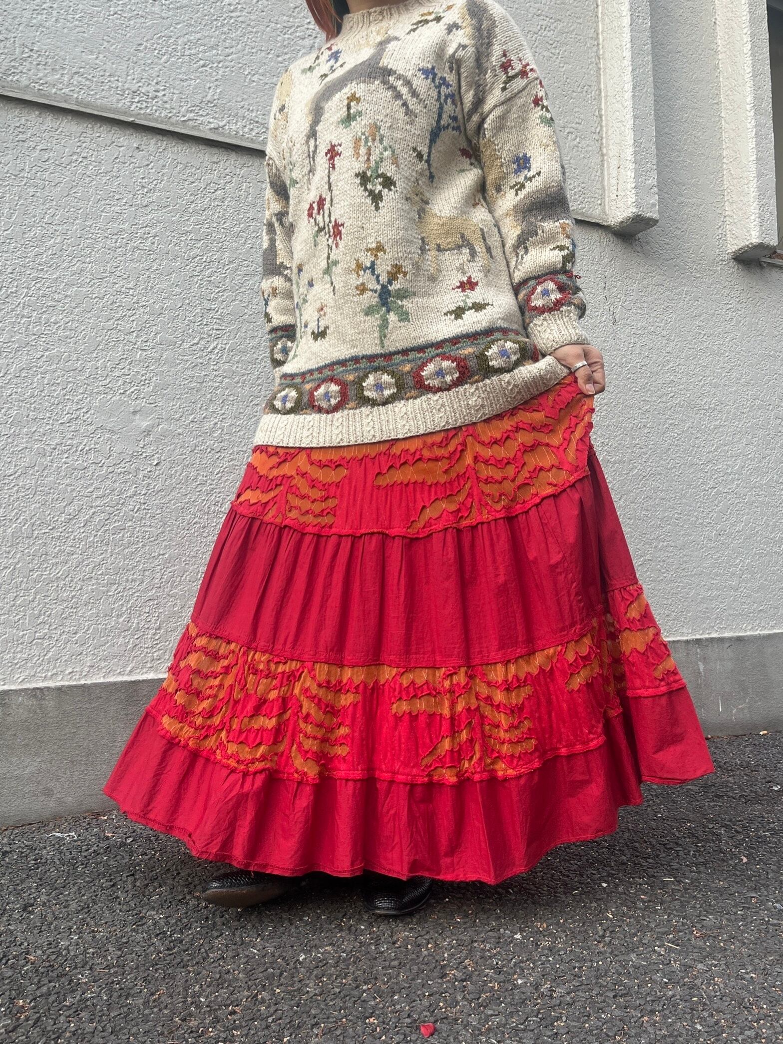 真っ赤なスカートに、オレンジのギャザーが縫い込まれた一本。