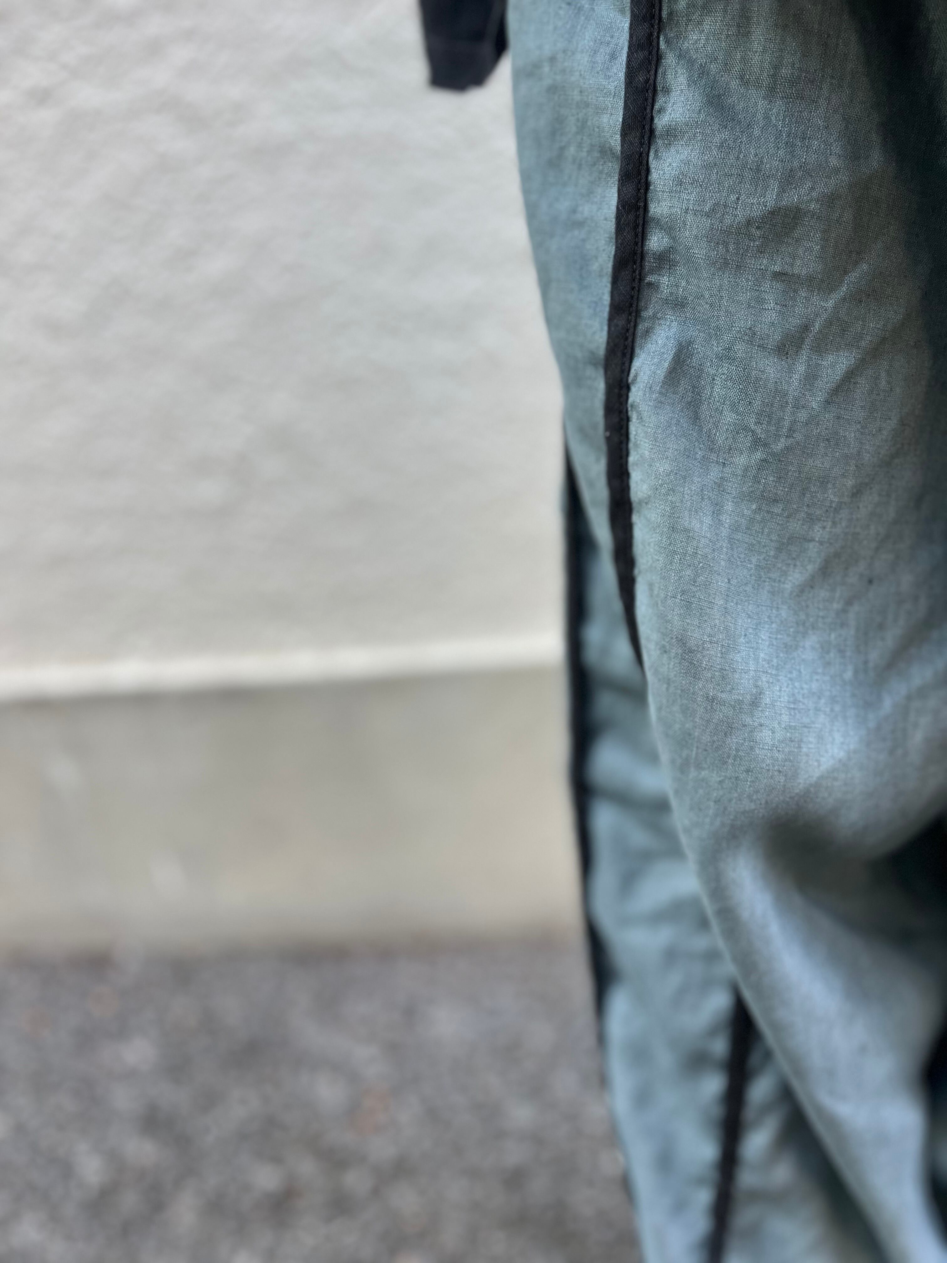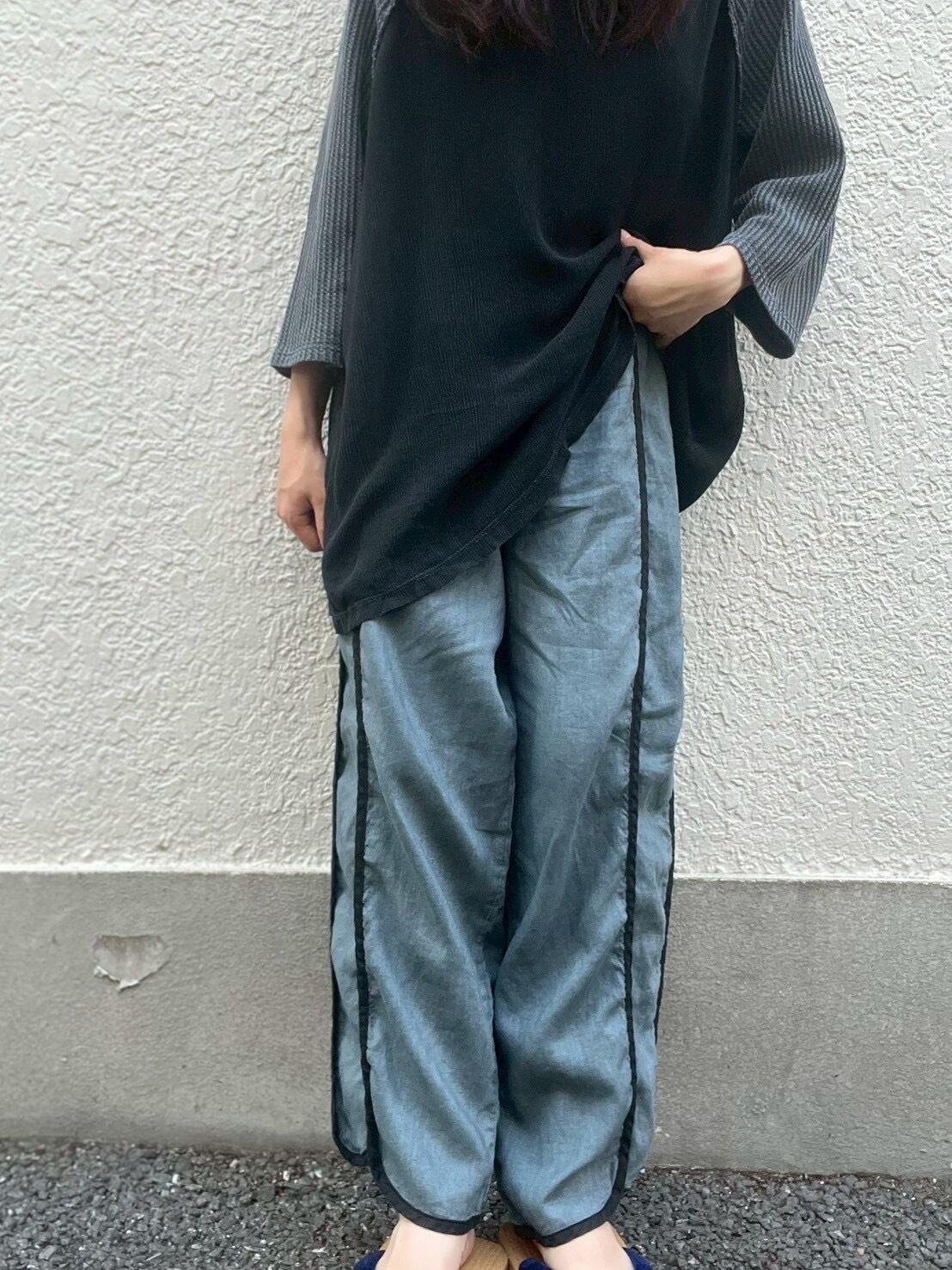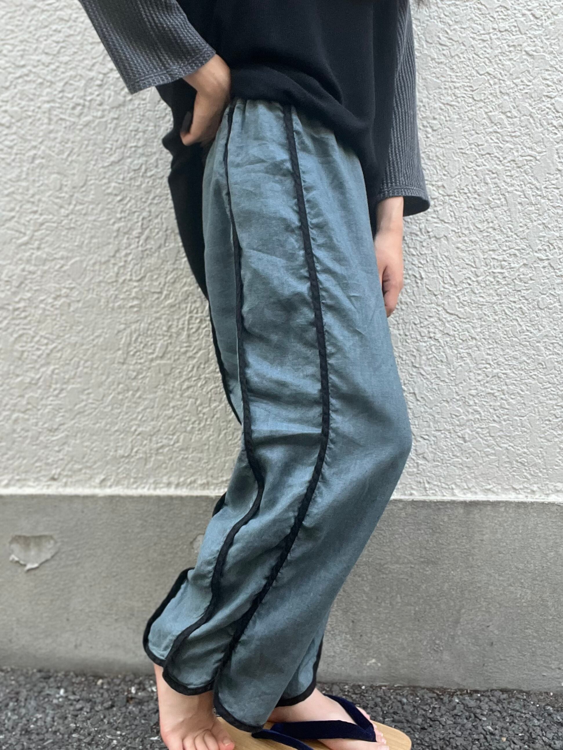 くたっとしたリネンパンツに、サイドラインでほんのりスポーティーな表情。