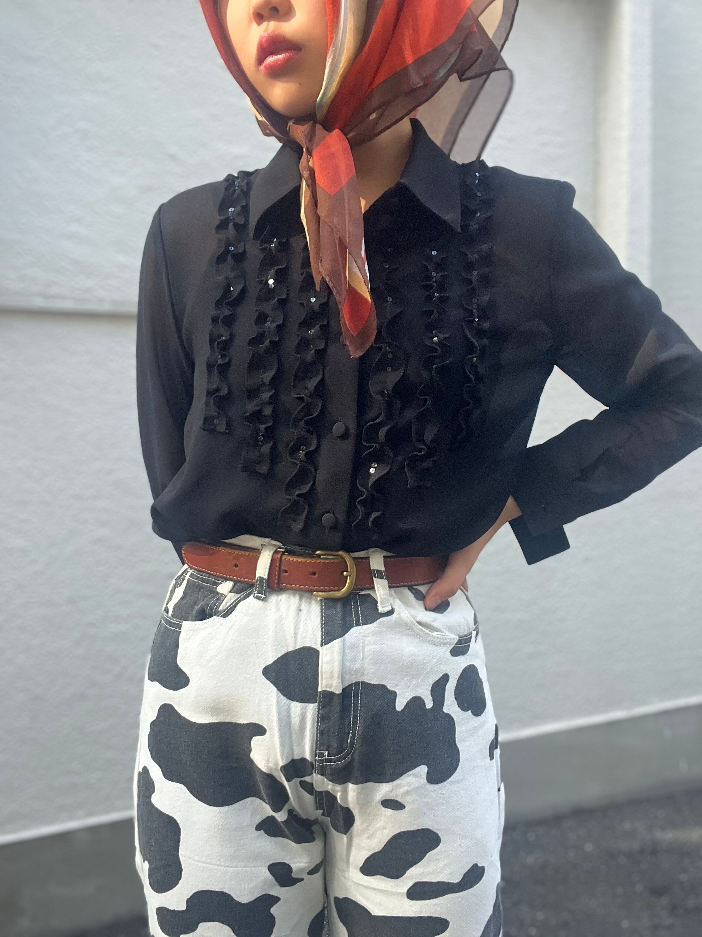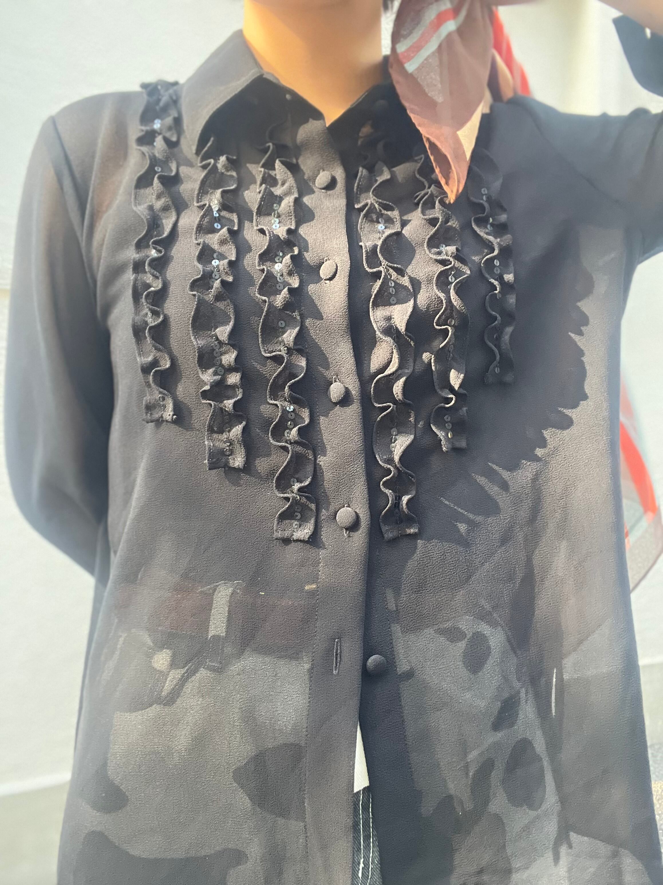 透け感のあるブラックシフォンをベースに、フリル+スパンコールの欲張りな組み合わせ。