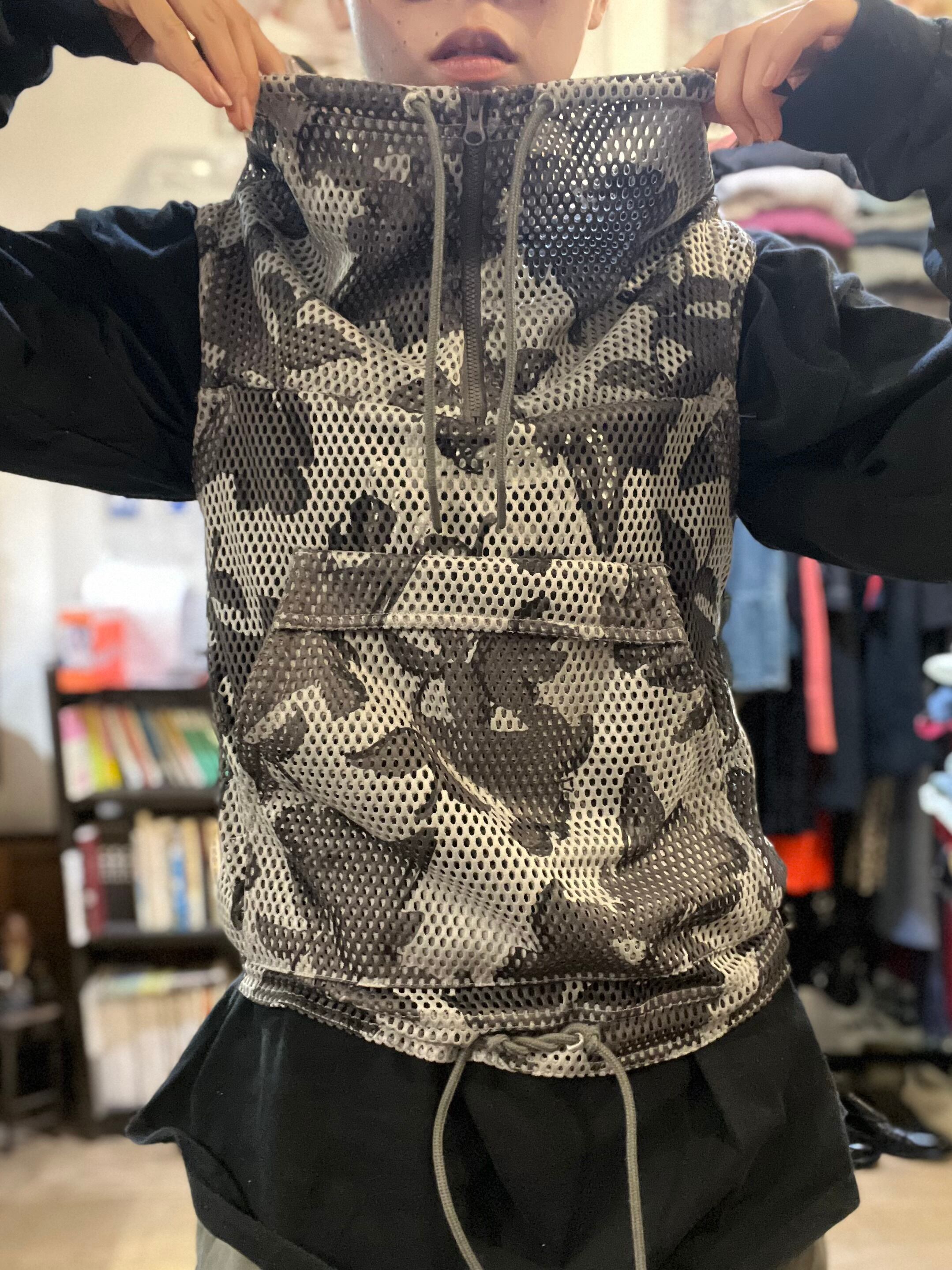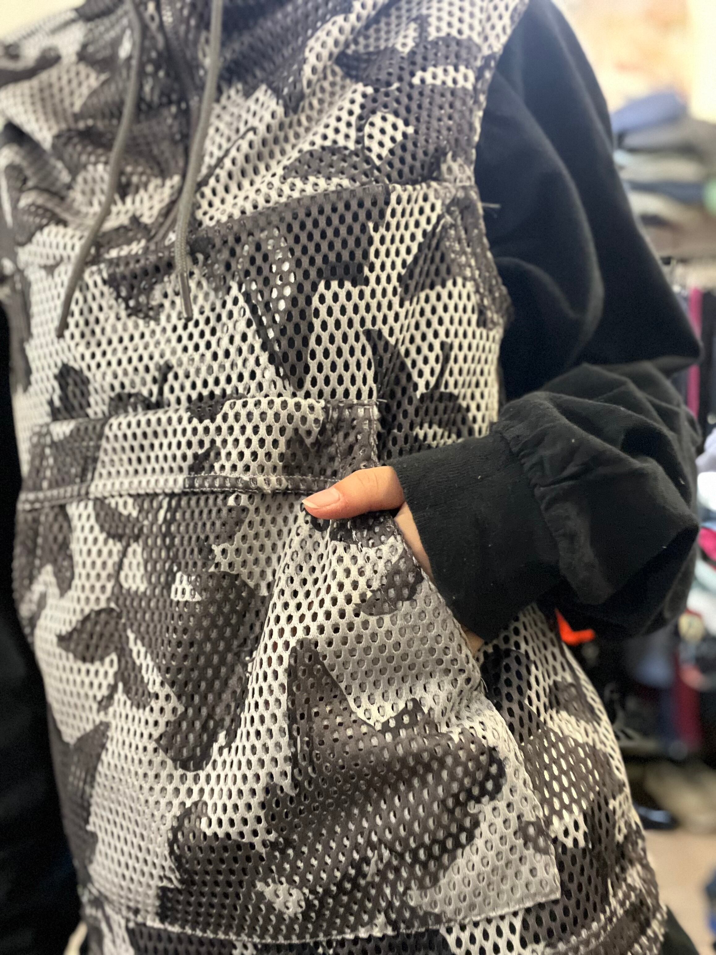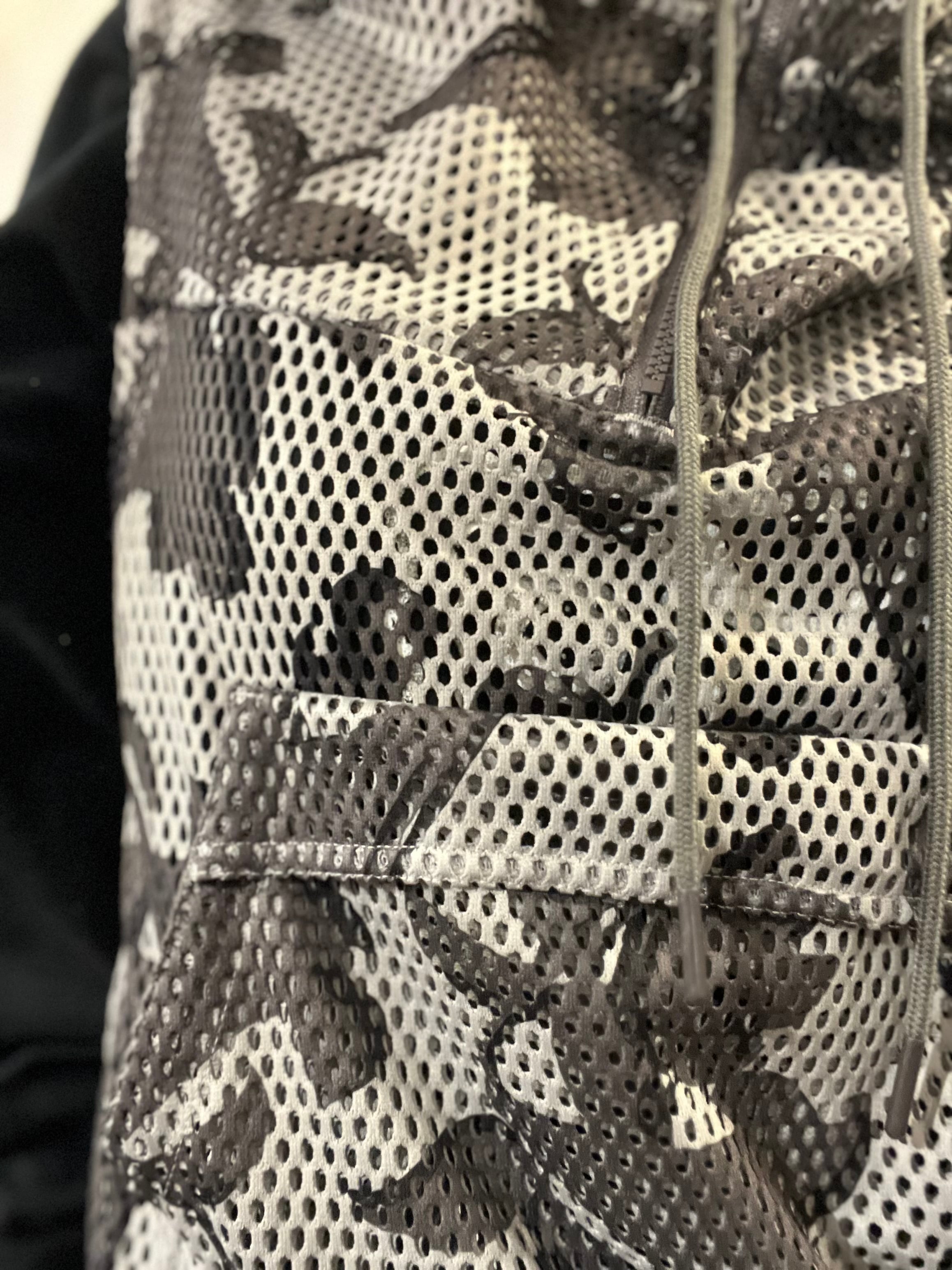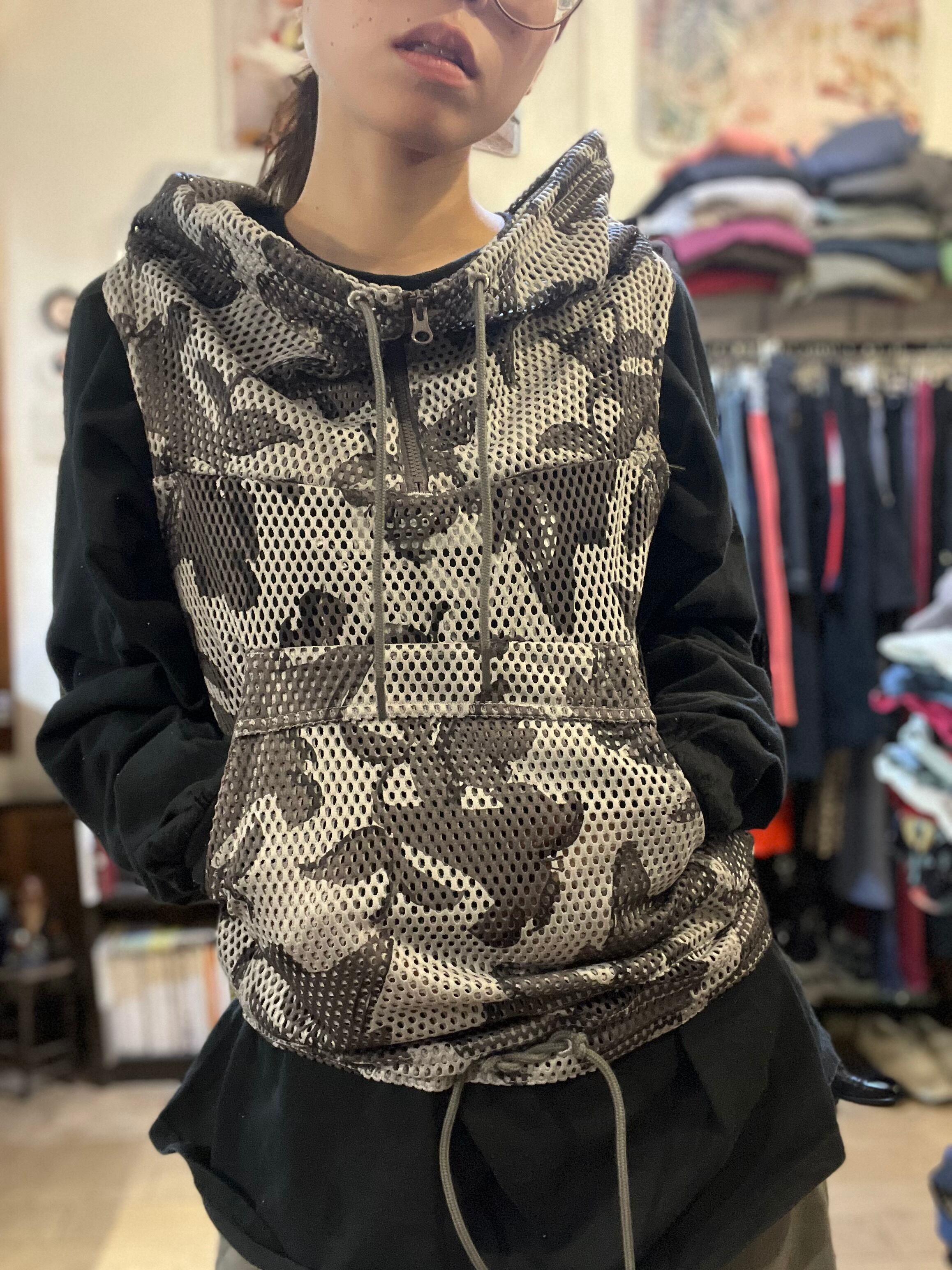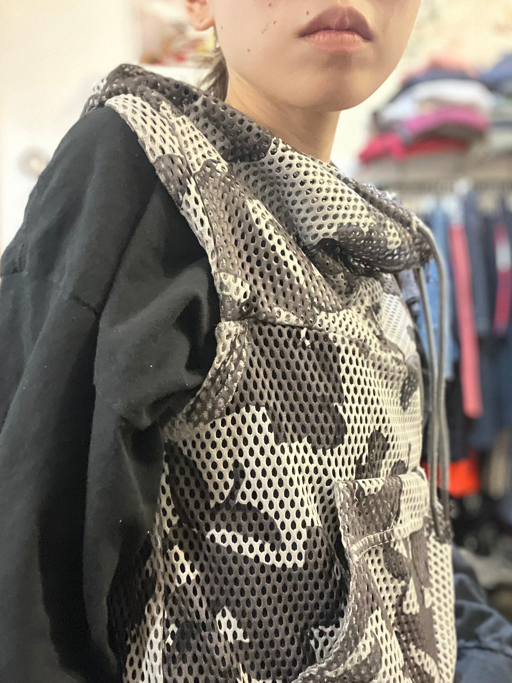 メッシュ越しにぼんやり浮かぶのはカモフラのようで実は花柄。
