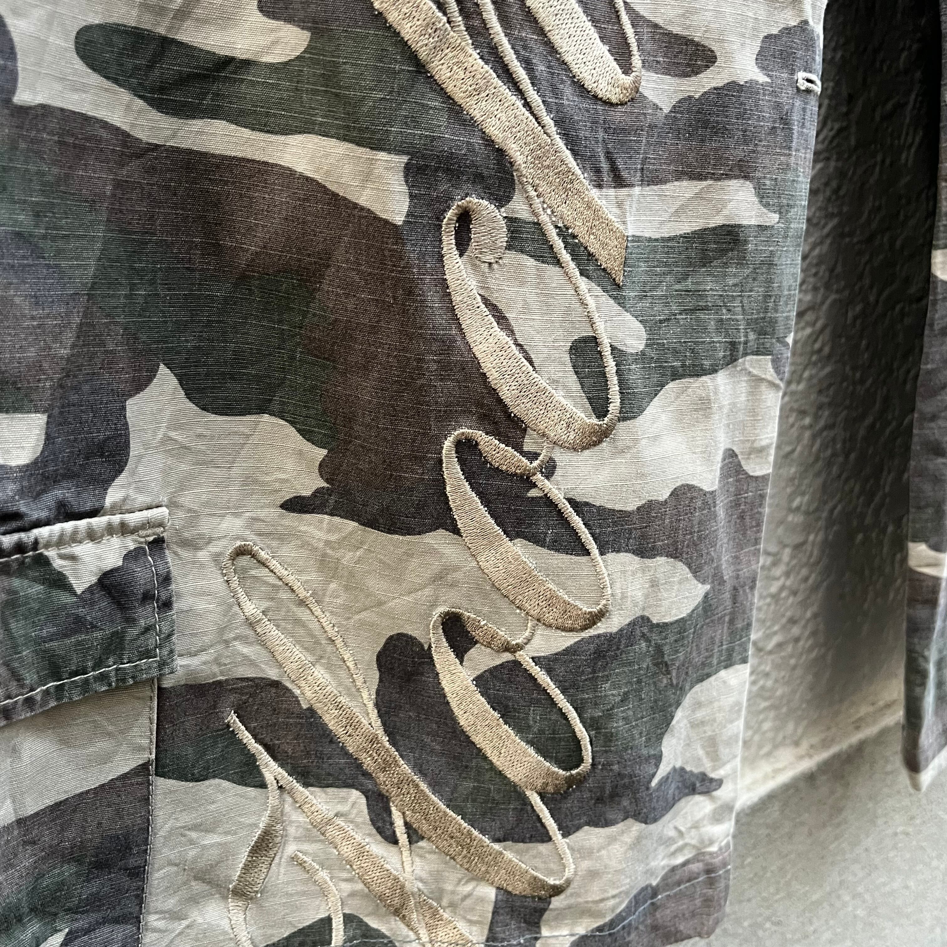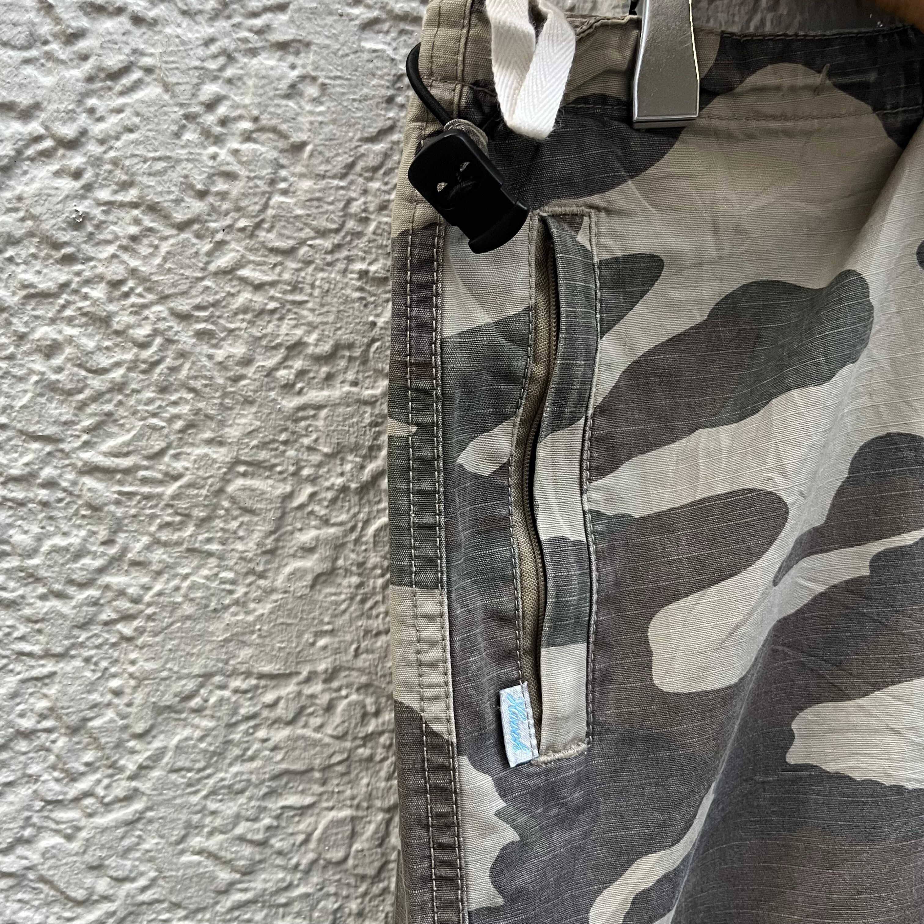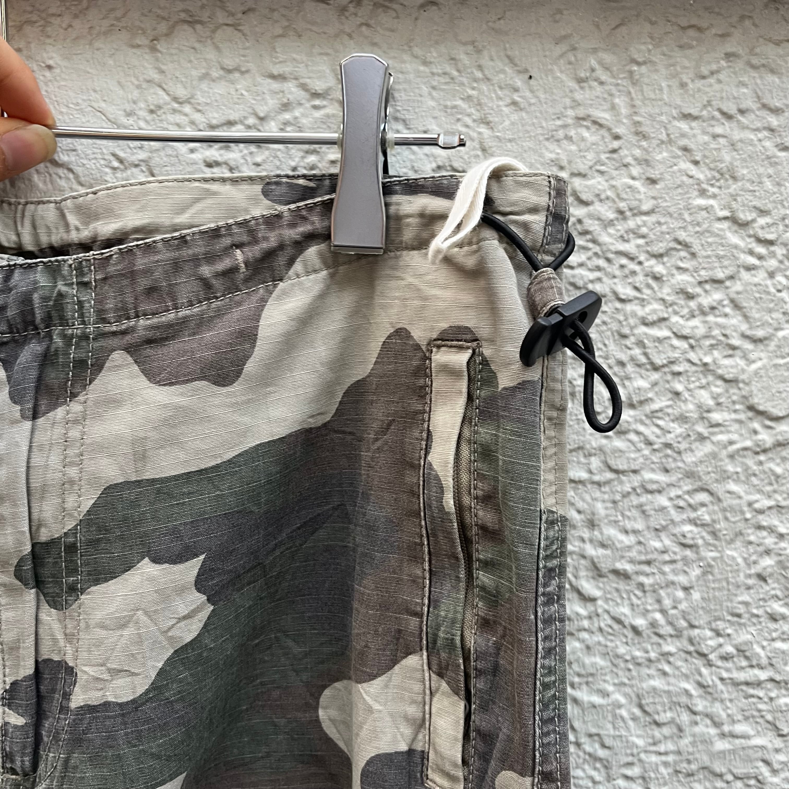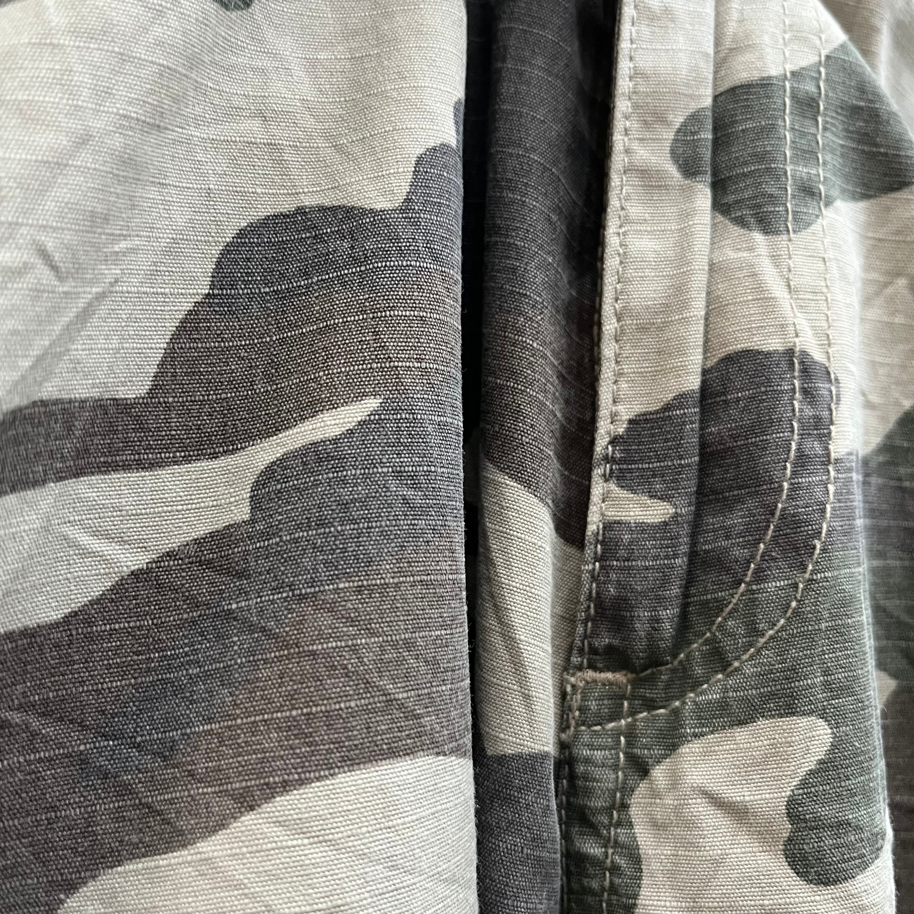 本来は景色に溶け込むための「迷彩」という柄。使い込まれてクタクタになったコットンの風合い。リップストップからも安心感を与えてくれます。