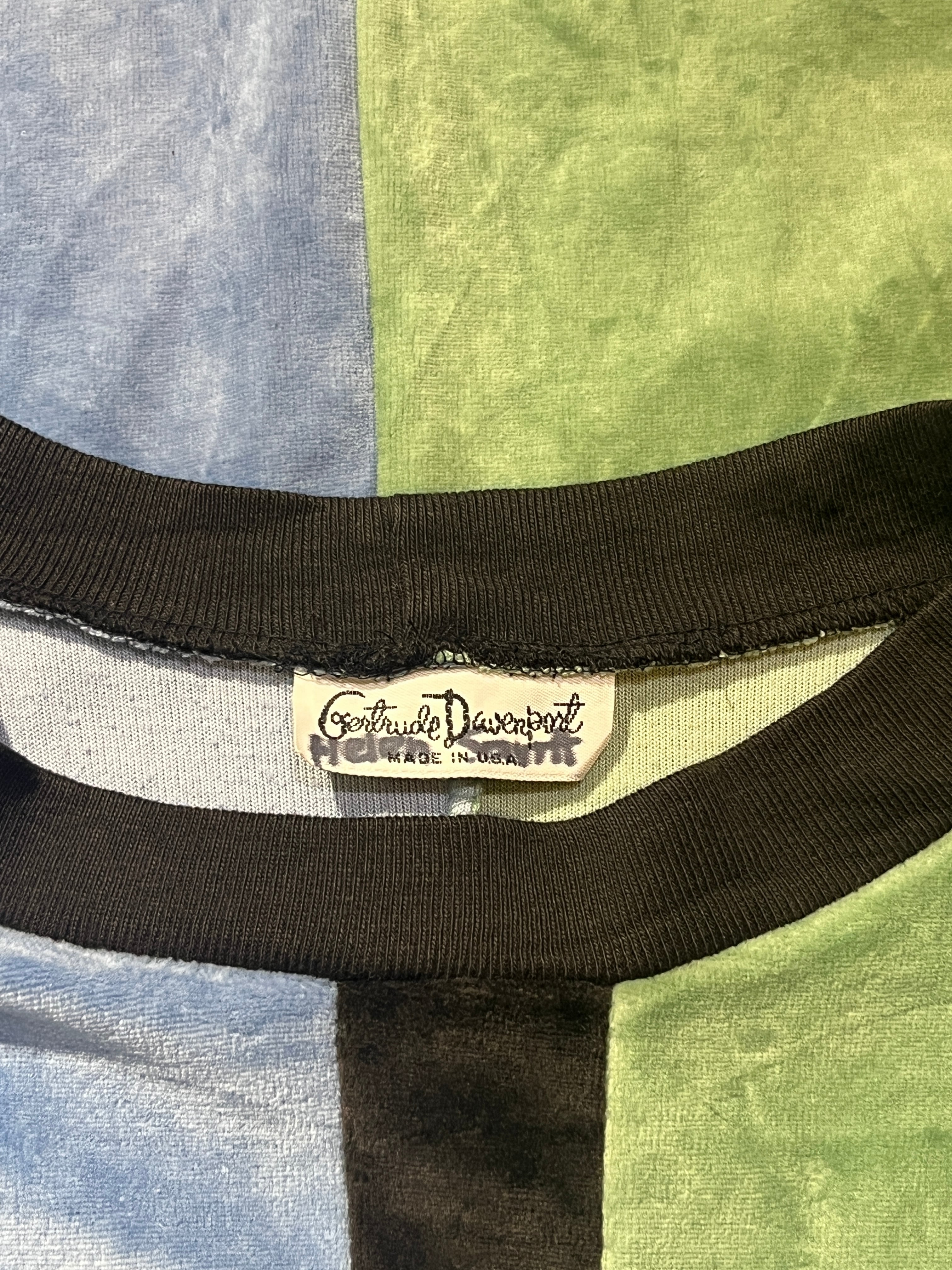ブルーとグリーンのベロア生地を切り替えたロンT。