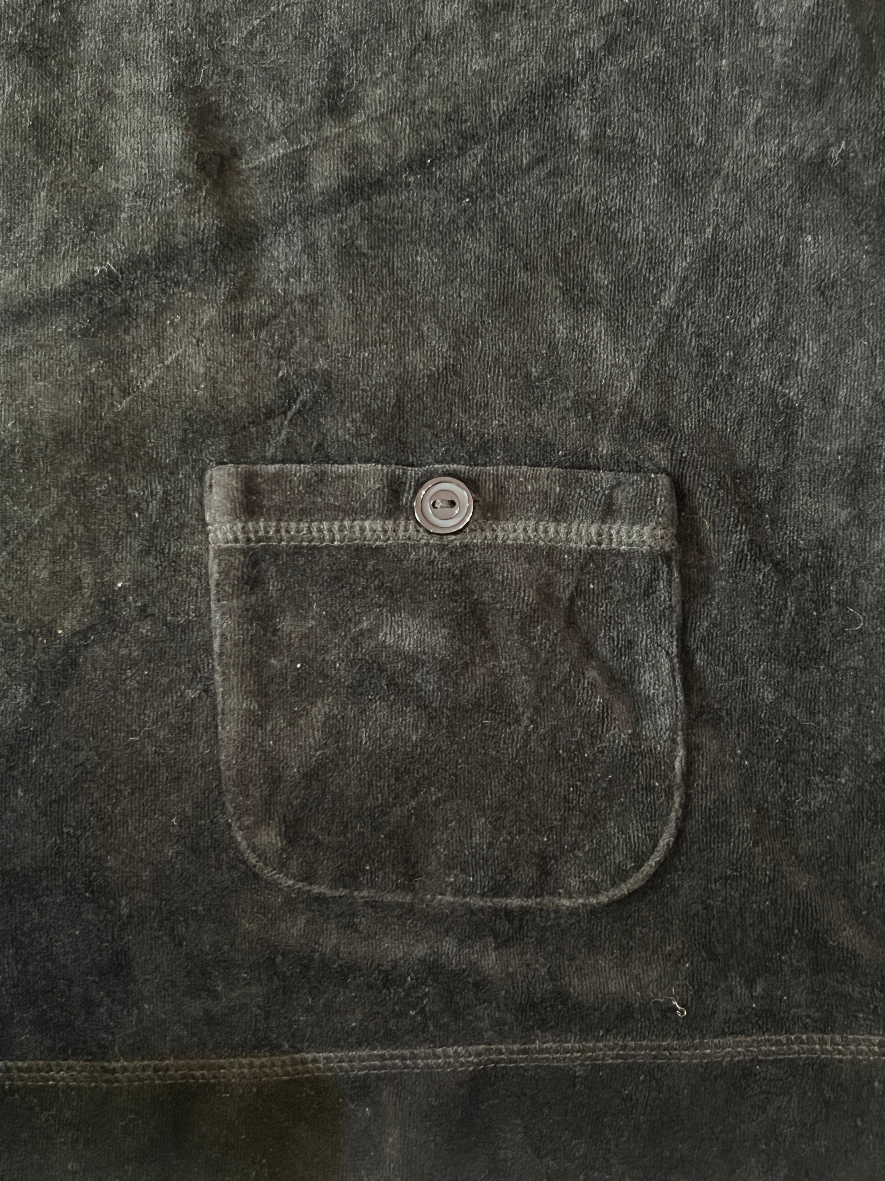裾あたりにひとつだけ付いたワンポケットが妙に気になるポイント。落ち着いた光沢で、ゆるっと着てもどこか品がある一着。