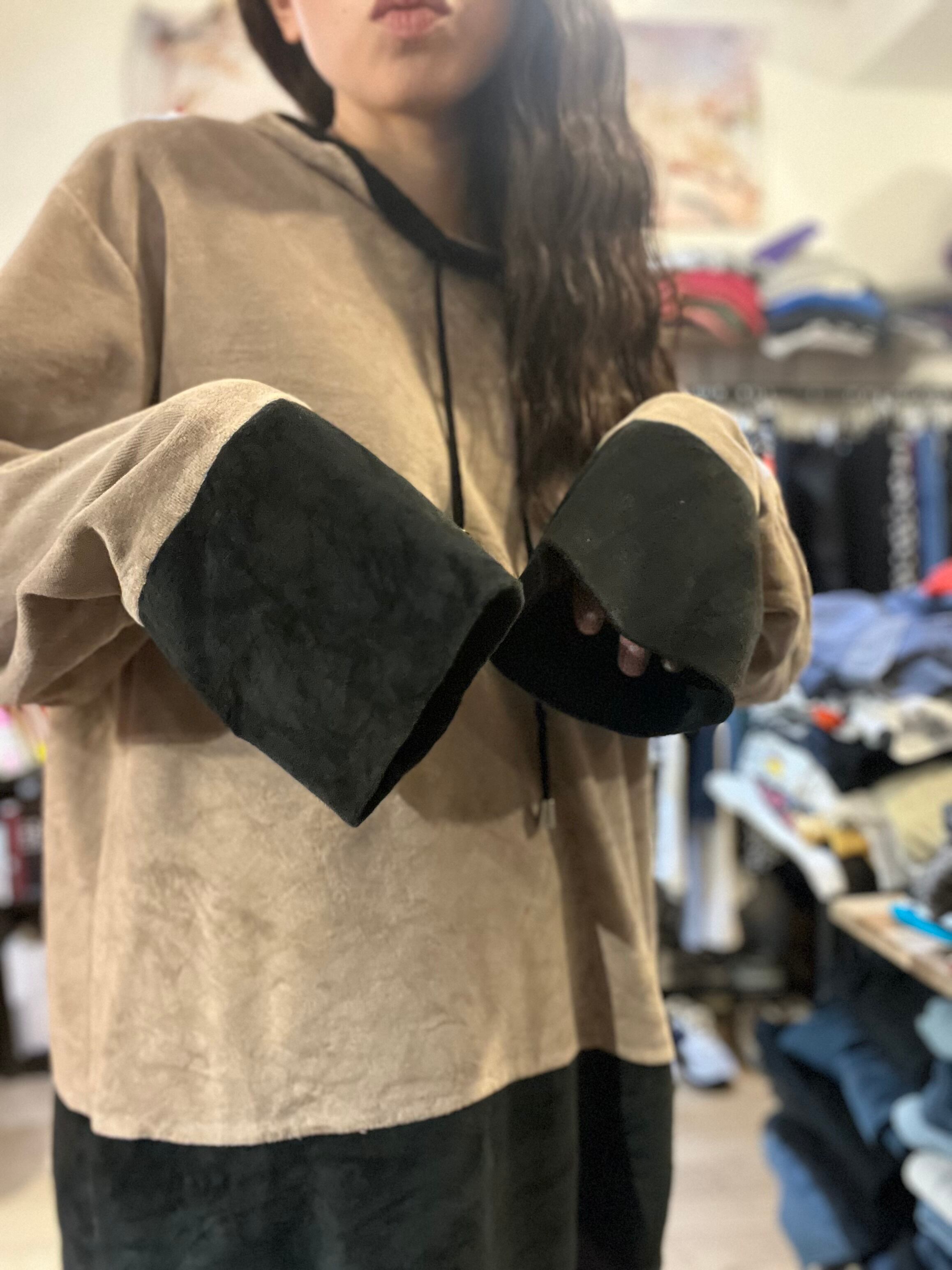 くすんだベージュと、墨黒のコントラストが絶妙なベロアプルオーバー。