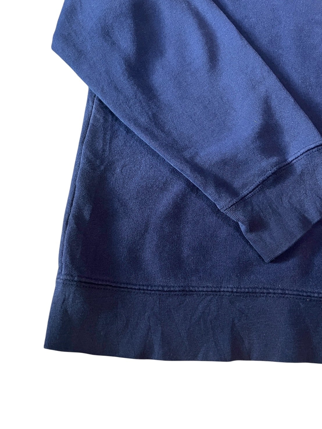褪せたネイビーボディに犬刺繍が施されたスウェット。