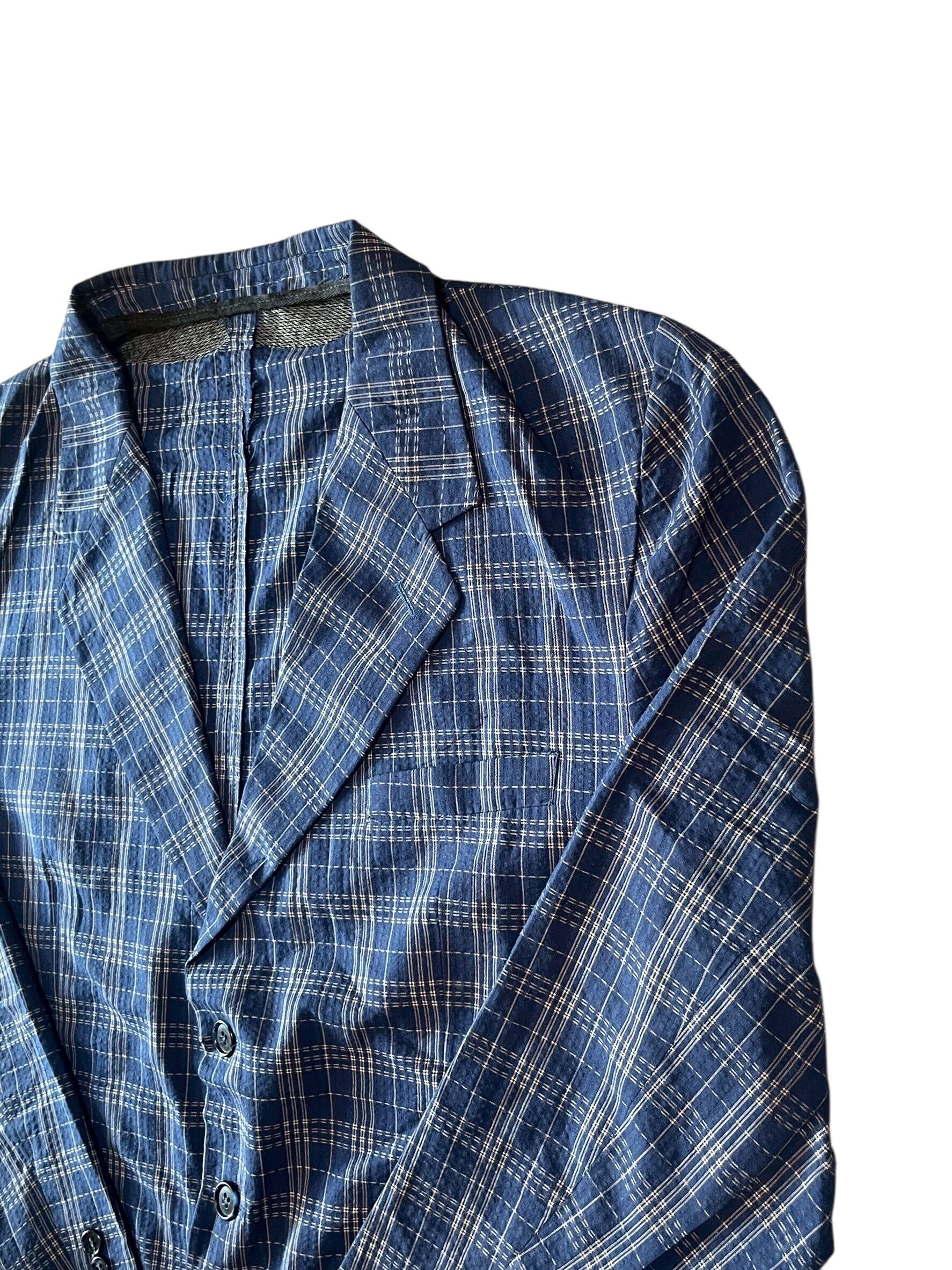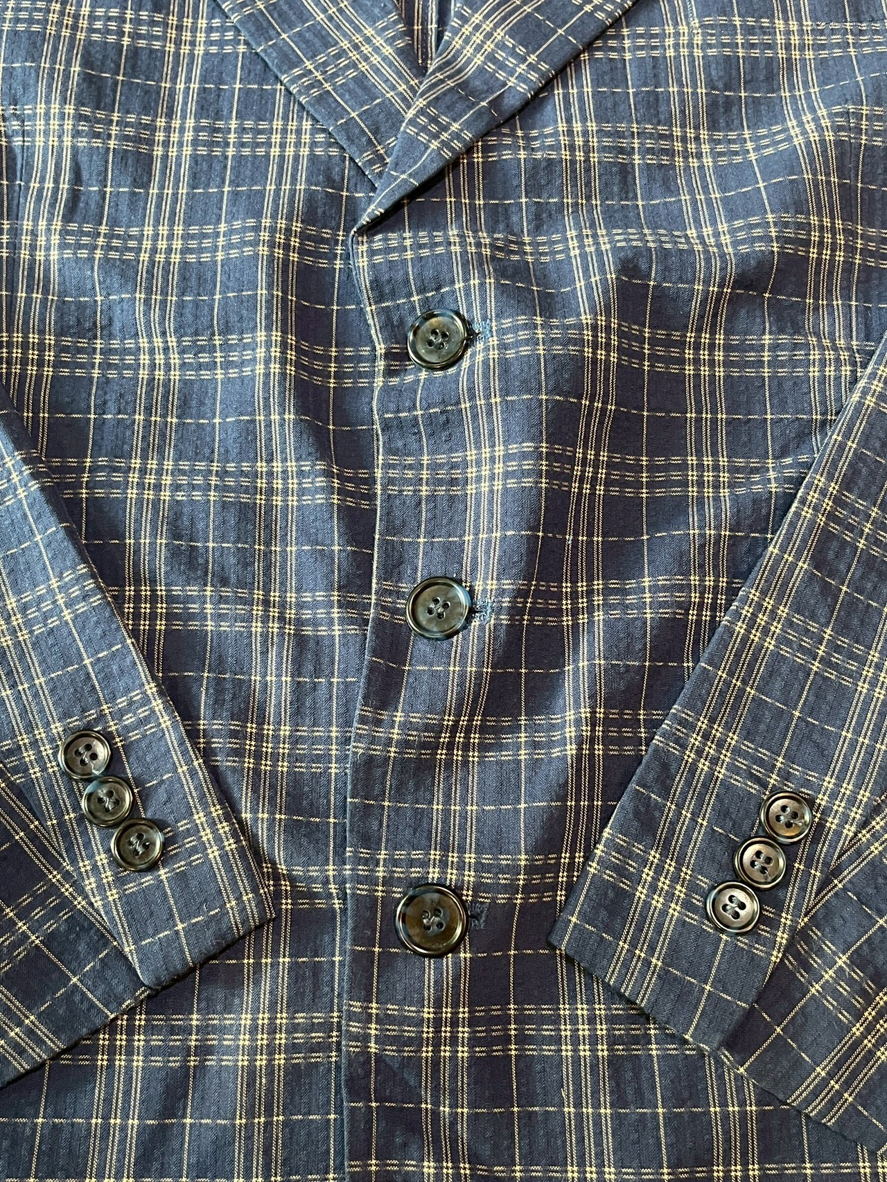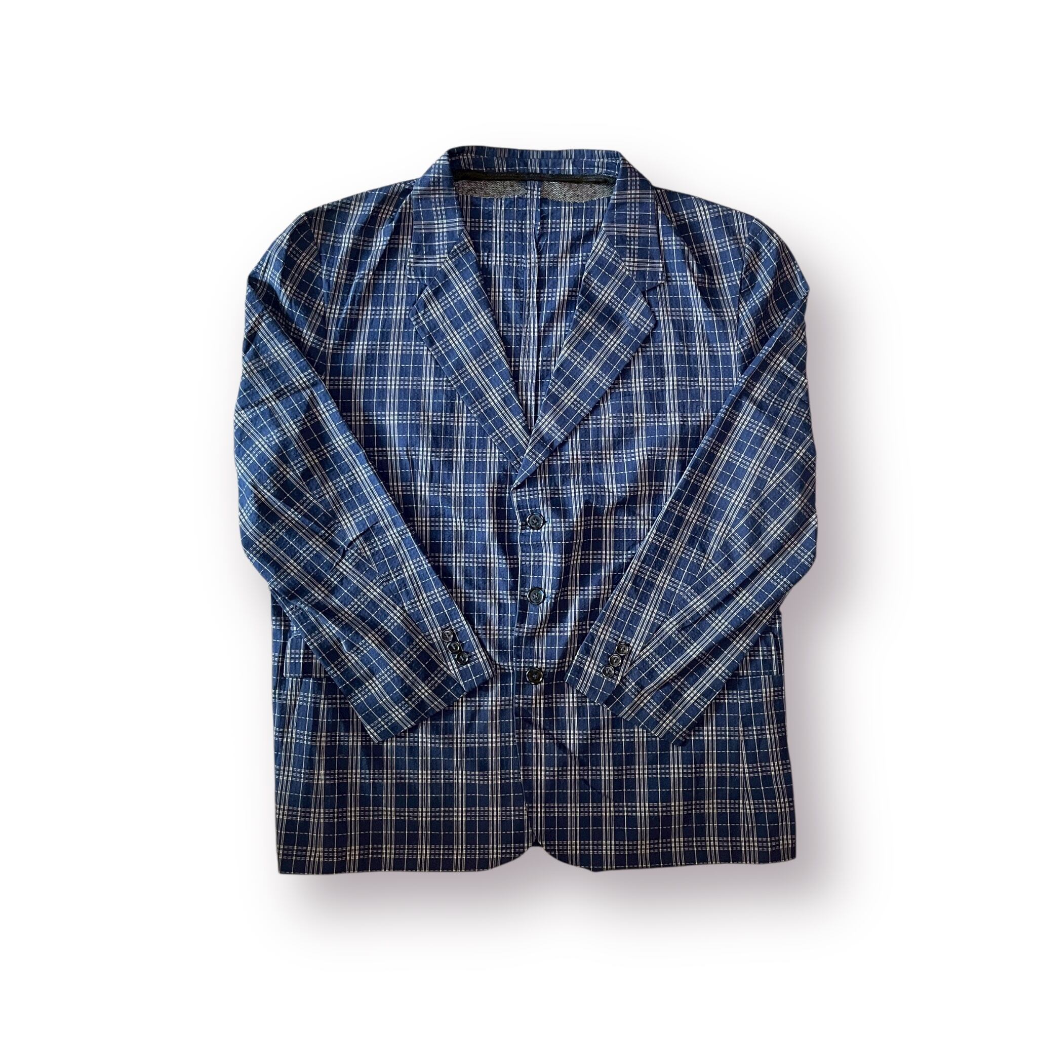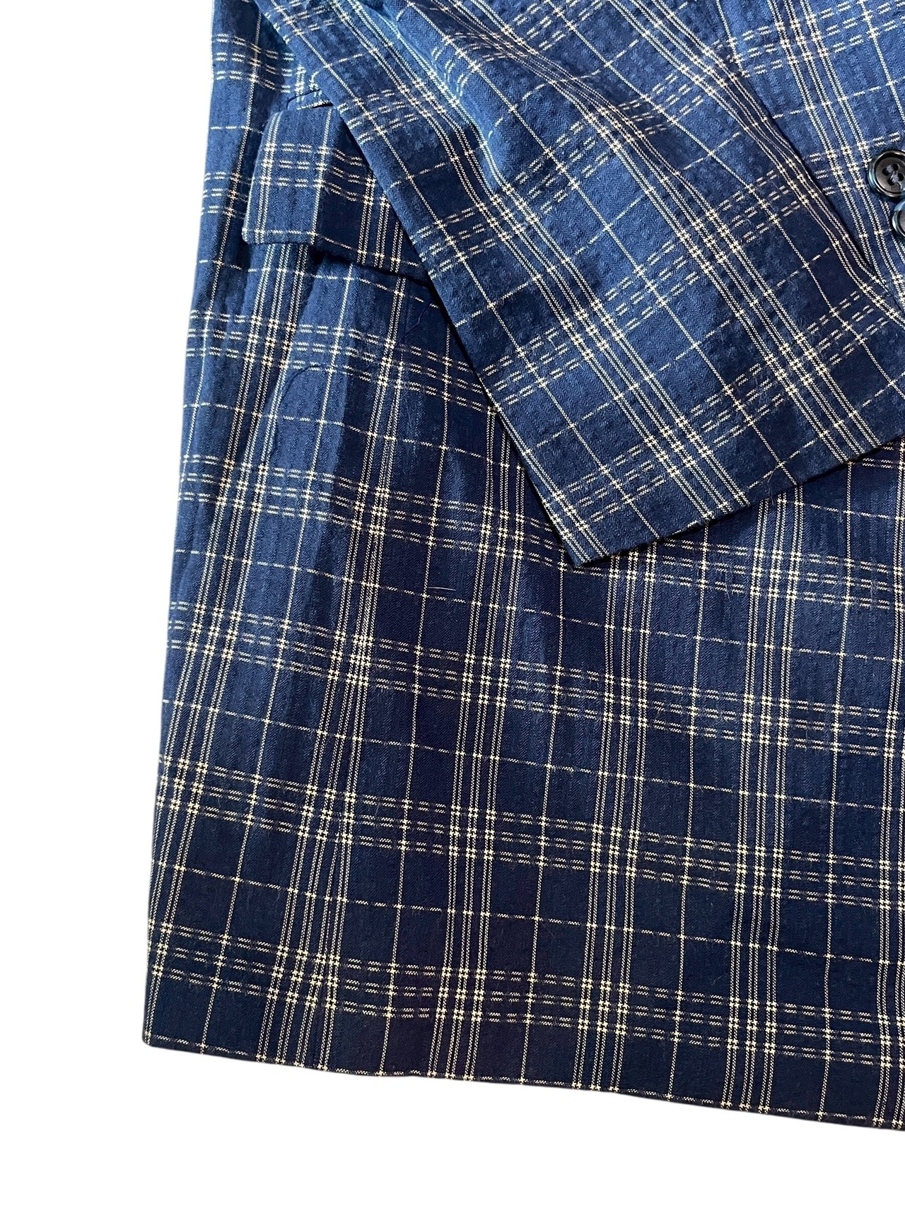 紺色に走る白のチェックが、光に当たるたび表情を変えるテーラードジャケット。