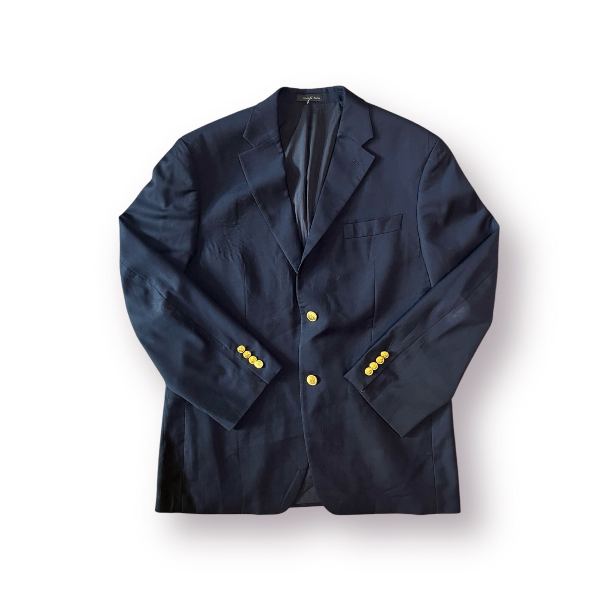 金ボタンのアクセントも上品で、カジュアルでもクラシックでも輪郭がぐっと整う。