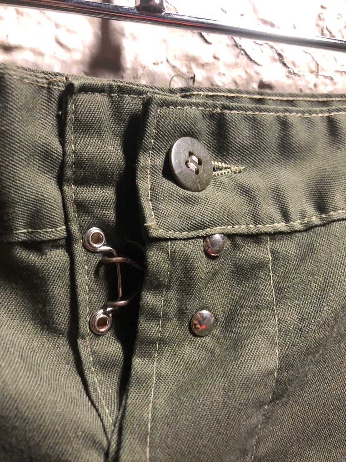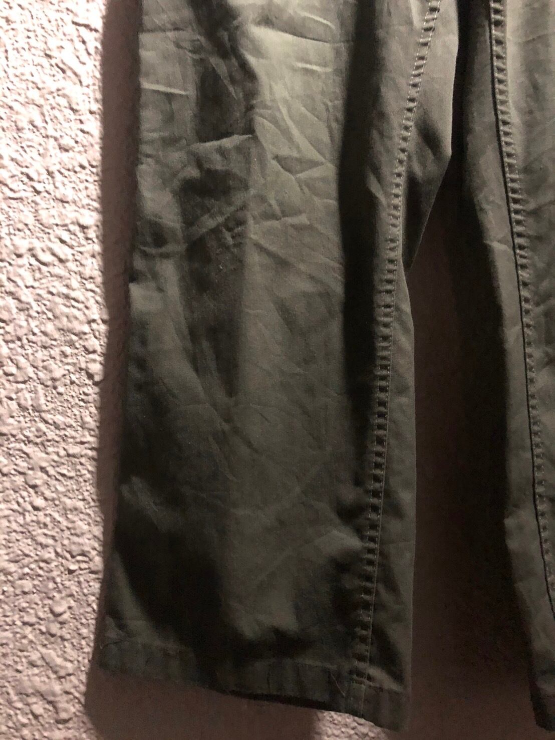 夜の灯りにじんわり浮かぶ、オリーブのミリタリー調パンツ。