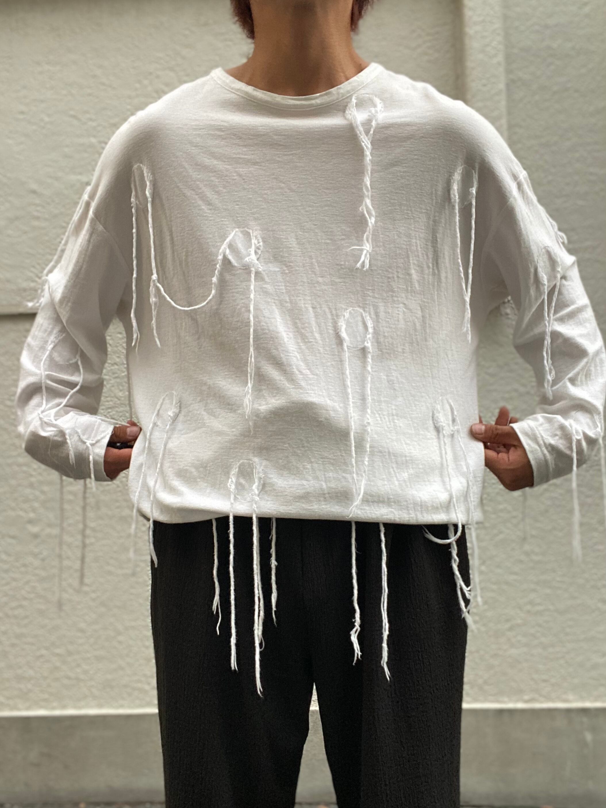 ゆるく落ちたシルエットに、ざっくりと走る糸の跡。