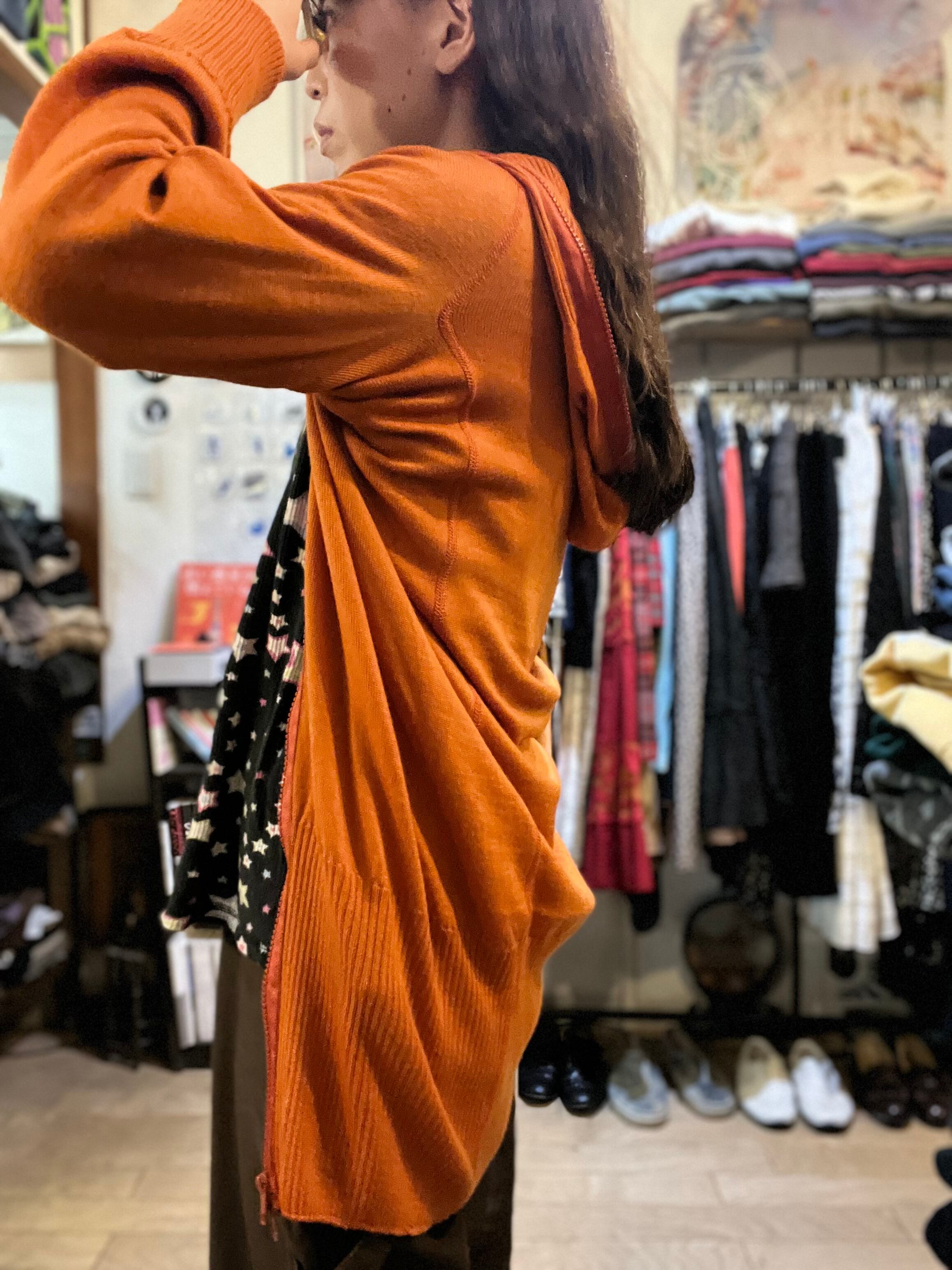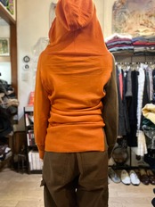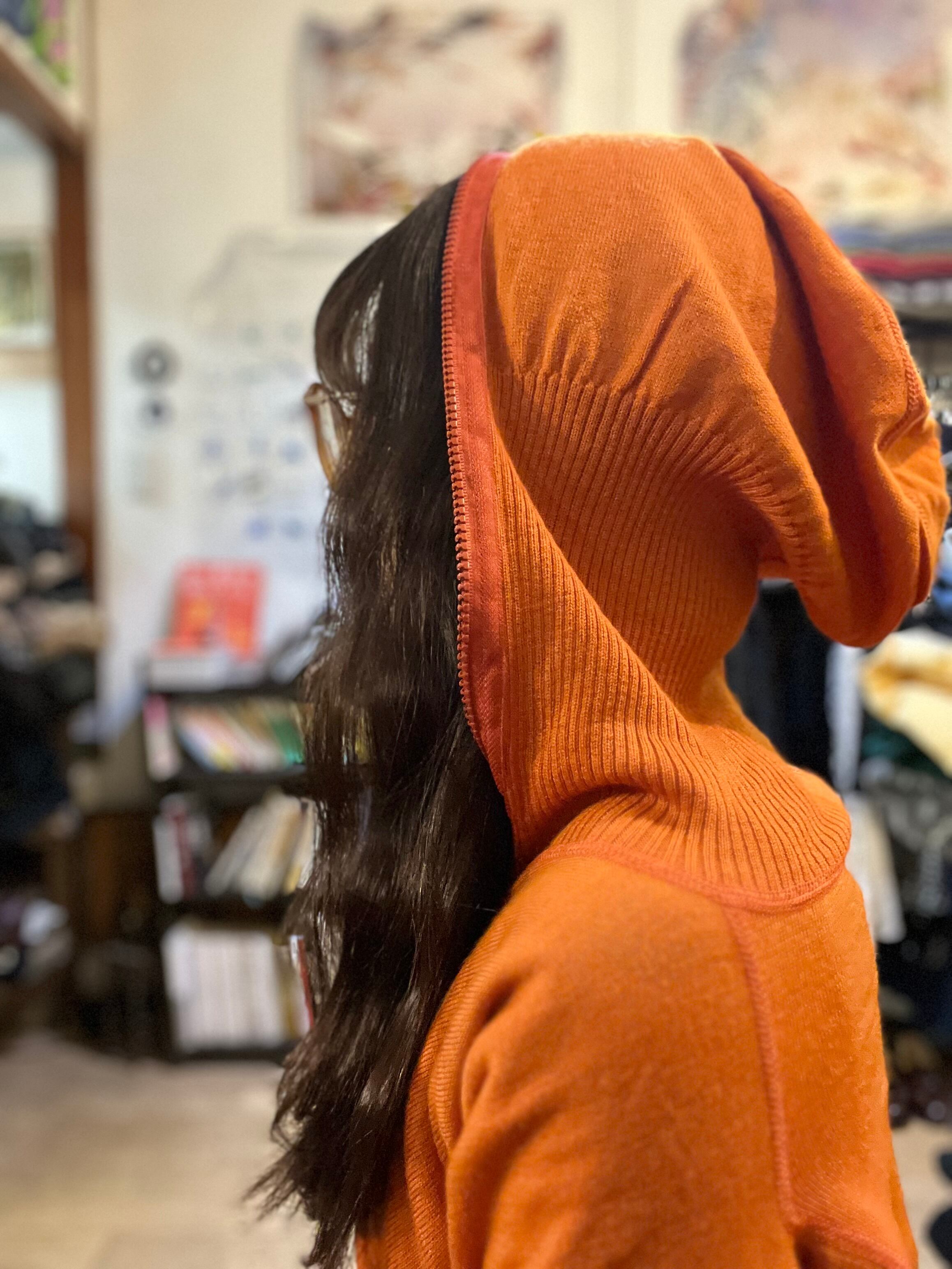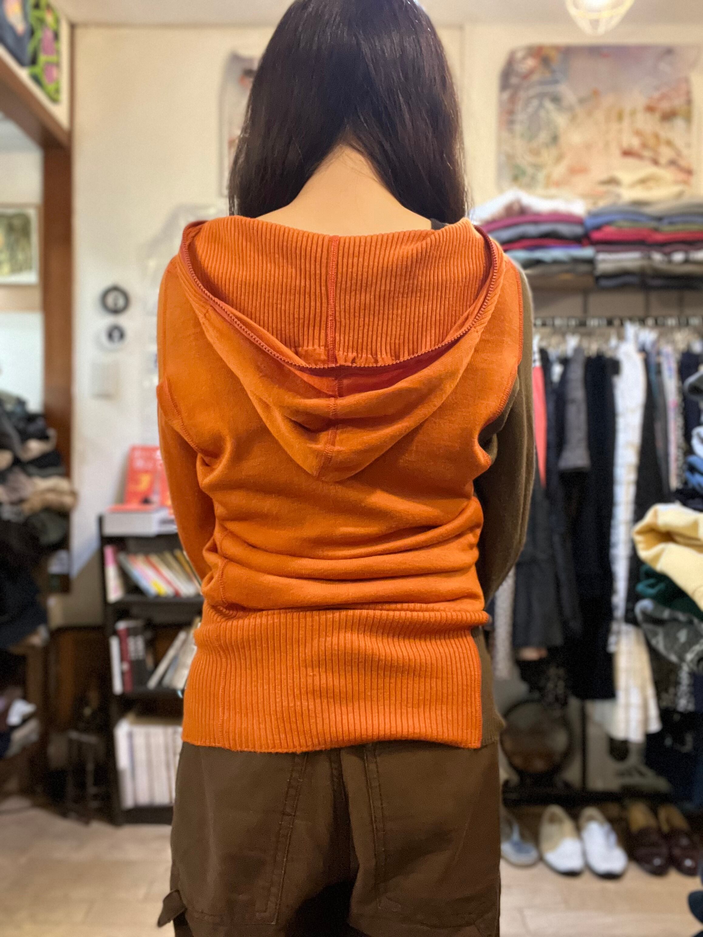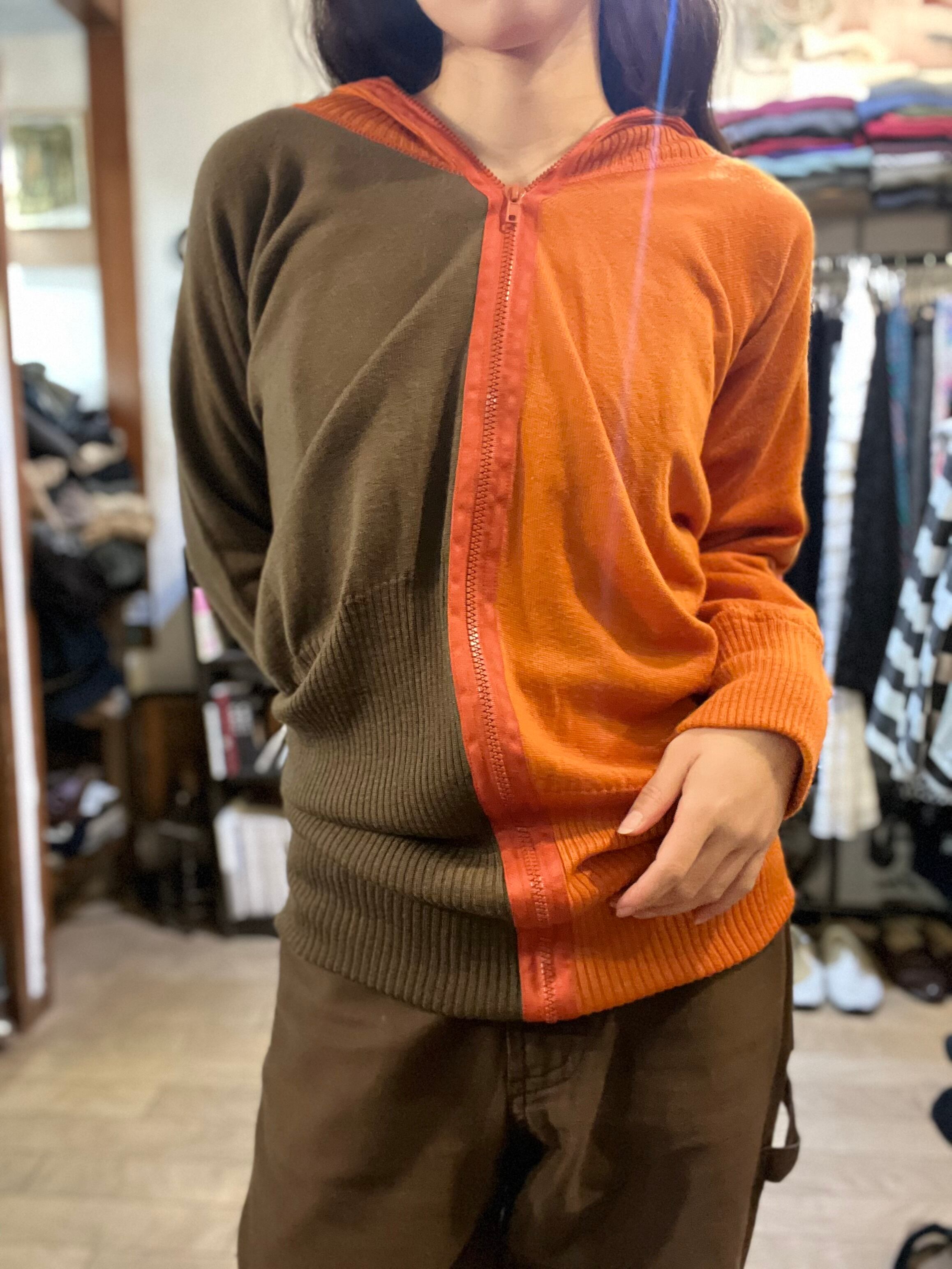 オレンジとブラウン、二つの色が静かに主張し合うニットフーディー。