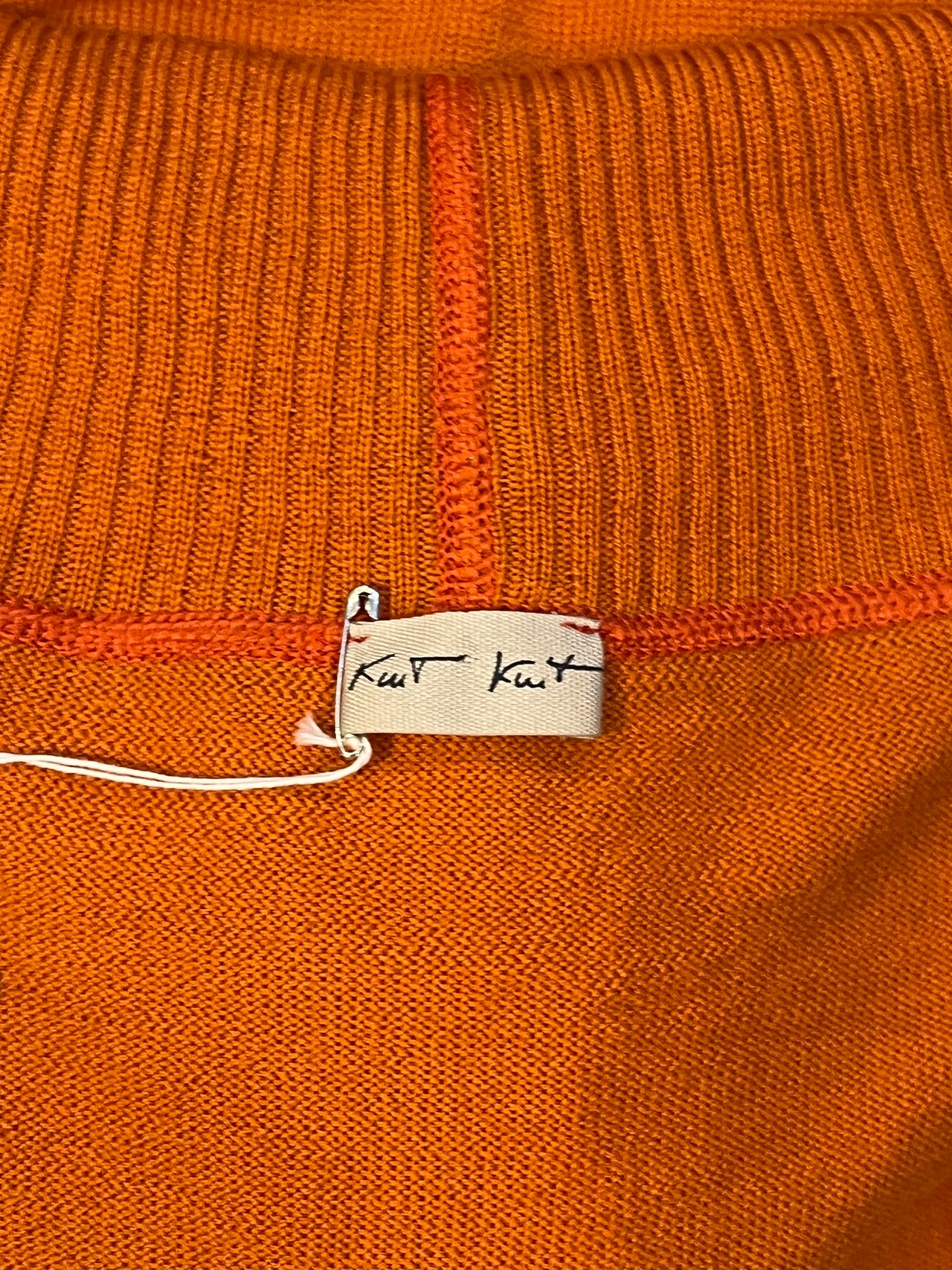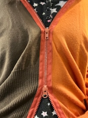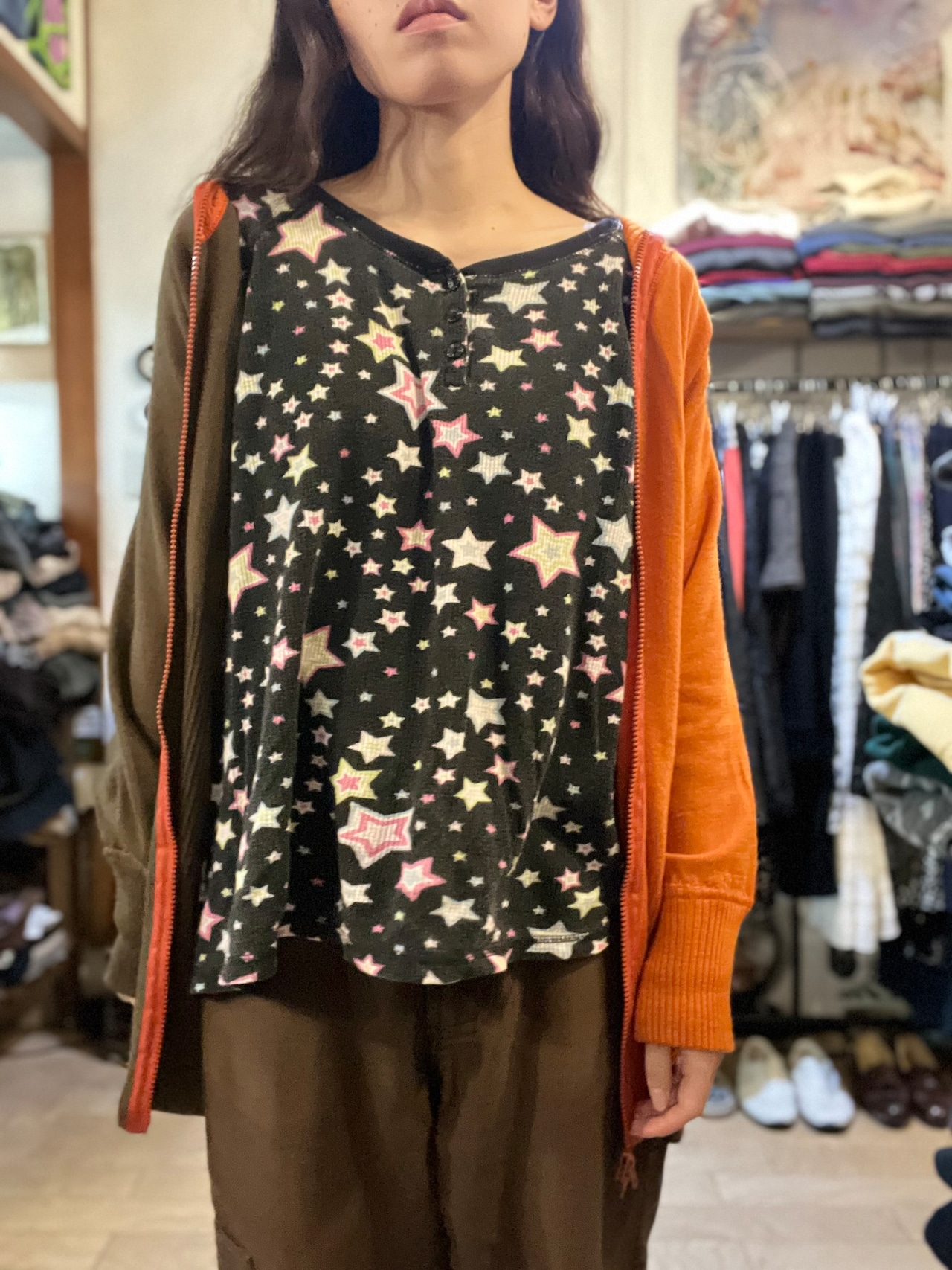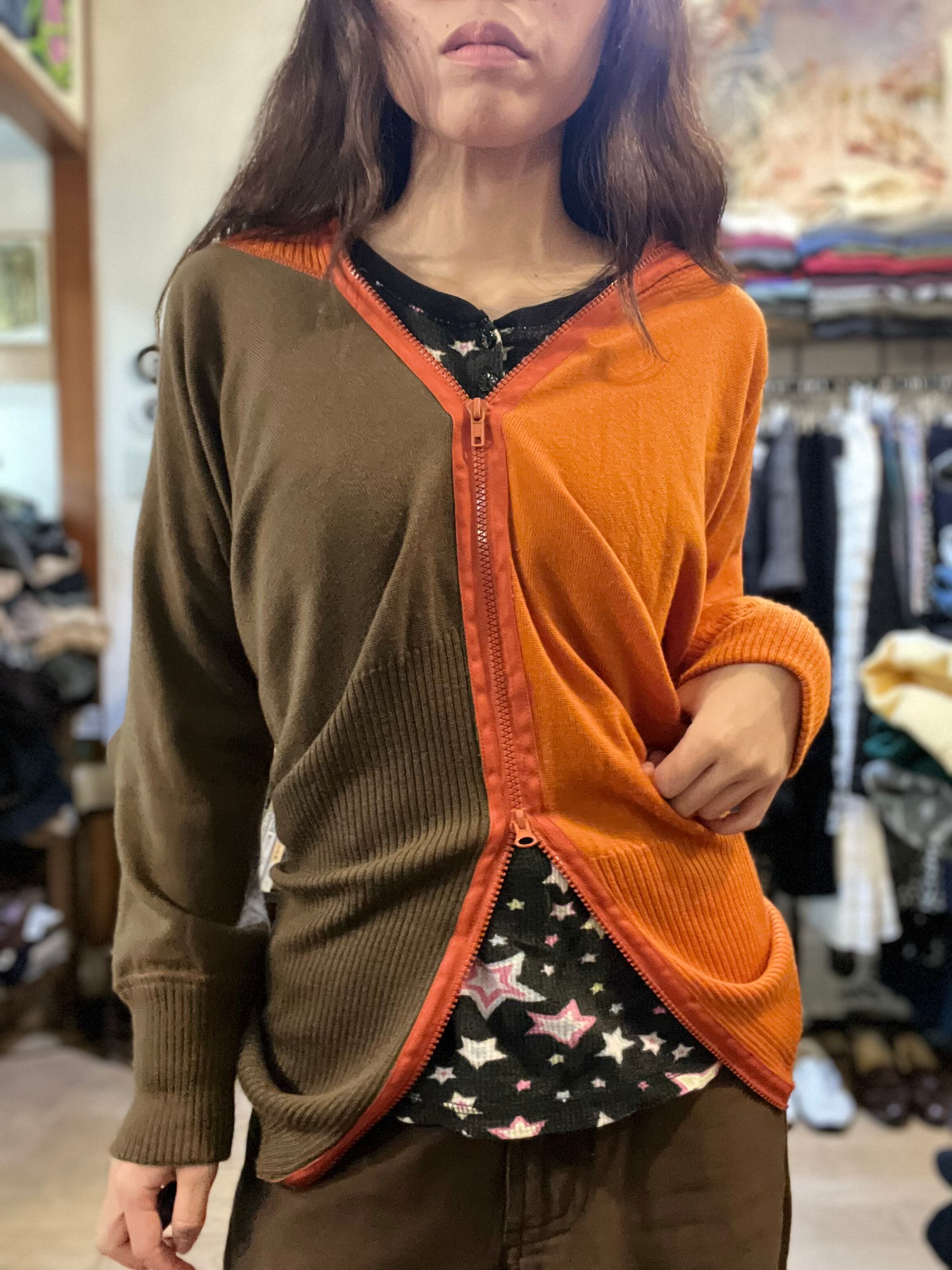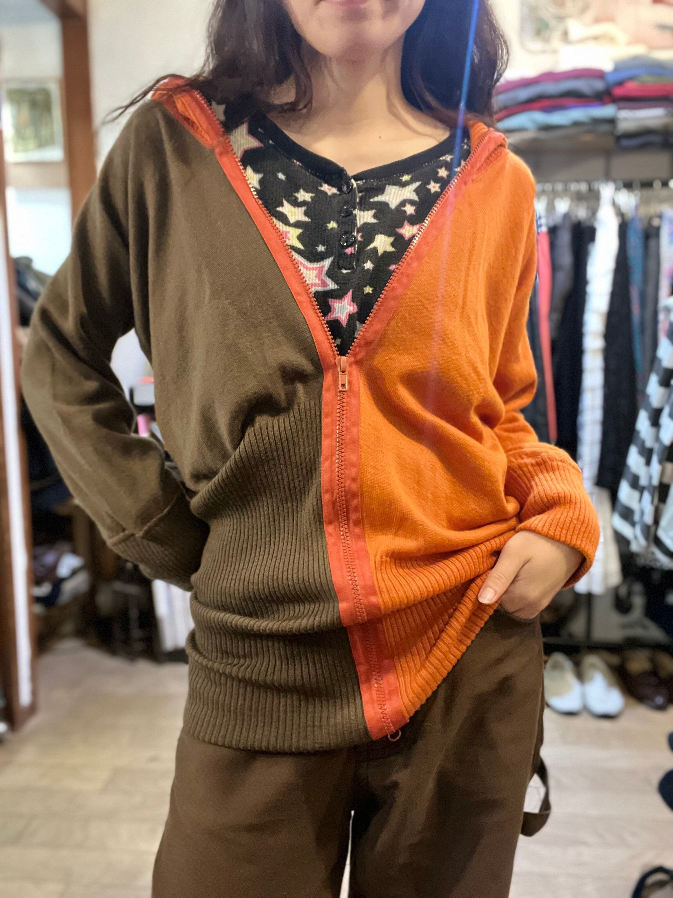 オレンジとブラウン、二つの色が静かに主張し合うニットフーディー。