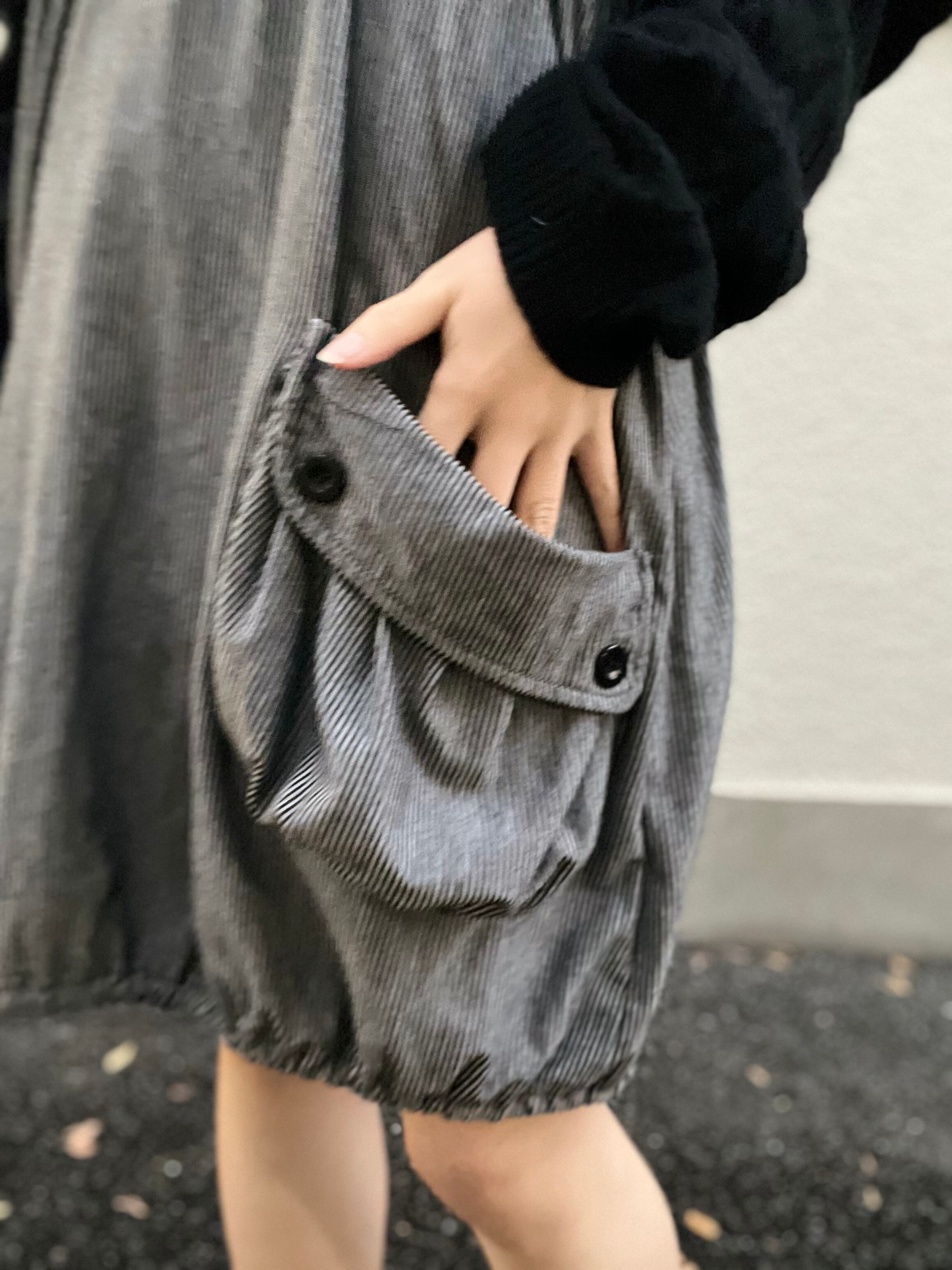 丸みを帯びたバルーンシルエットで、すとんと落ちる身頃と、裾でキュッと閉じられるラインの対比が魅力的です。