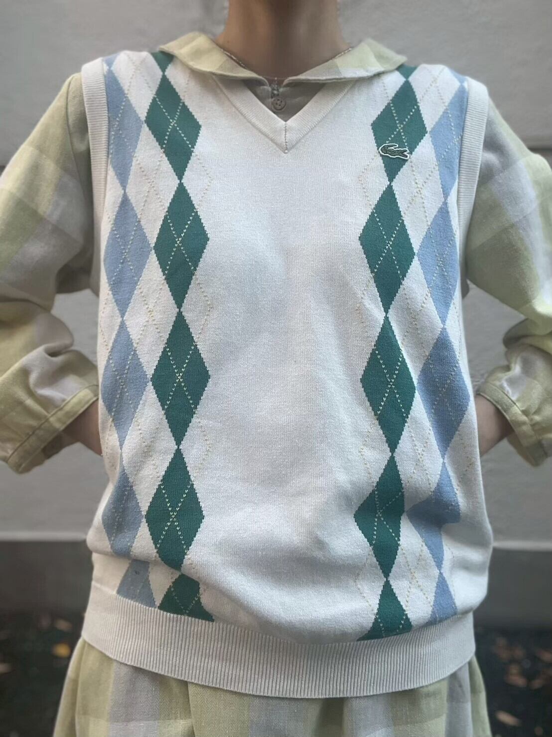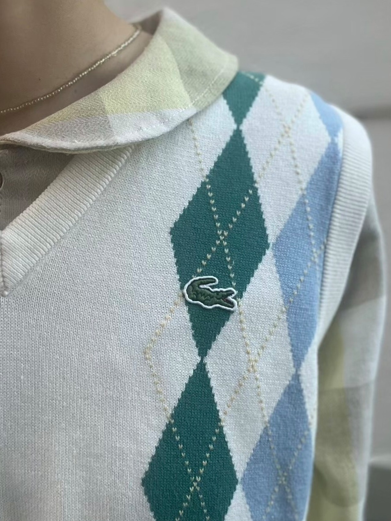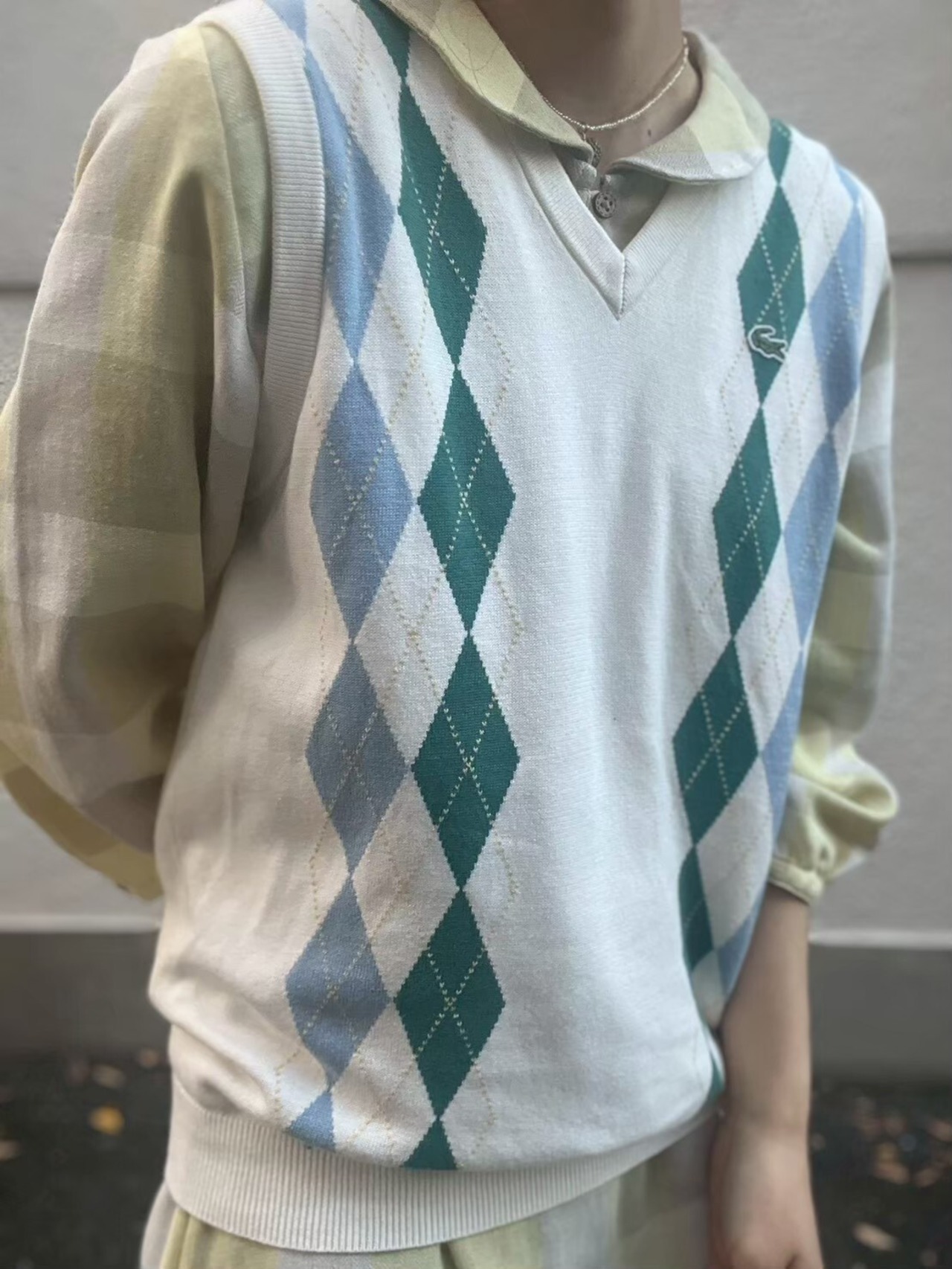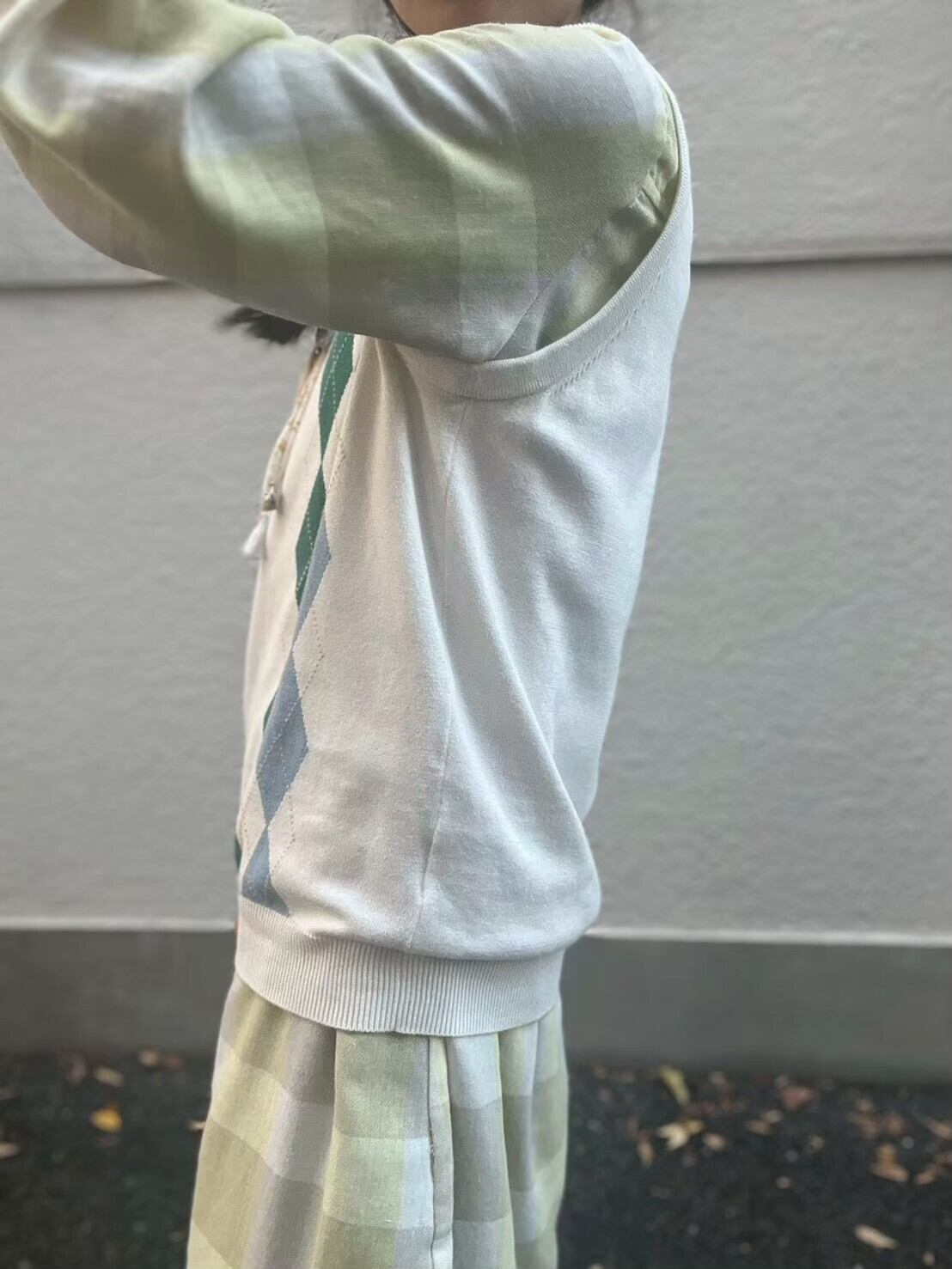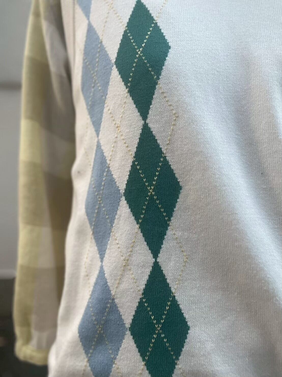 やさしい生成りをベースに、グリーンとブルーのアーガイル。