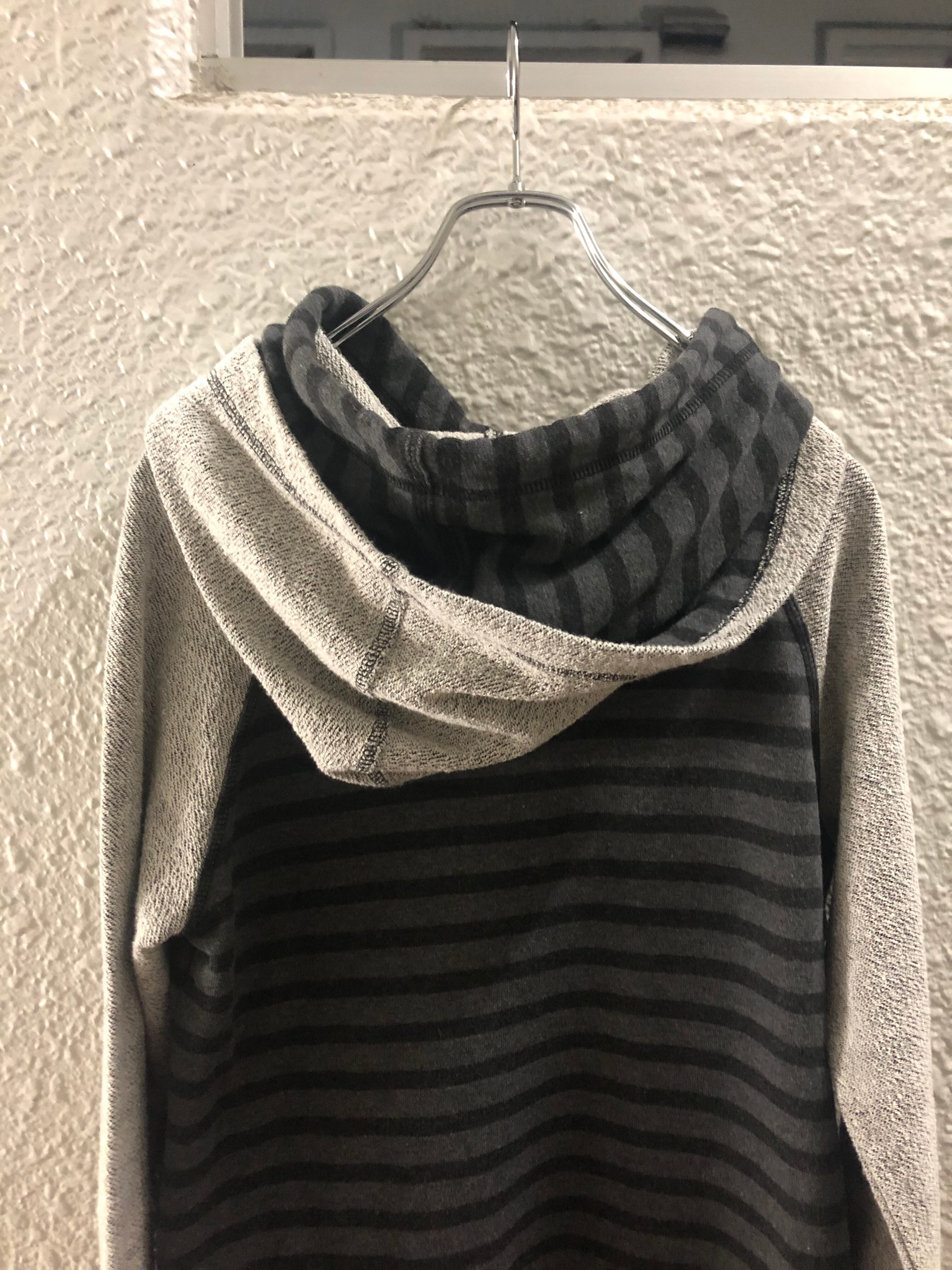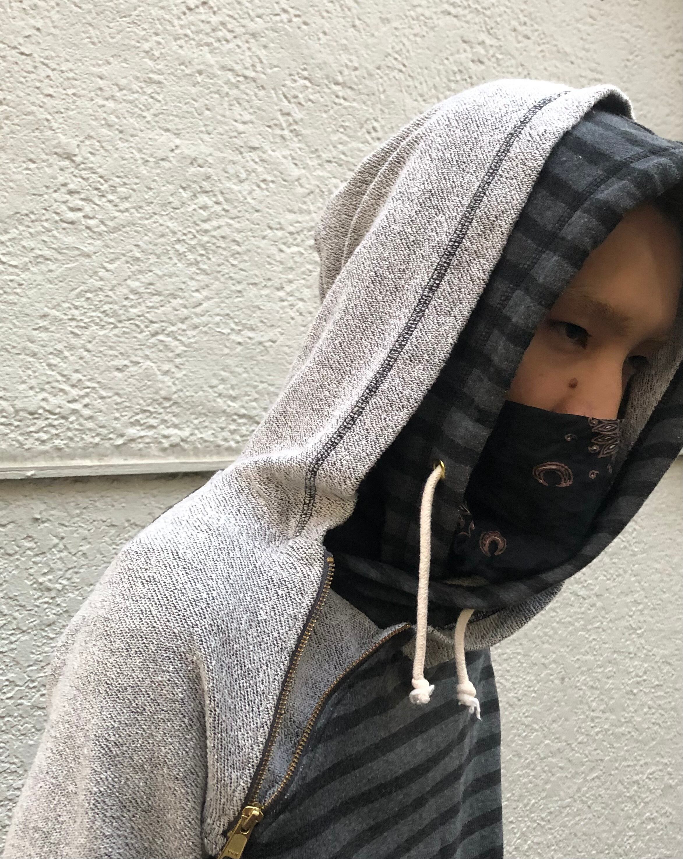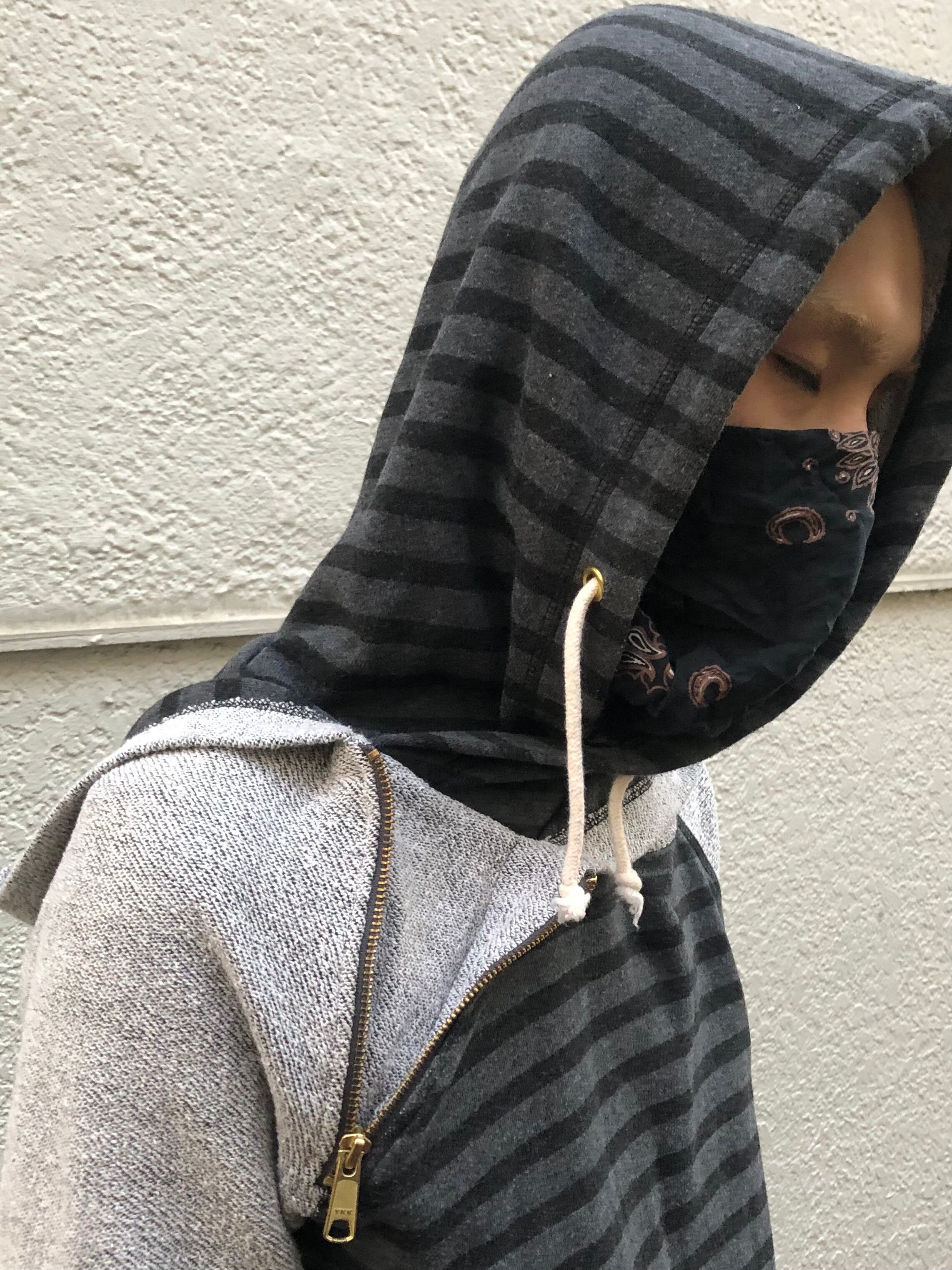 ダブルフード.斜めジップ.袖はインサイドアウト。。妙にしっくりくるフーディーです。