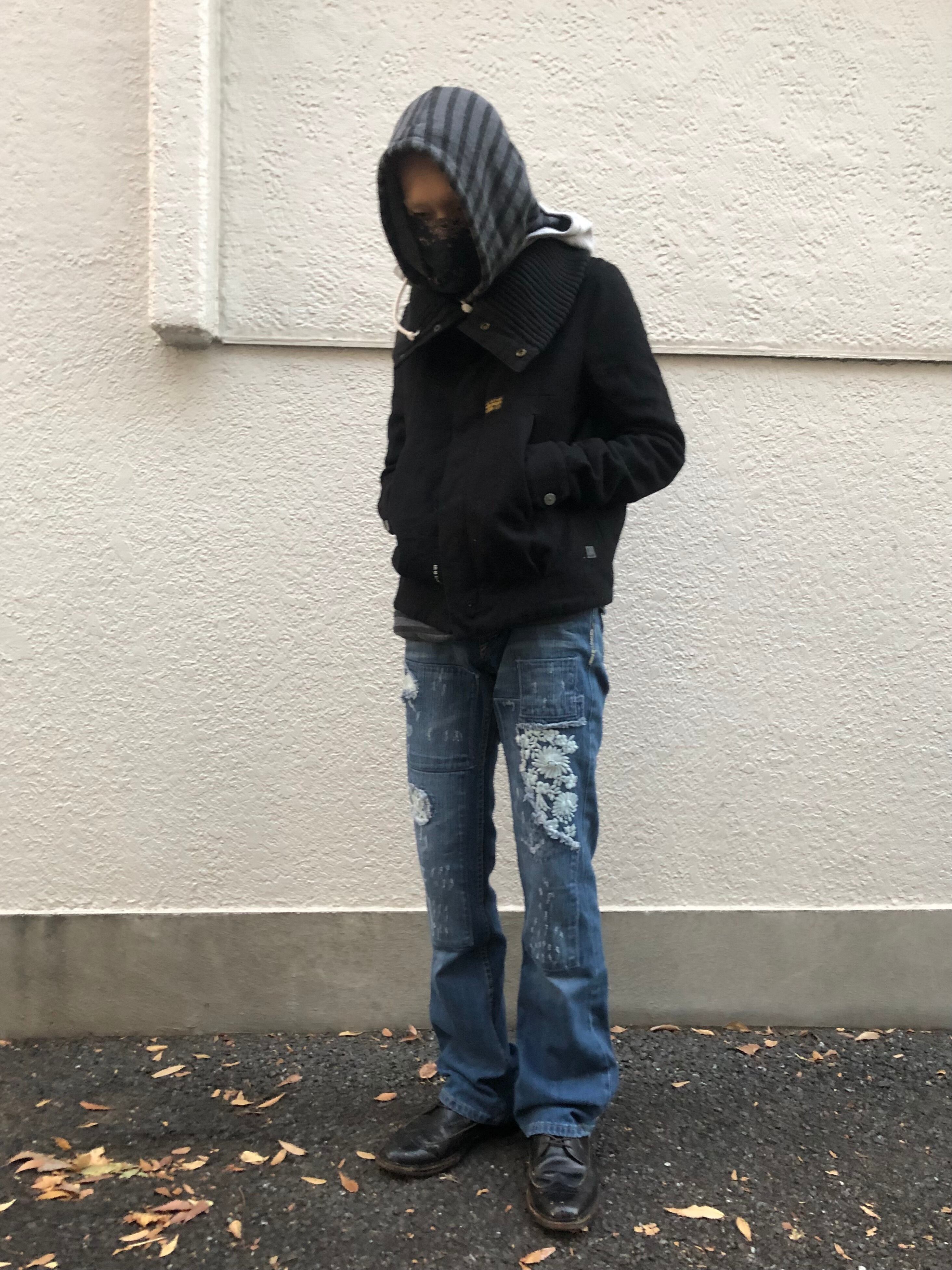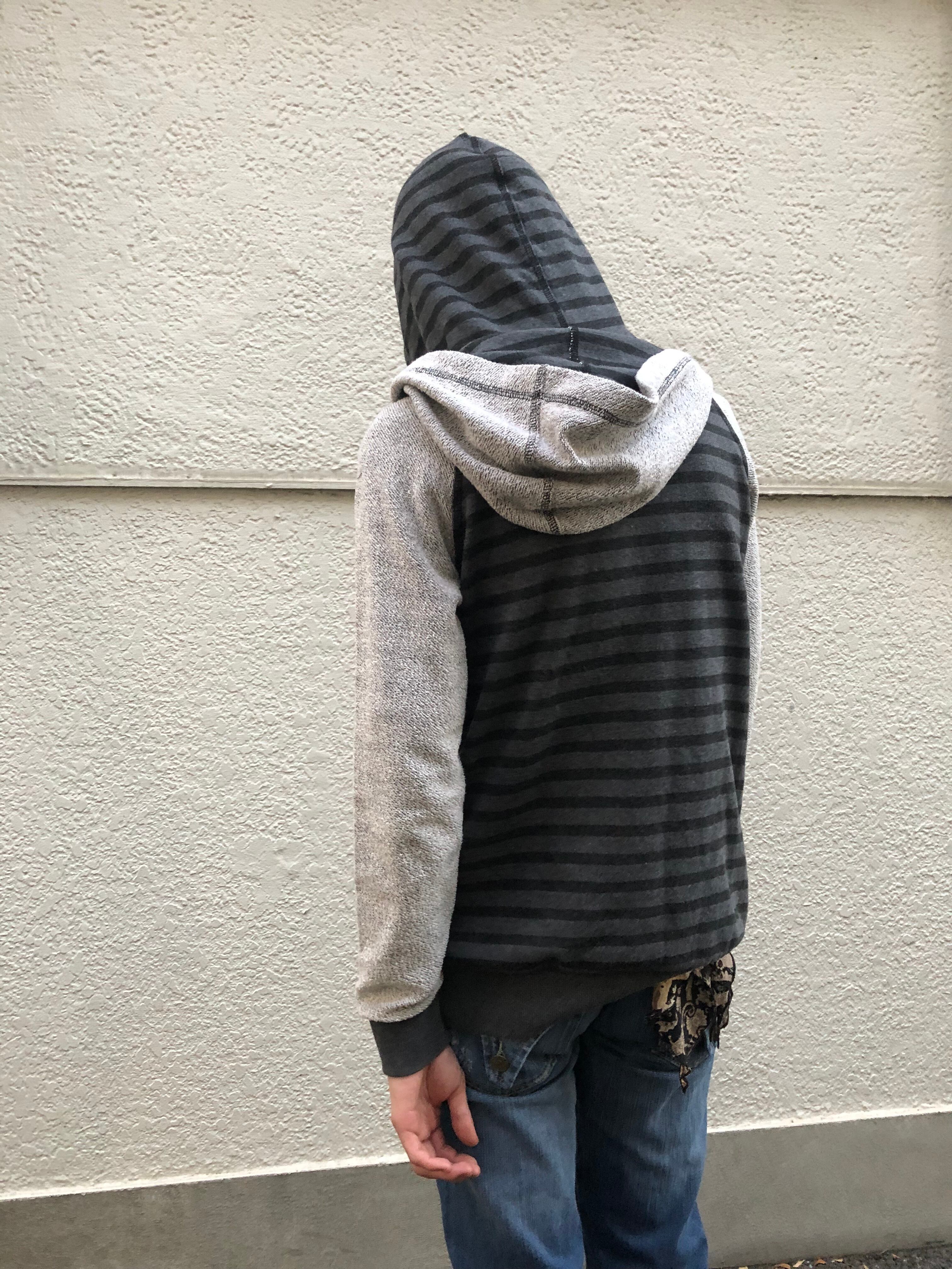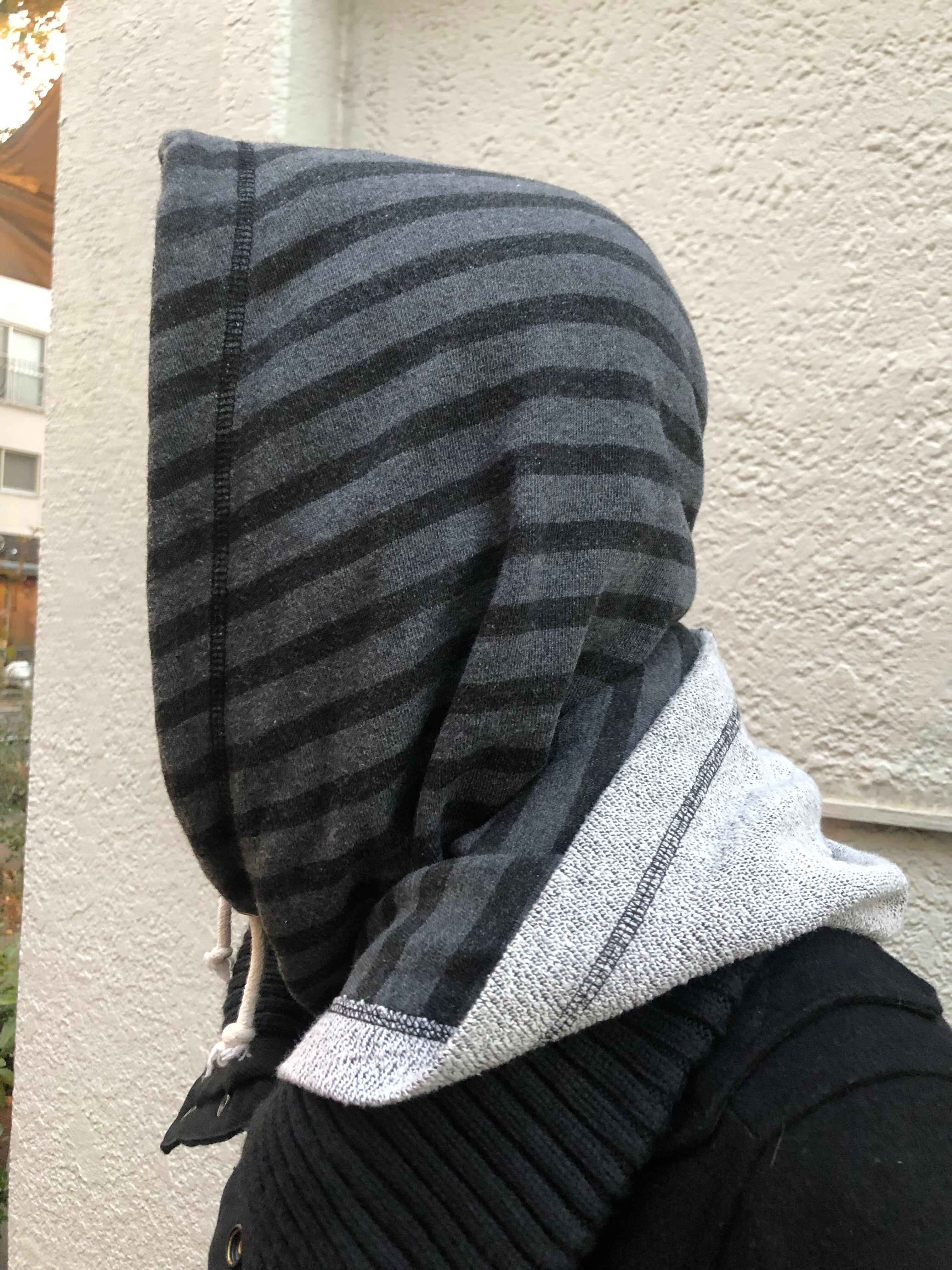 ダブルフード.斜めジップ.袖はインサイドアウト。。妙にしっくりくるフーディーです。