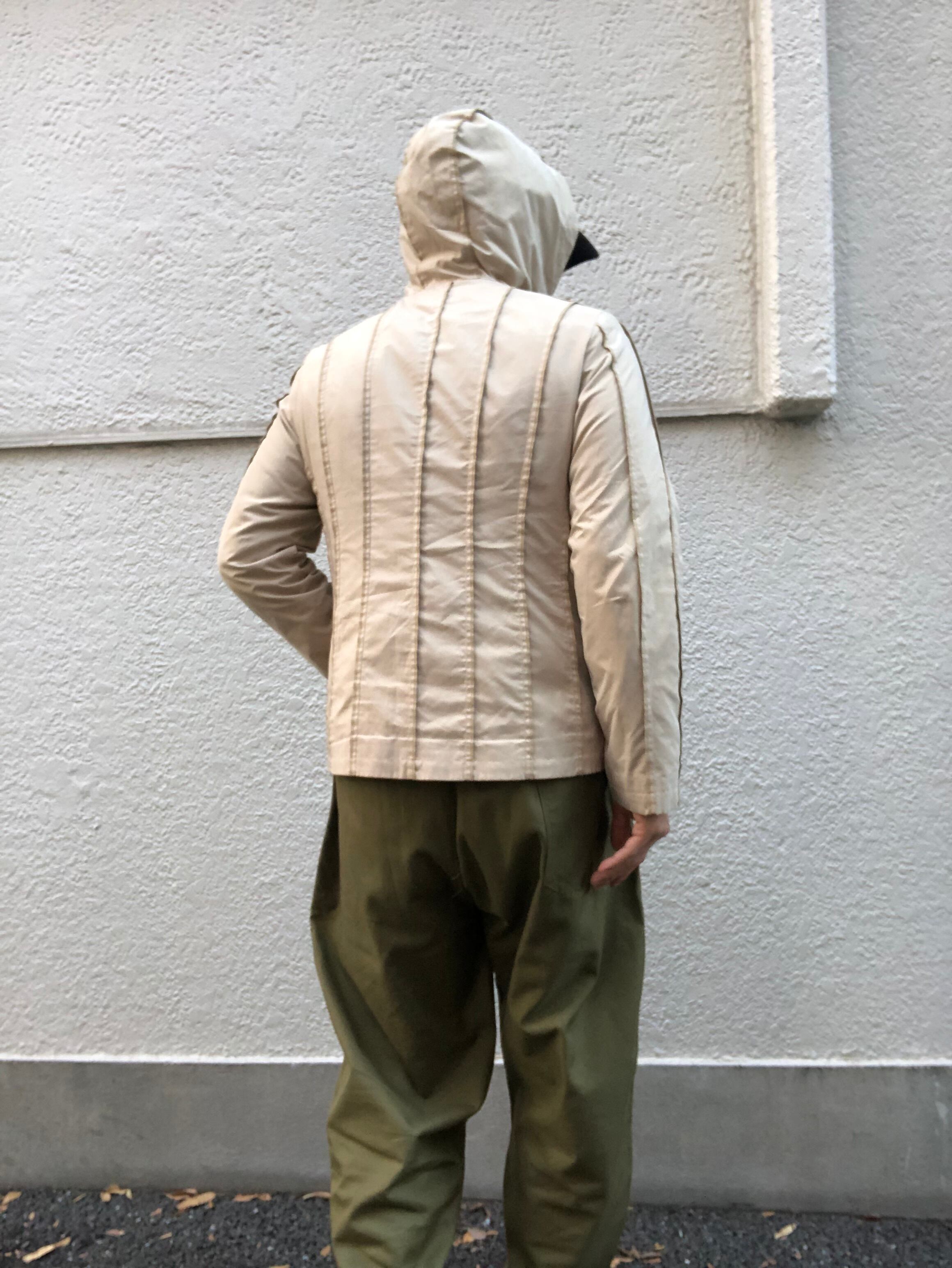 表面の細かなハリと縦ラインのステッチが、動きに合わせてわずかに表情を変える独特の仕上がり。しっとりとした光を拾うナイロンです。
