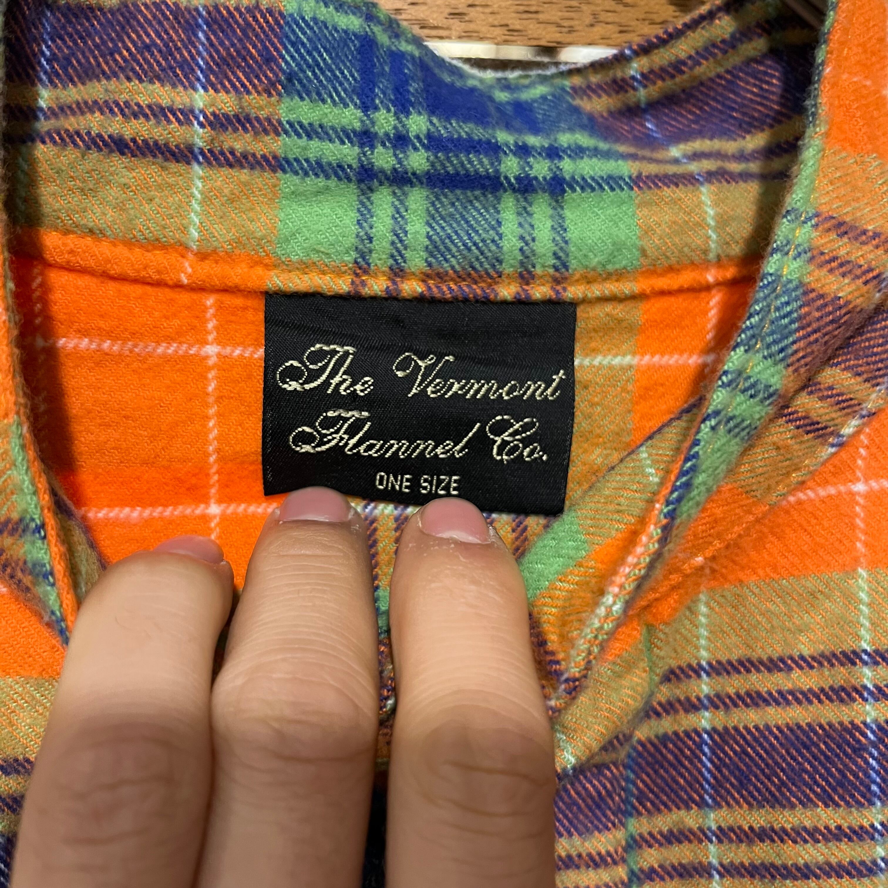 ビビッドなオレンジに、深いグリーンとブルーが重なるチェックが絶妙で、ほどよくくった質感が雰囲気をつくってくれます。