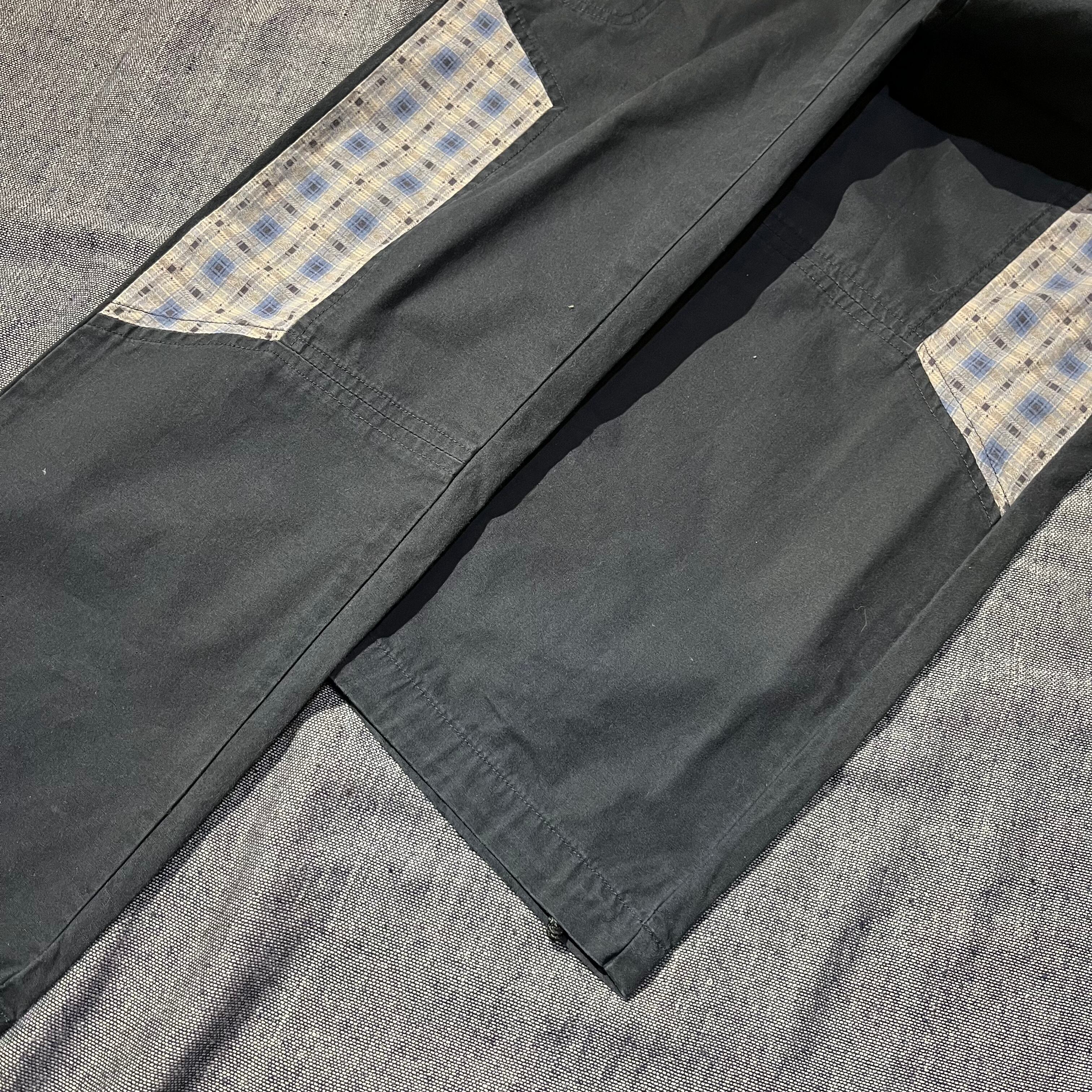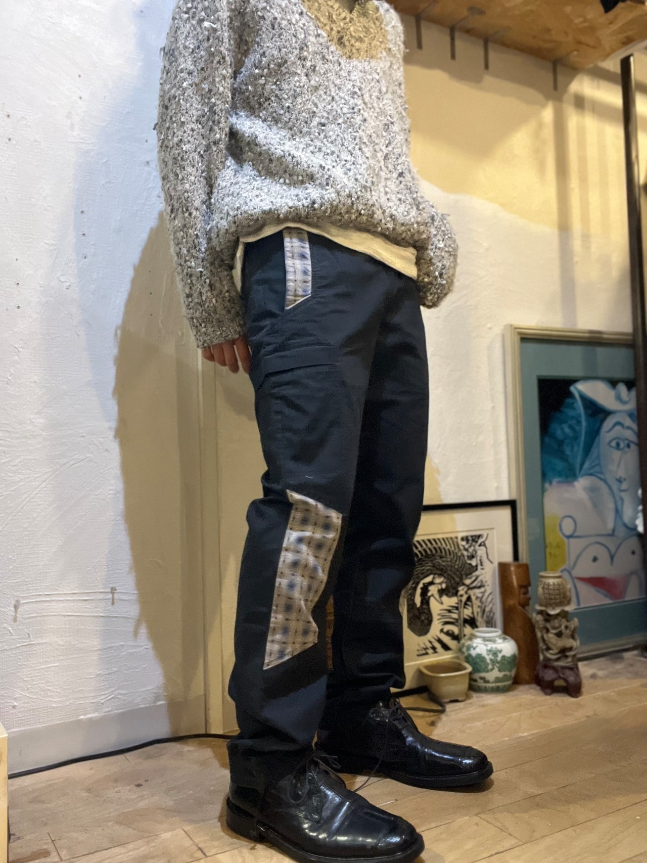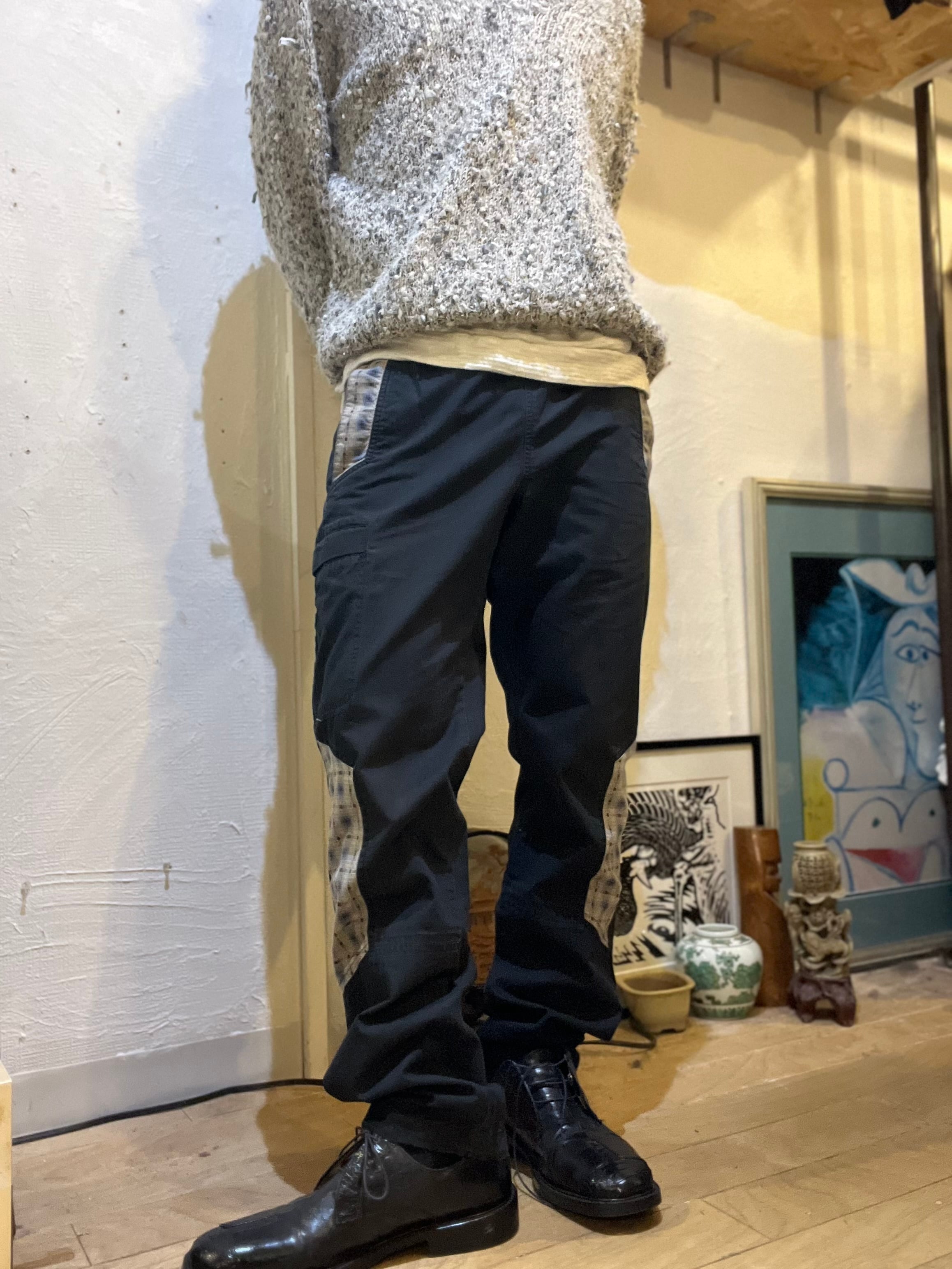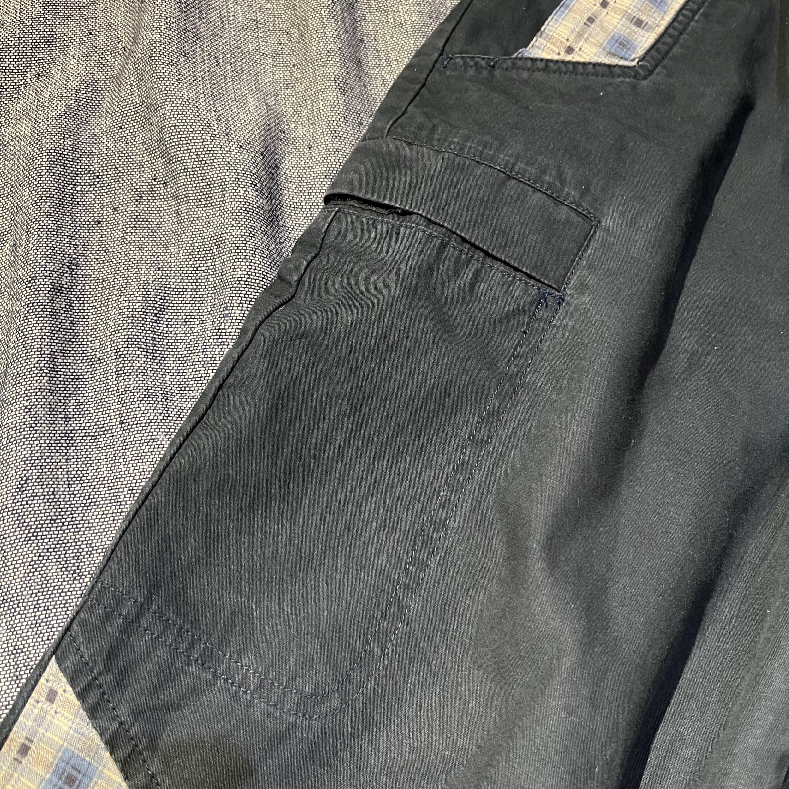 膝、ポケット、裾。要所に差し込まれた青×ベージュのオンブレチェック。主張は控えめ、でも確実に引っかかります。