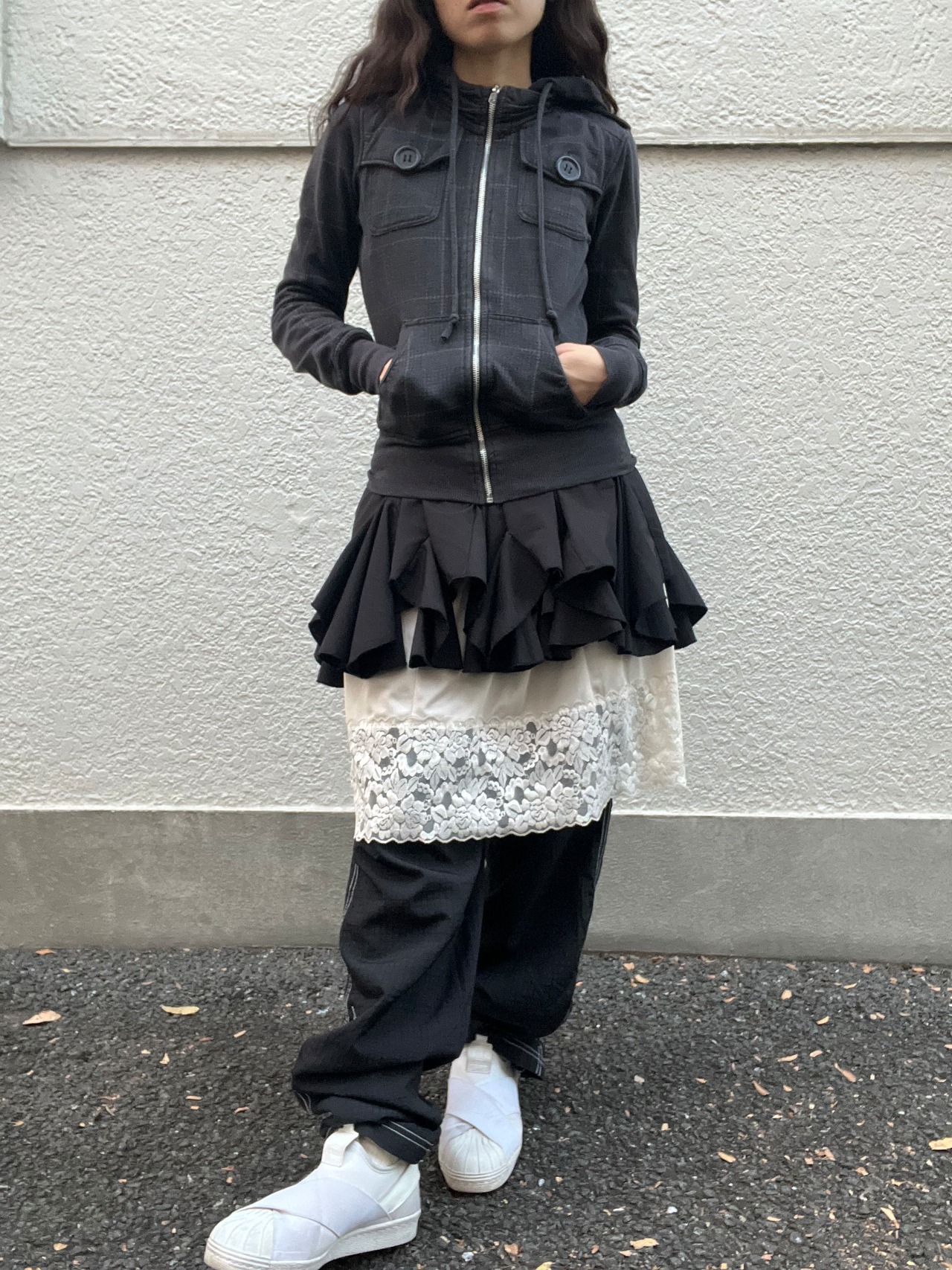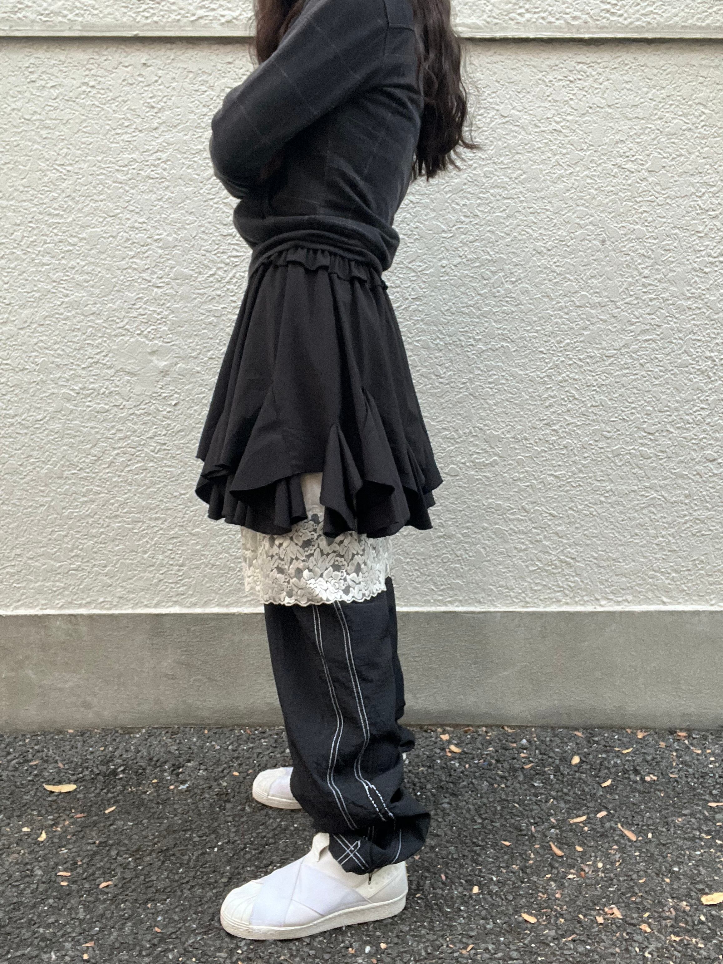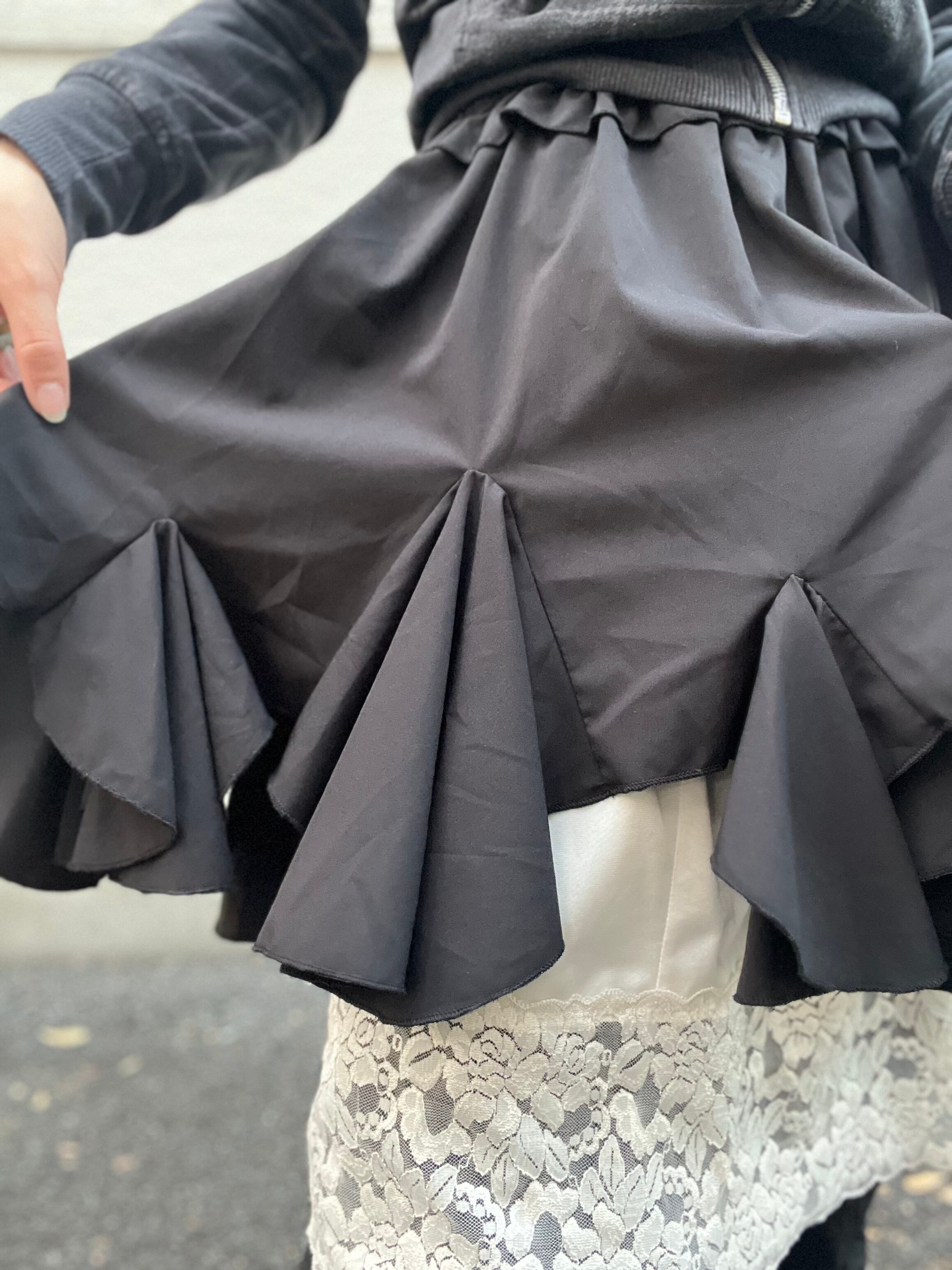 ひらひらと揺れるシルエットなのに、色が黒なので甘さよりも独特のニュアンスが際立ち、上品さと個性が同居するような印象になります。