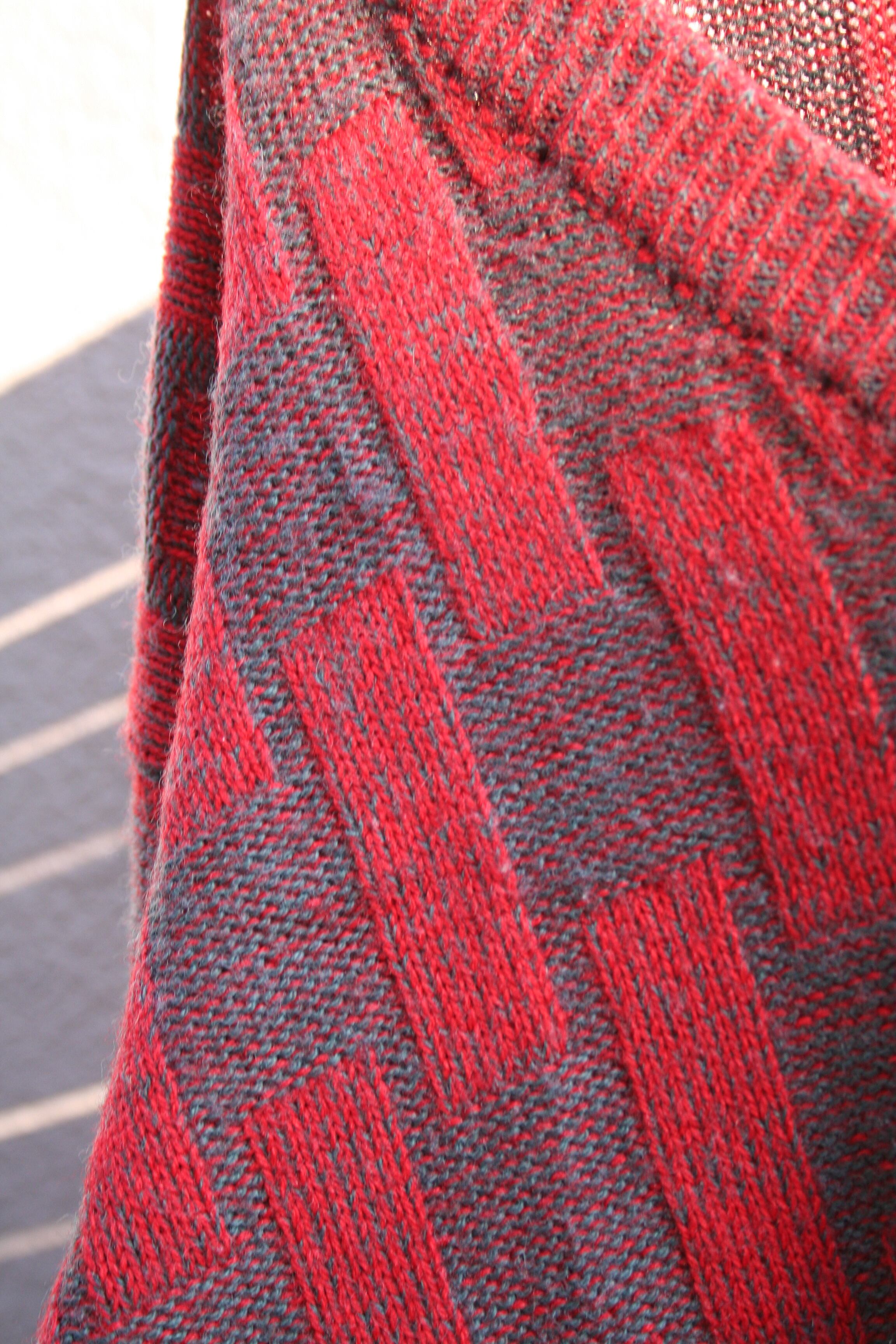 Vネックのすっきりした首元に、よく見るとマス目のチェック柄のような、少し変わった編みが入っています。