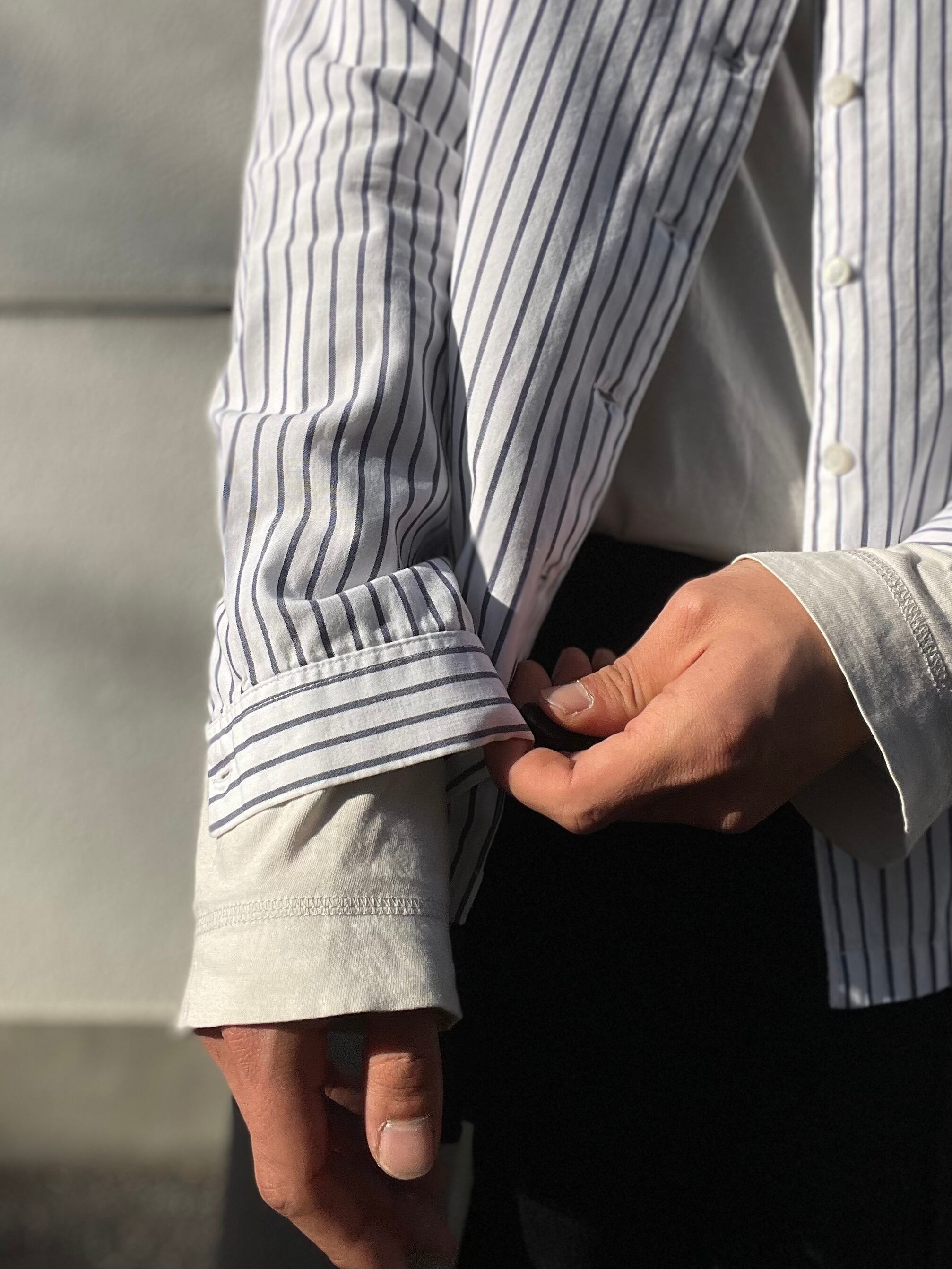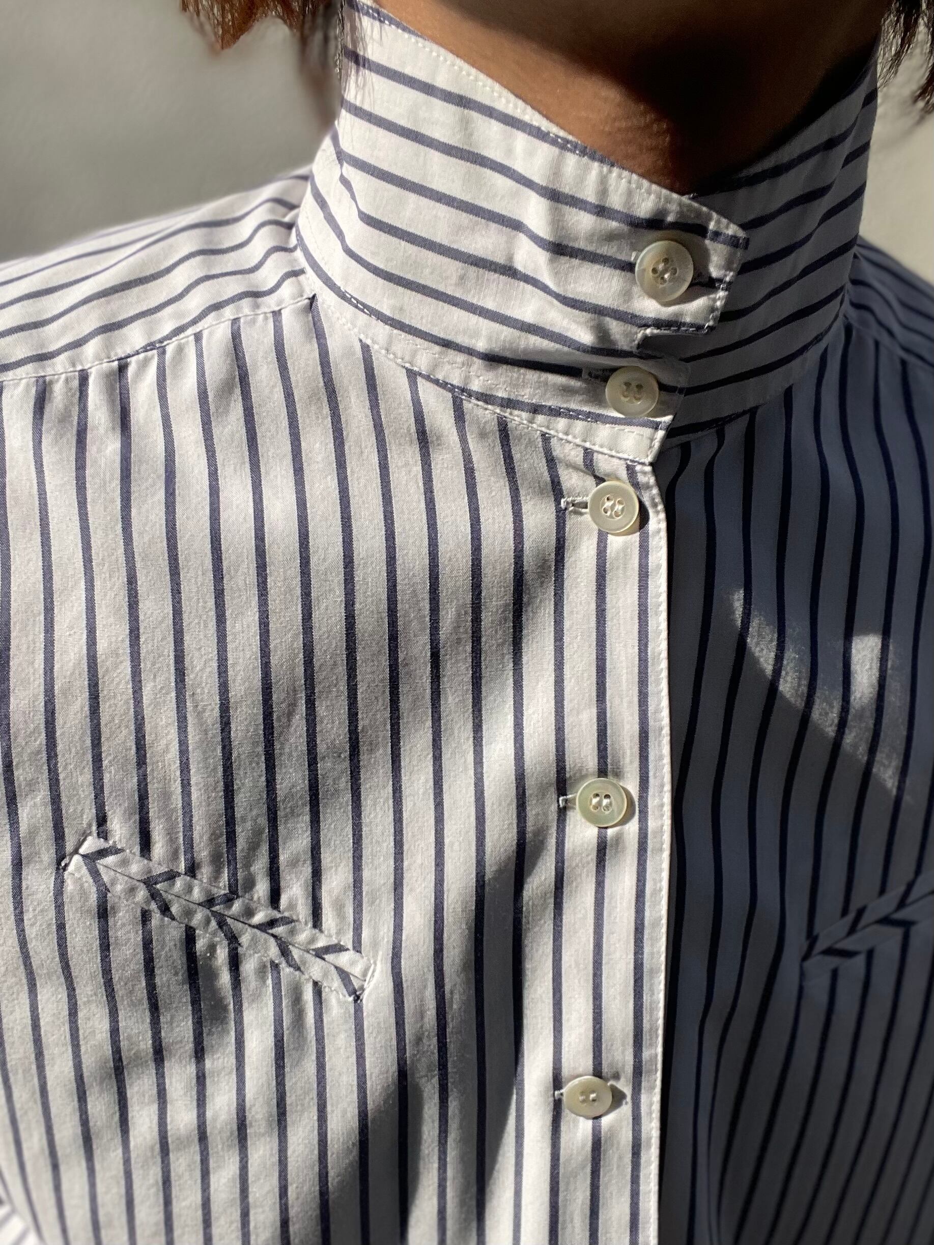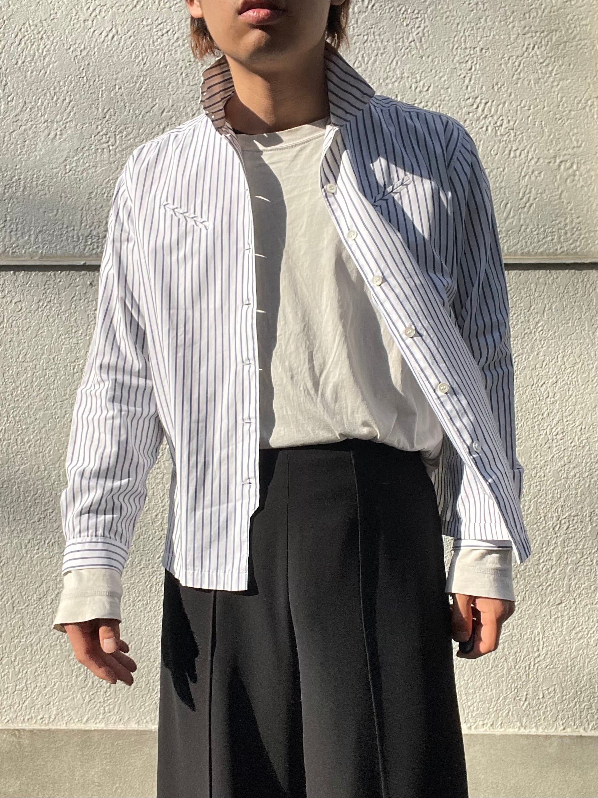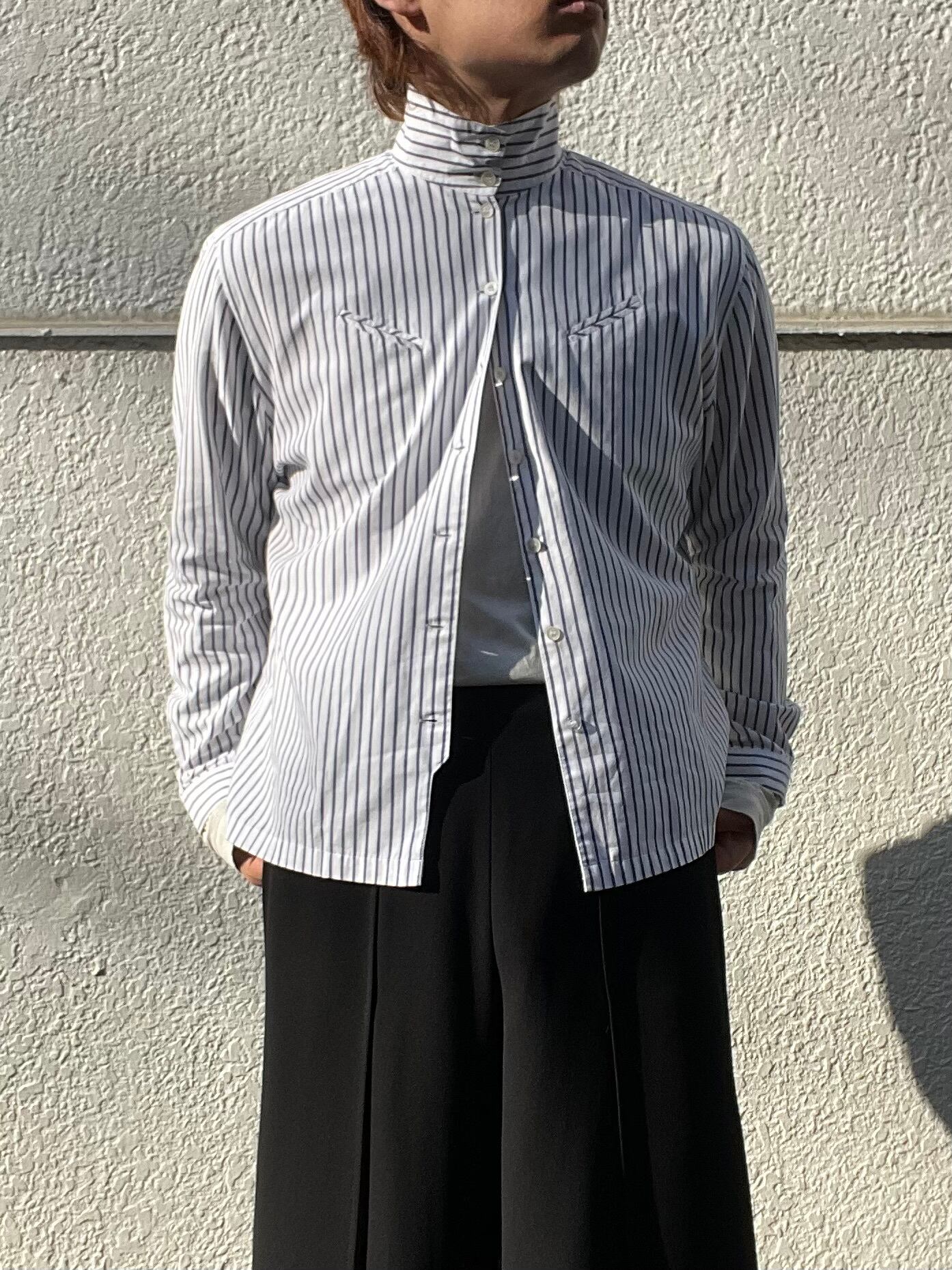 天に向かって上昇するハイネック、シャツでは珍しい「襟」で見せる"2way"です。