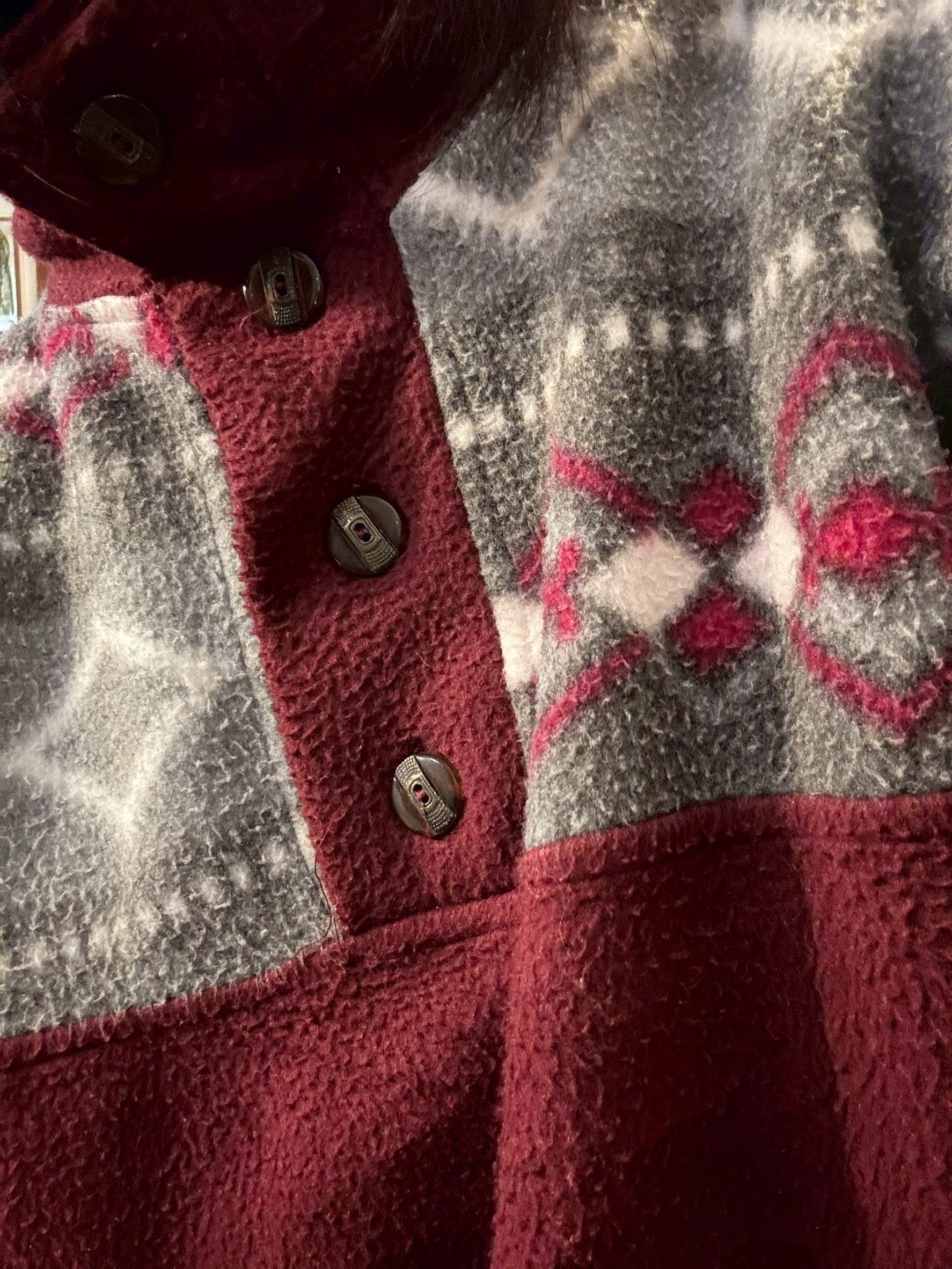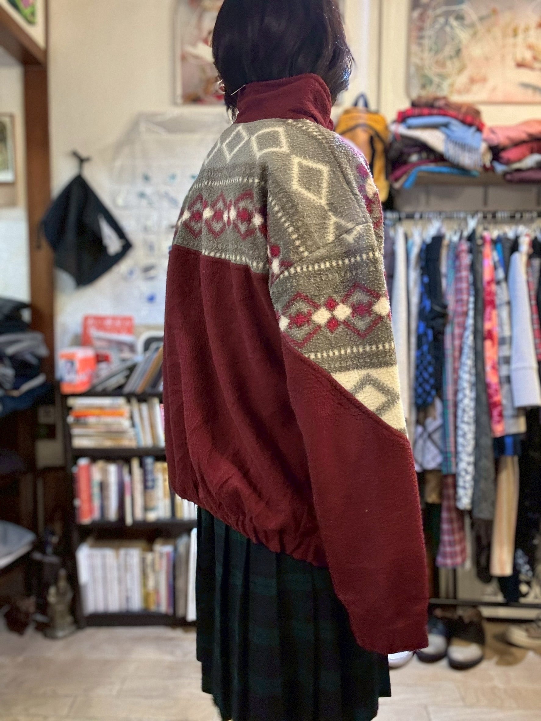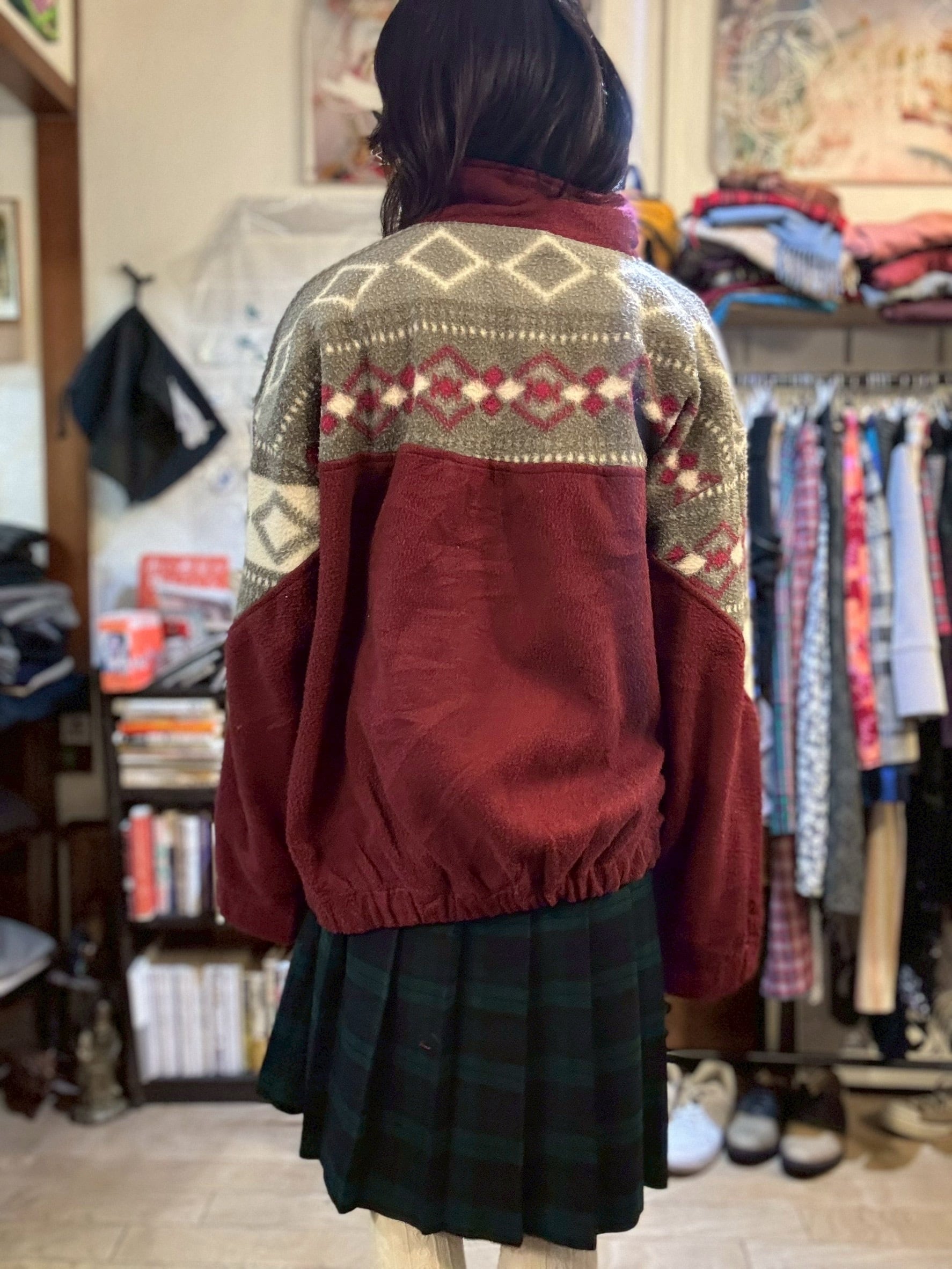 ワインカラーの大人な柄フリース。