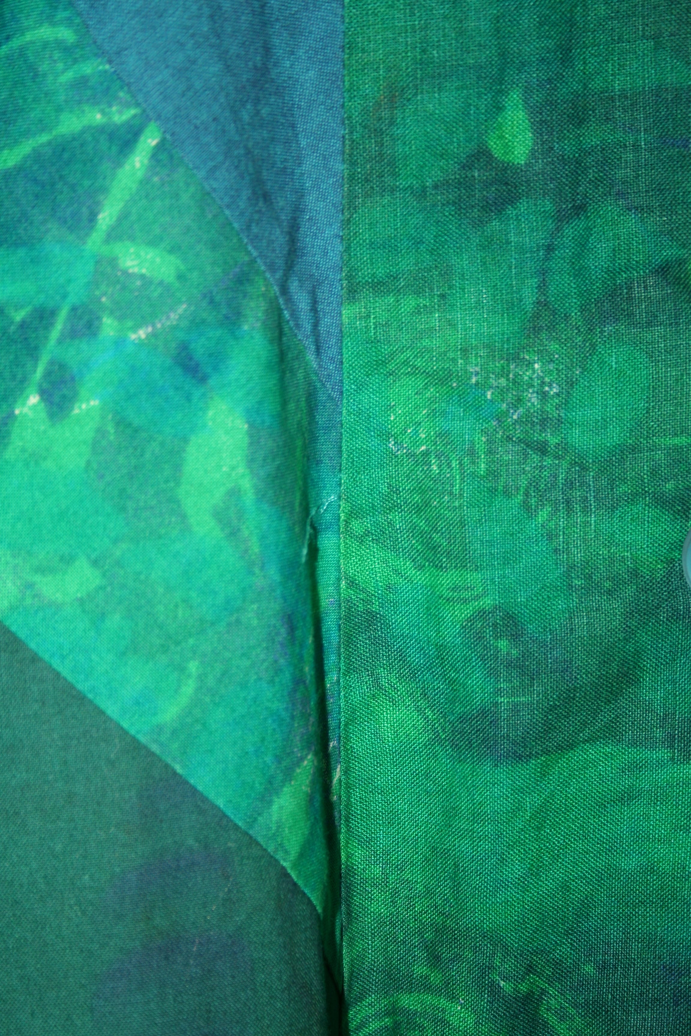 深緑、青磁色、そして発光するかのような鮮烈なグリーン。それらが不規則な幾何学模様を描きながら、一つの個体として強引に統合されています。