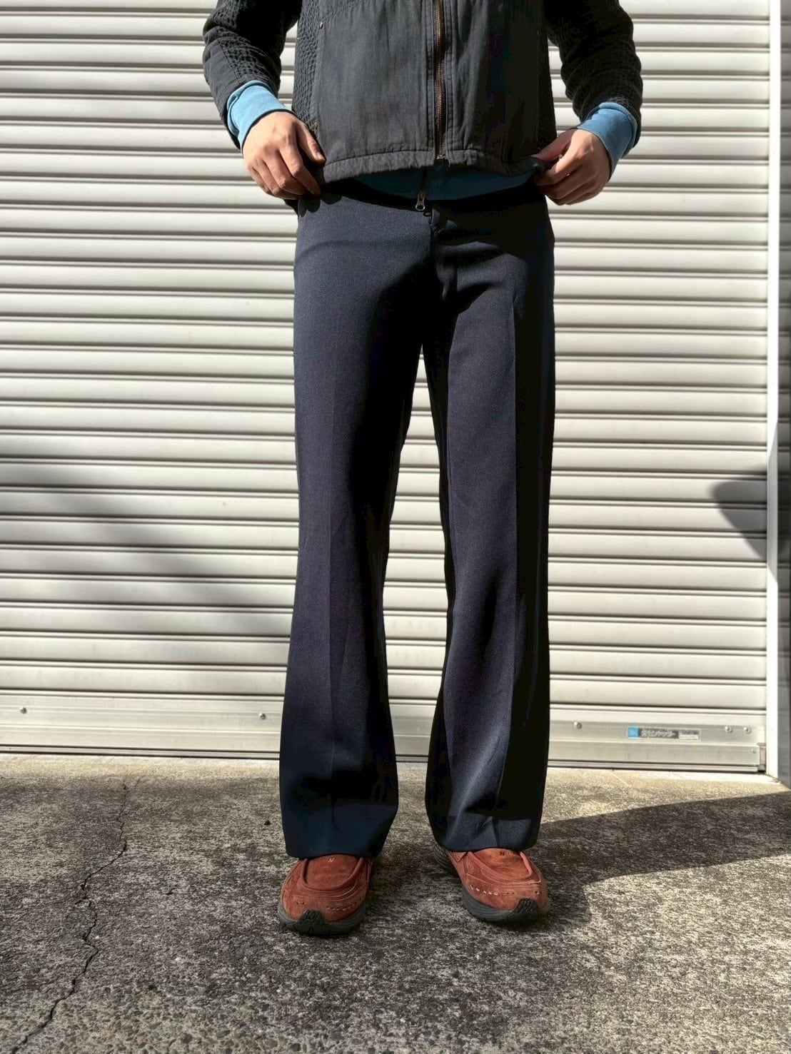 このスラックスが放つ、ある種の「完成された無機質さ」に脳を焼かれる。現代の服作りでは到底再現できない、70年代ポリエステル混紡特有の、あの「跳ね返るような」弾力です。