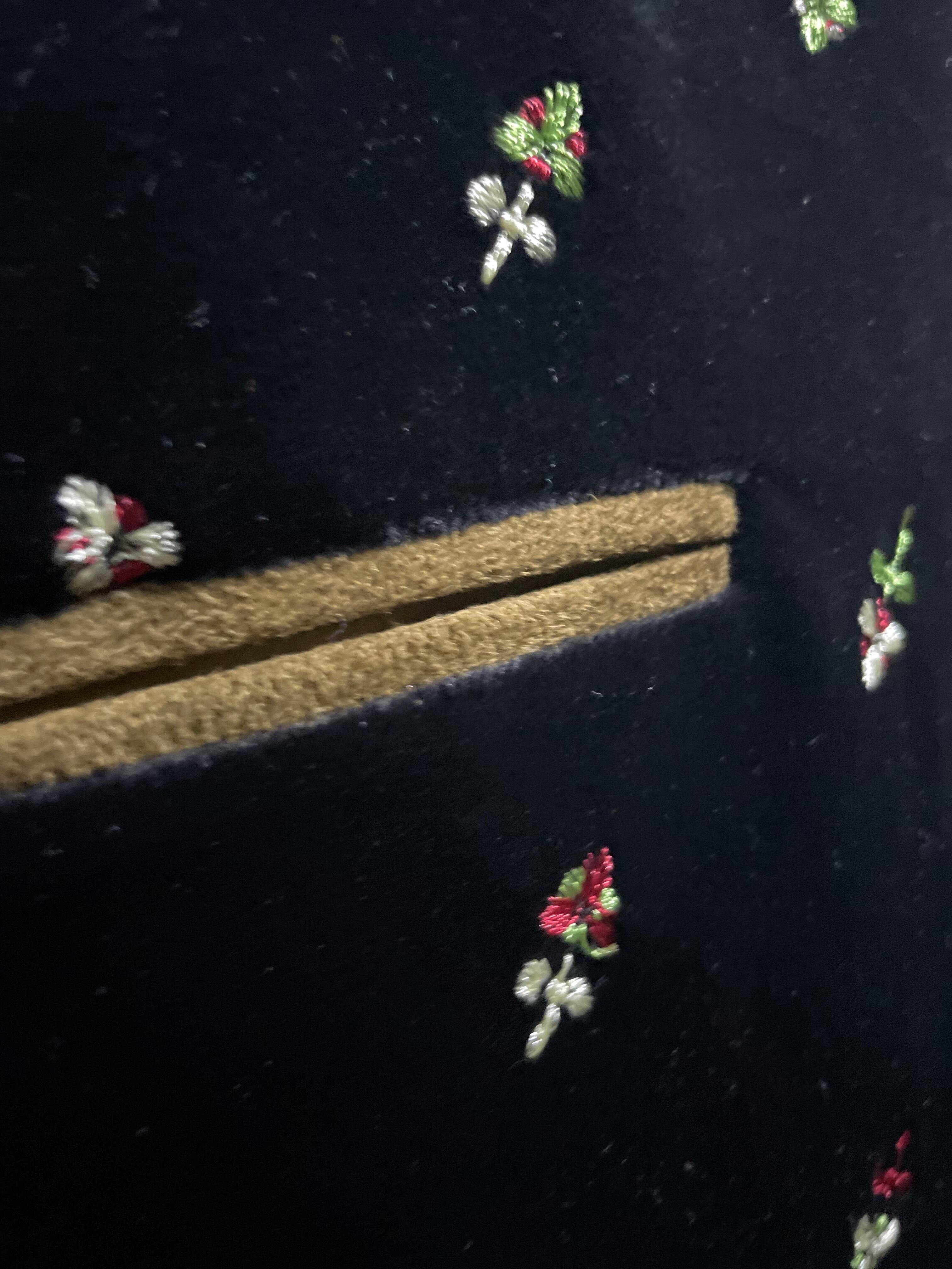 小さく可憐な花々の刺繍。ブラウンのパイピングと、垂直に並んだ金属の半球ボタンがアクセント。これからの季節に更に発揮してくれそう。