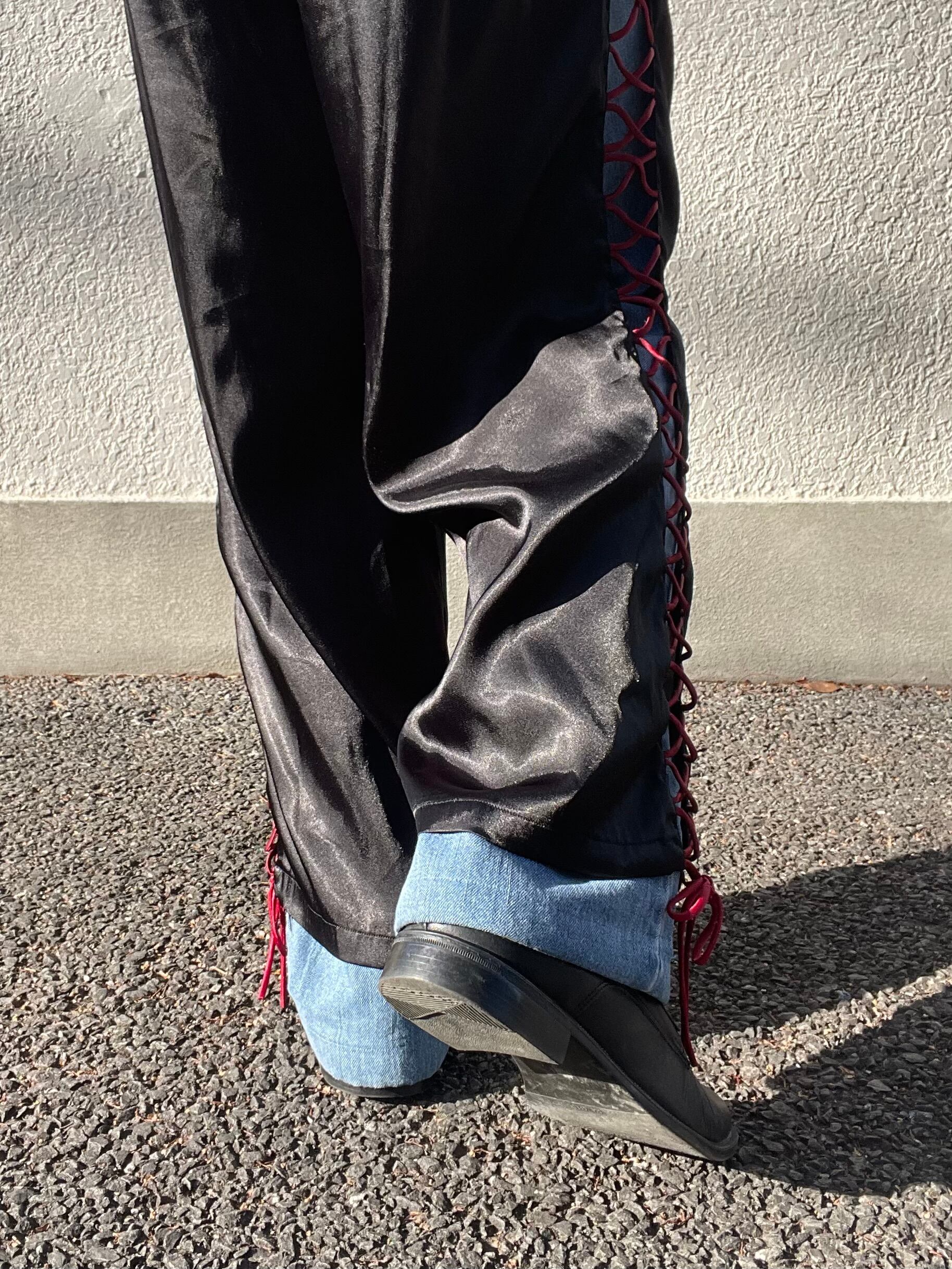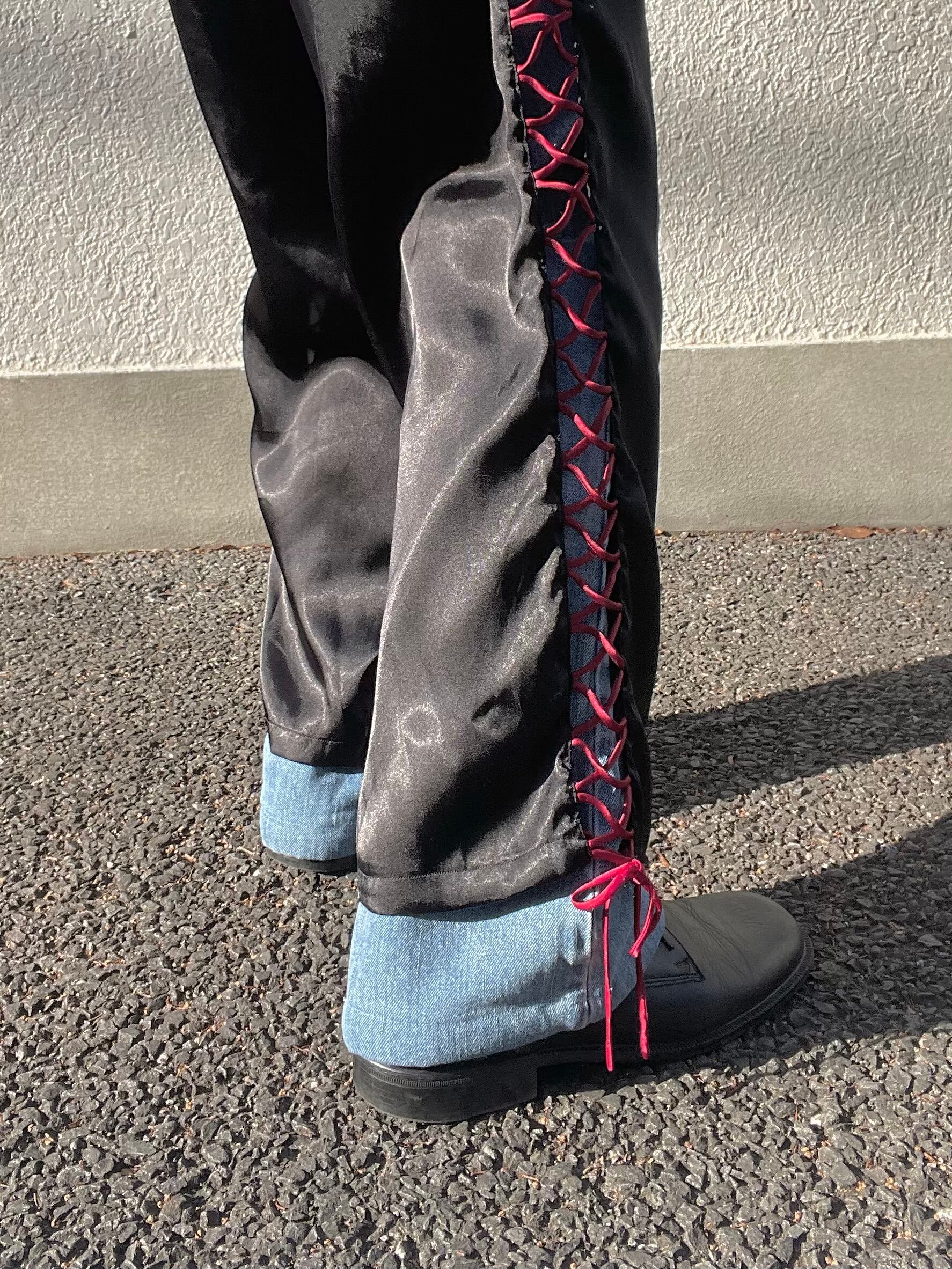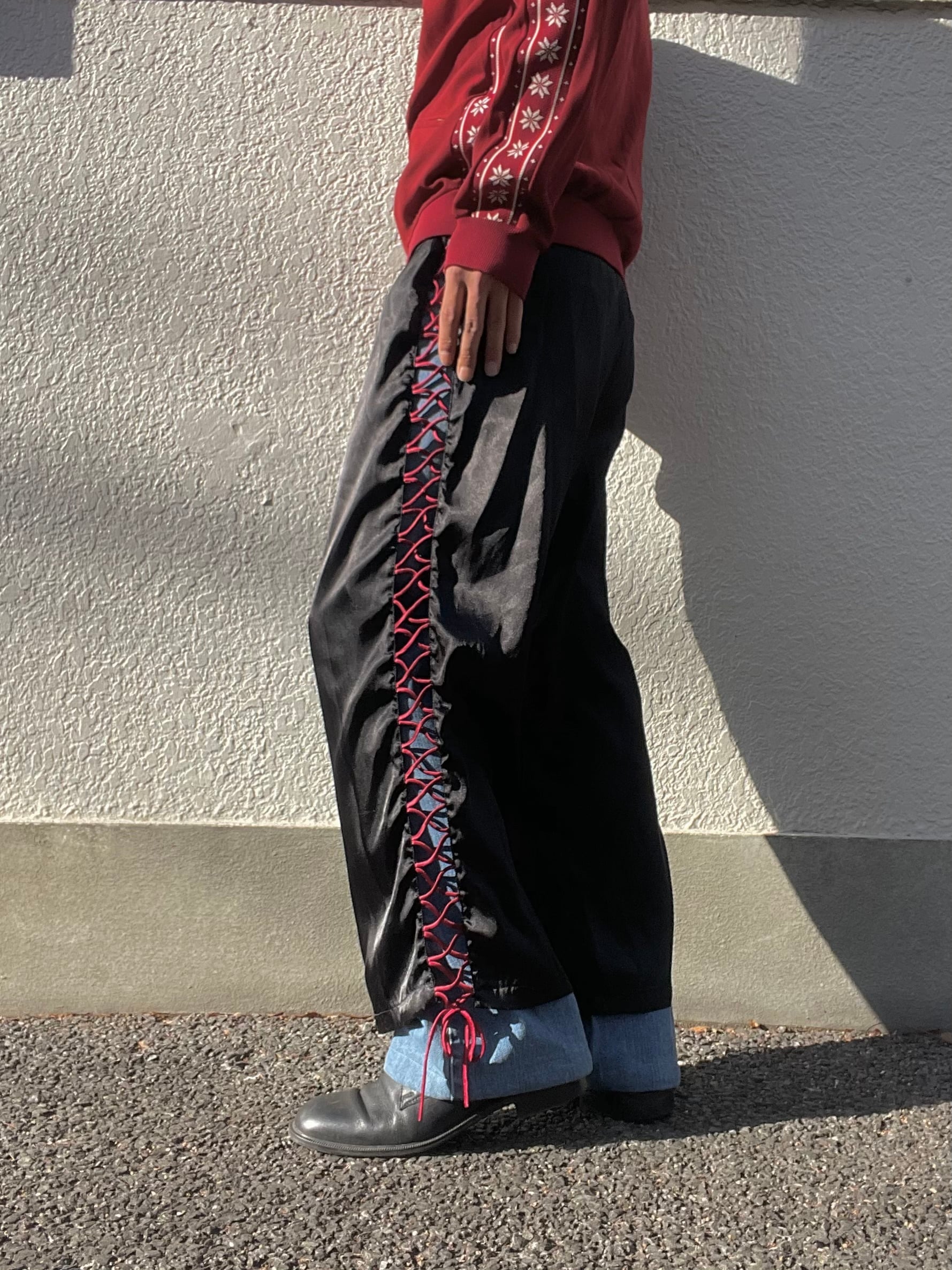 光を吸い込んでは鋭く跳ね返す質感。サイドを奔るレースアップという名の、構造的な「バグ」が見所ですね。