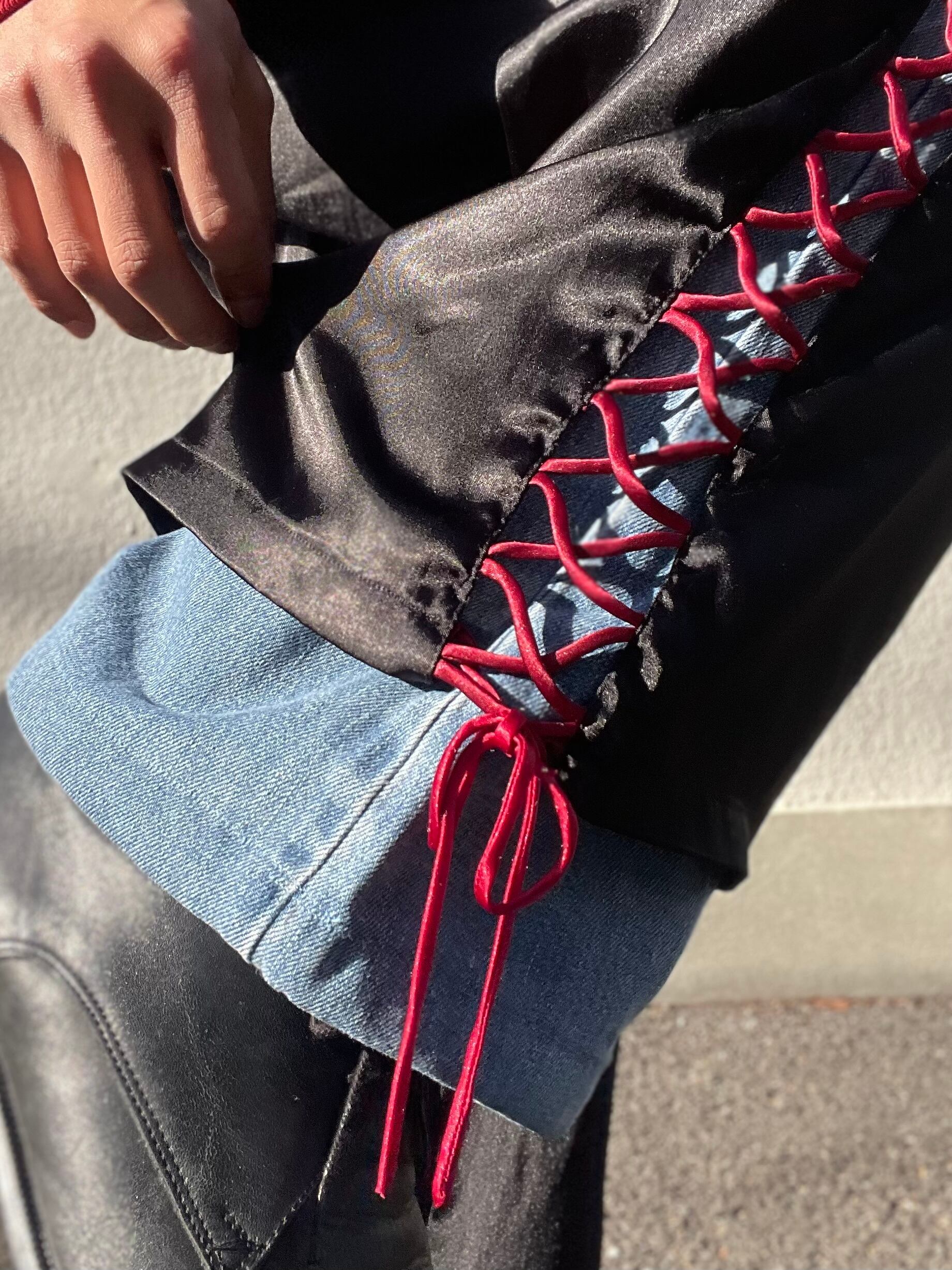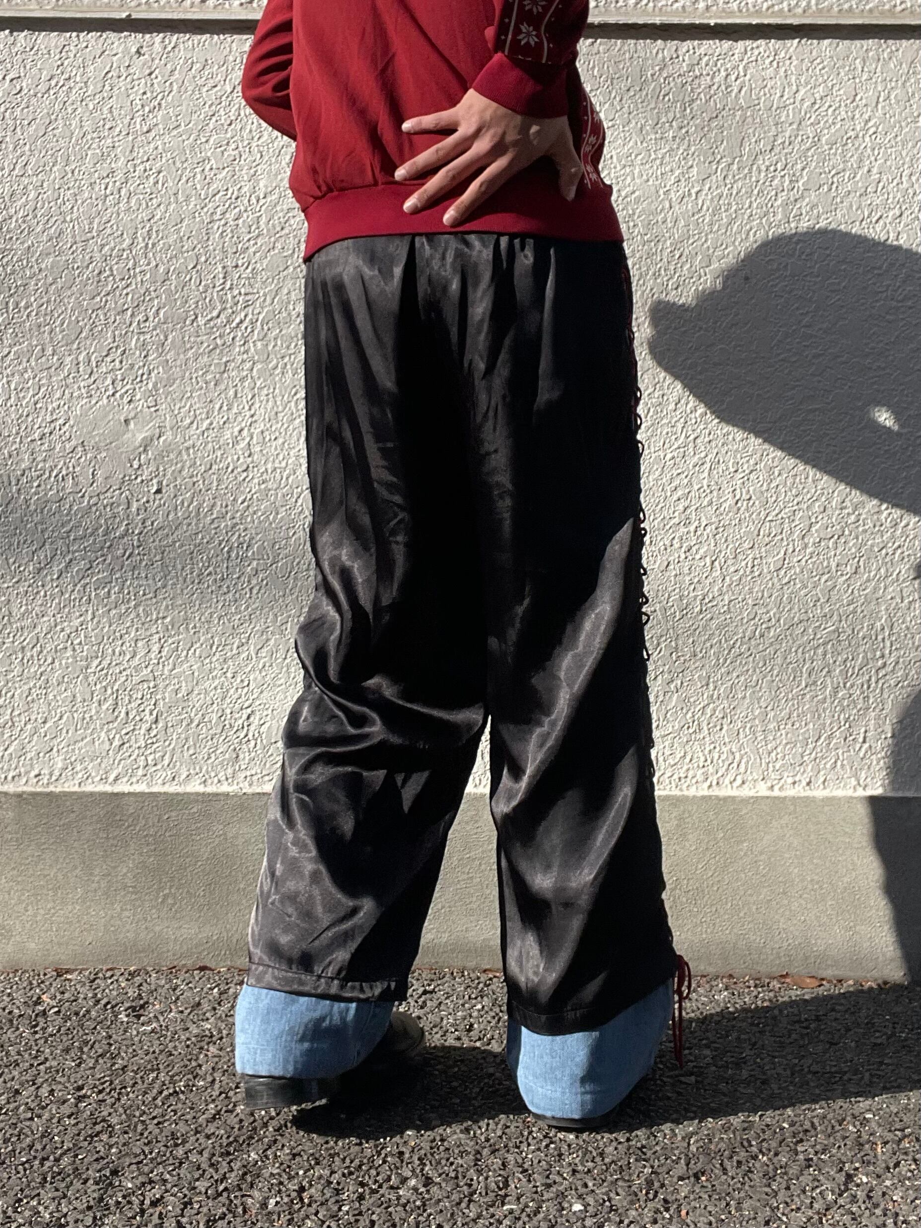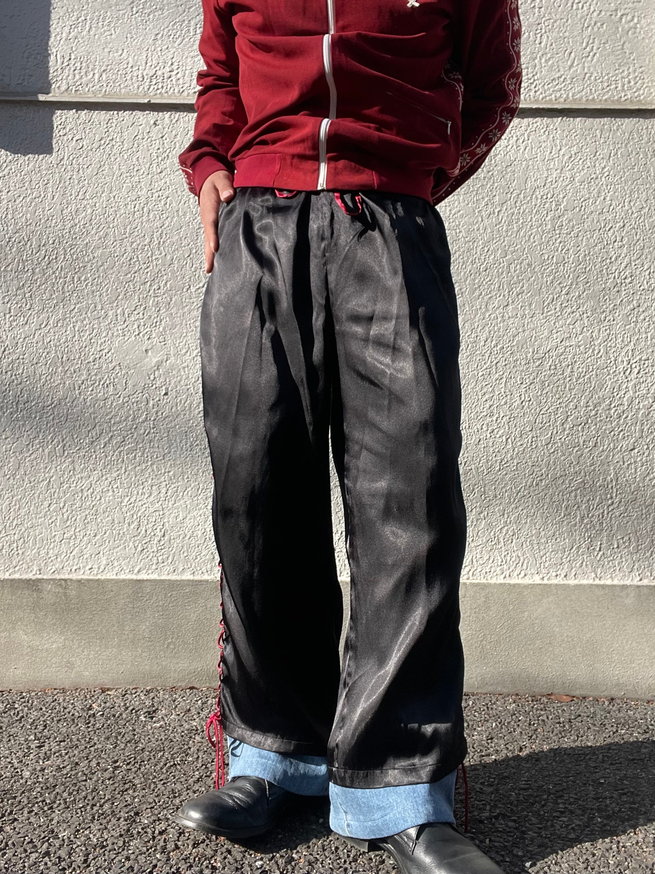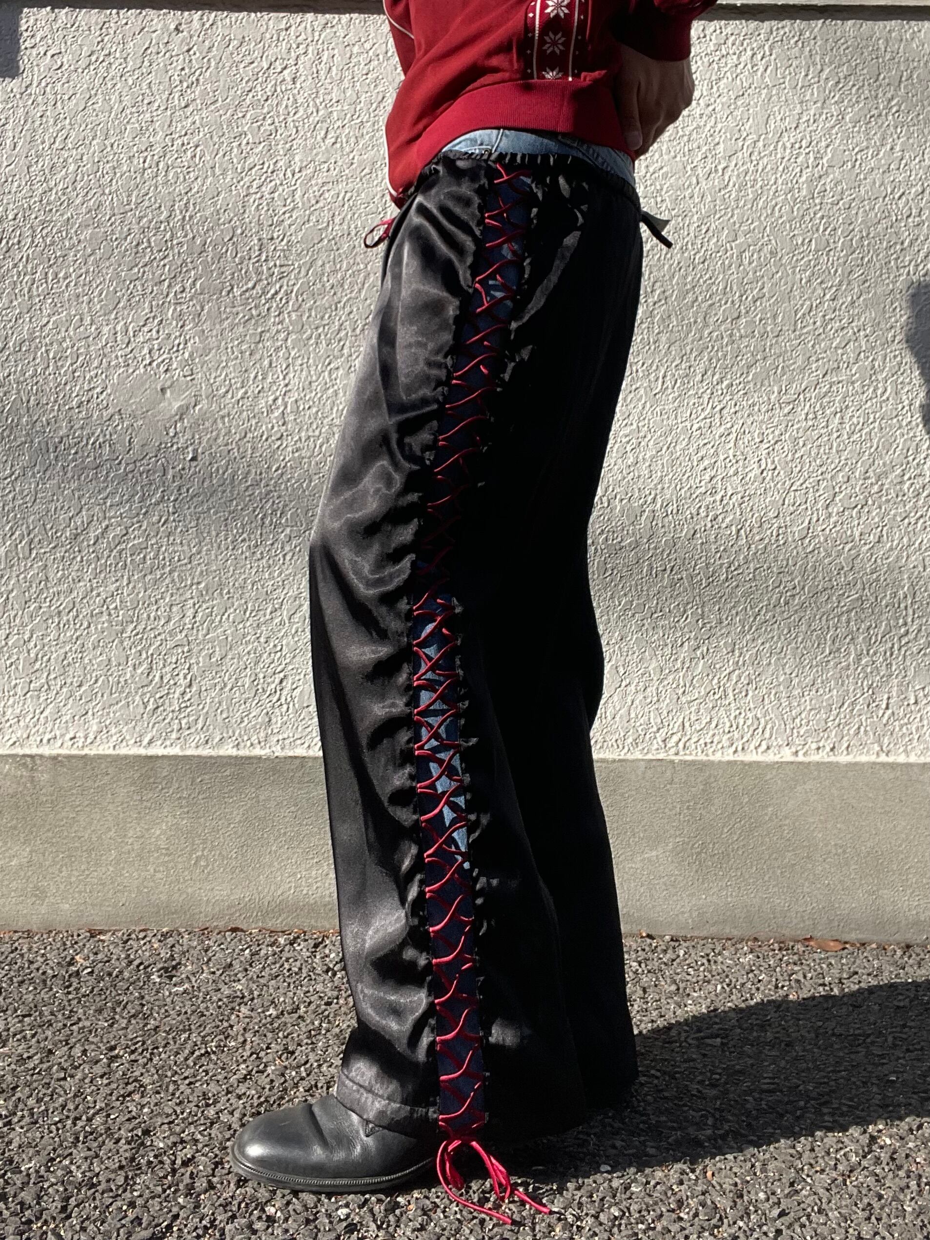 光を吸い込んでは鋭く跳ね返す質感。サイドを奔るレースアップという名の、構造的な「バグ」が見所ですね。