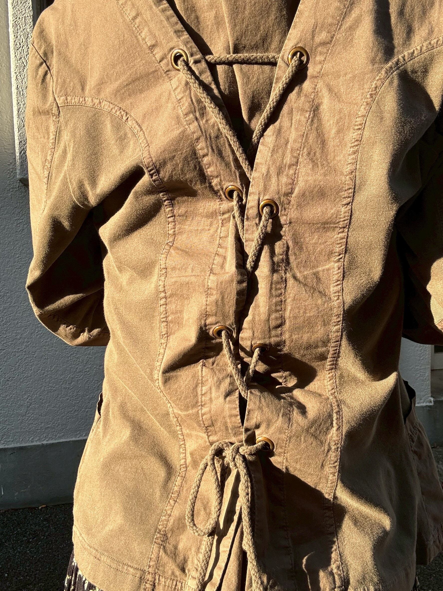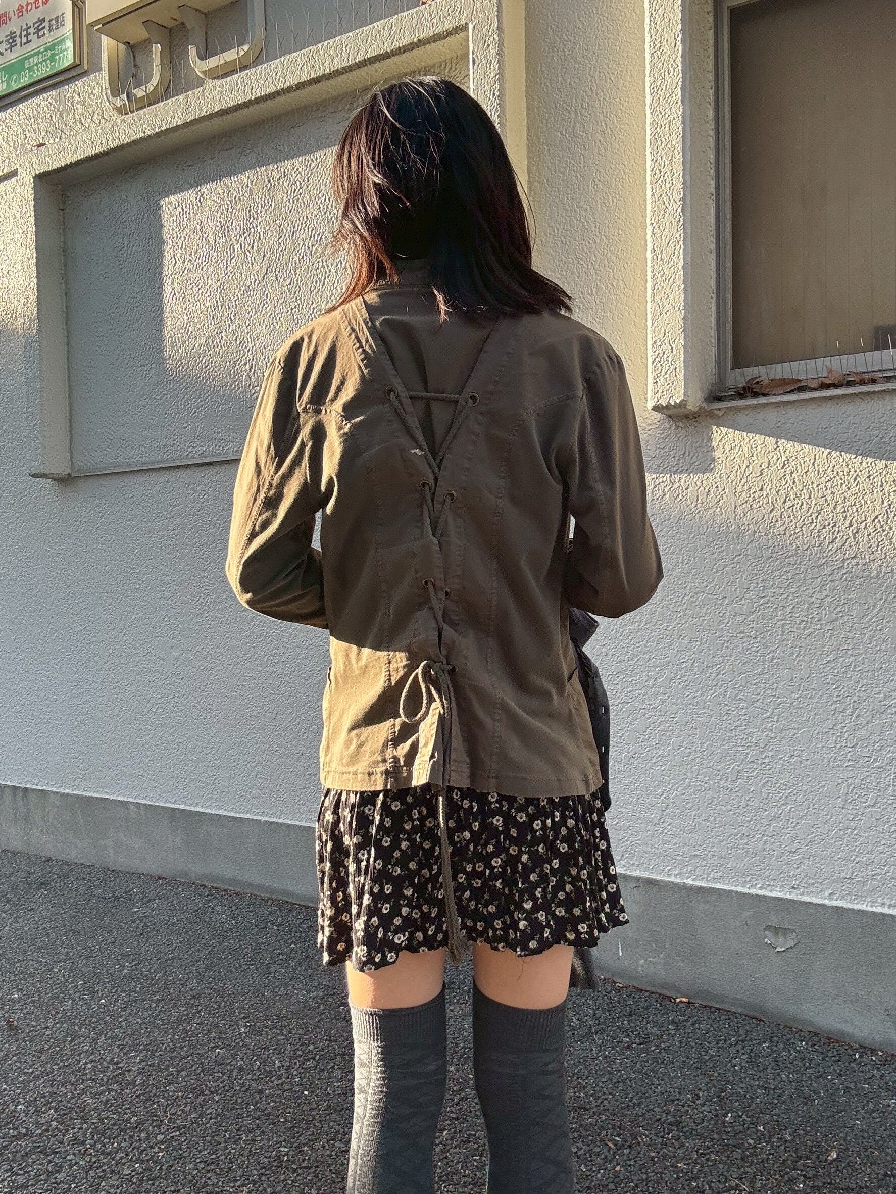 レースアップという綺麗な構造的な不協和音は、タイトなシルエットも合わさり現行品顔負けの一着です。