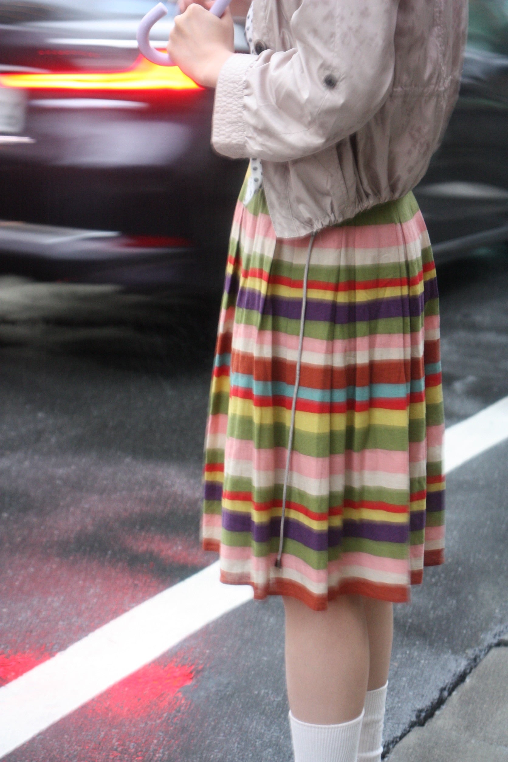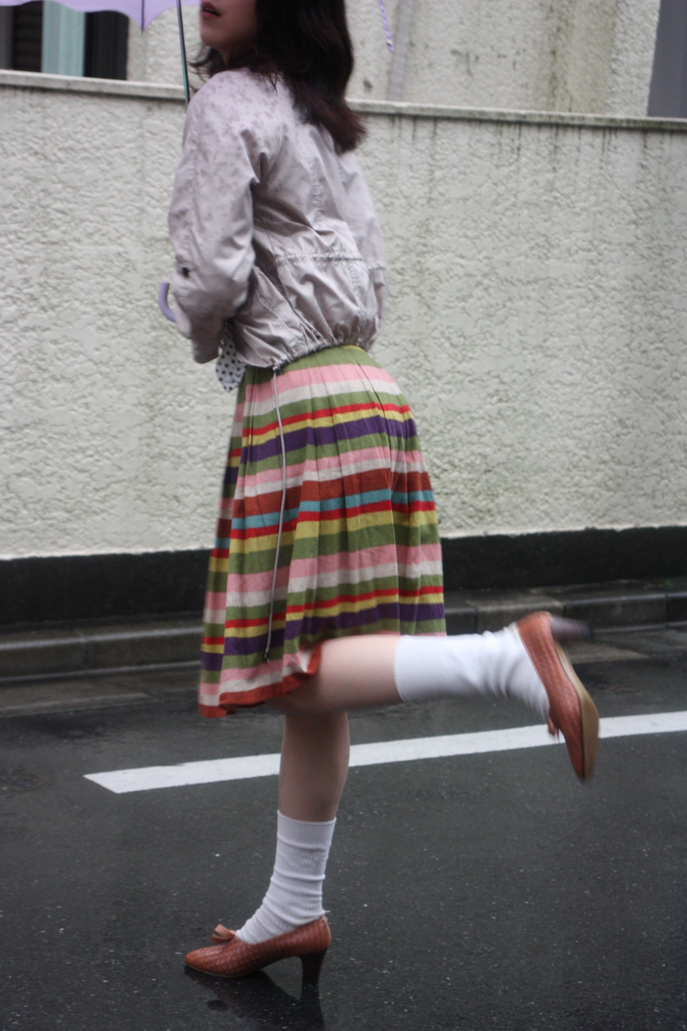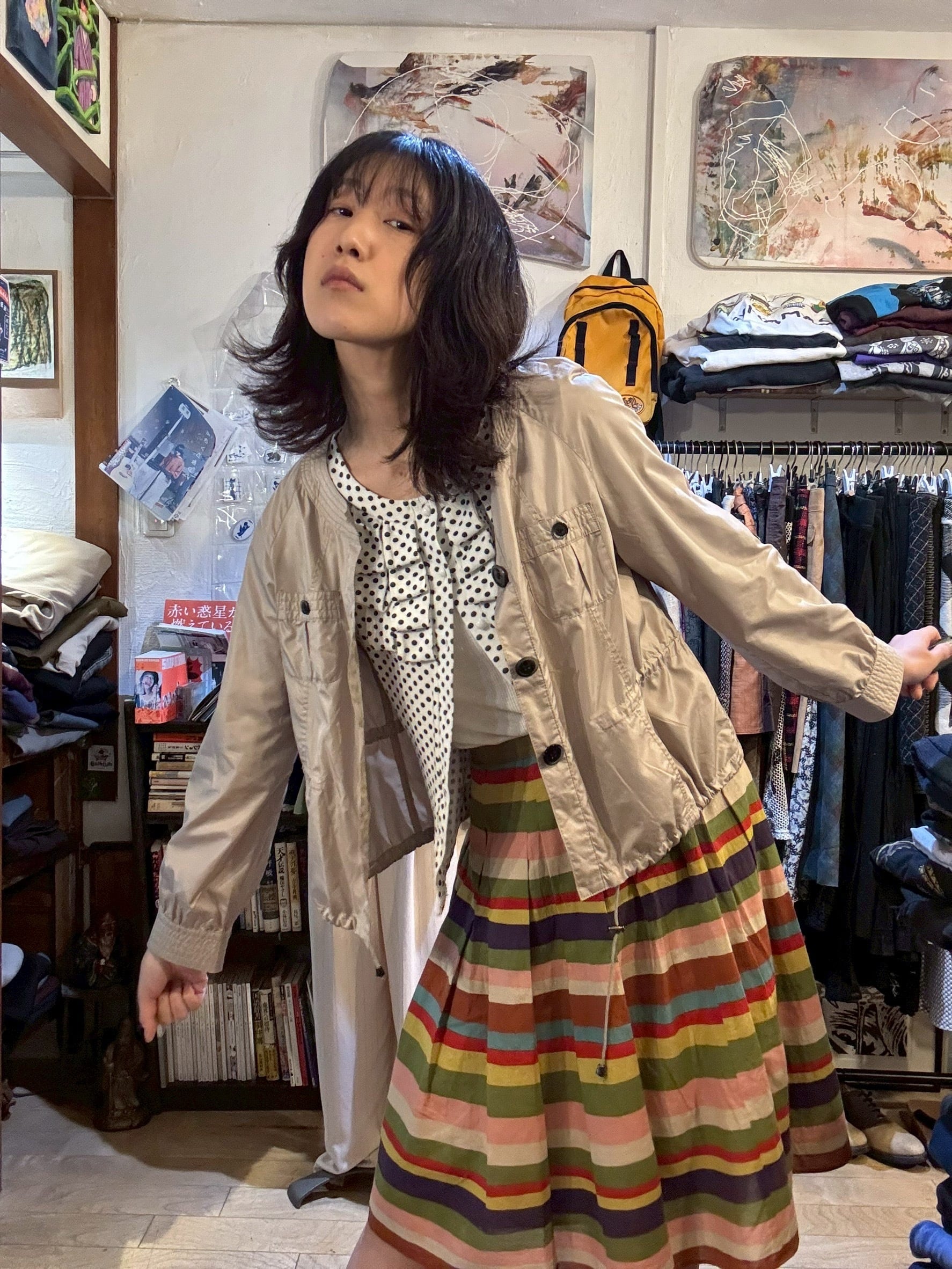 ピンク、マスタード、パープルetc。横に走る鮮やかな色彩の地層が目を惹くスカート。