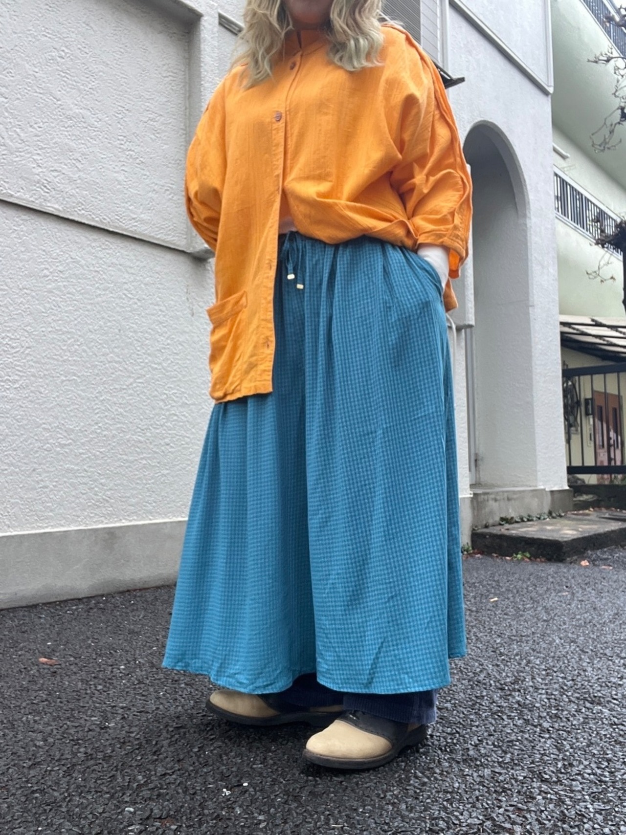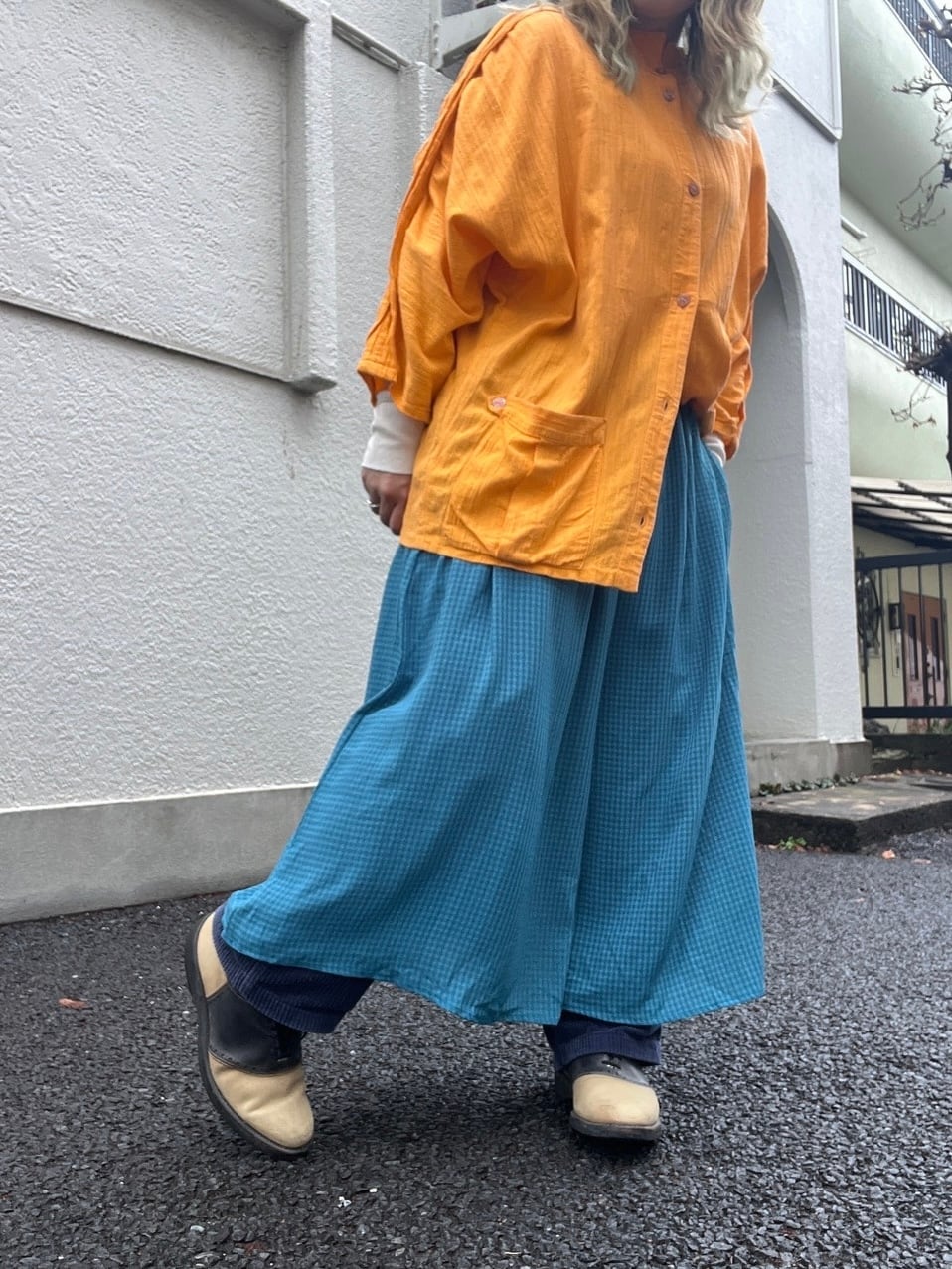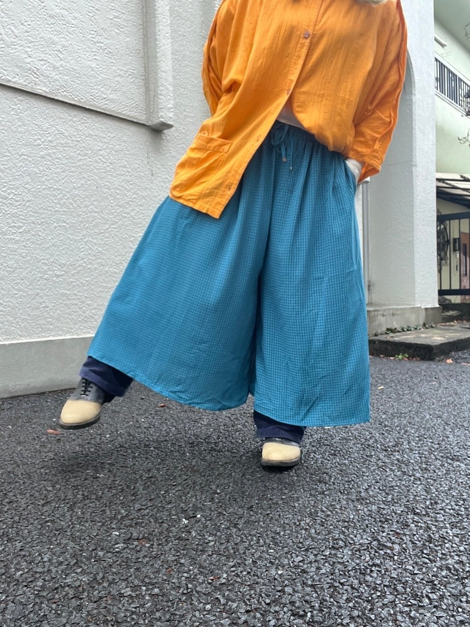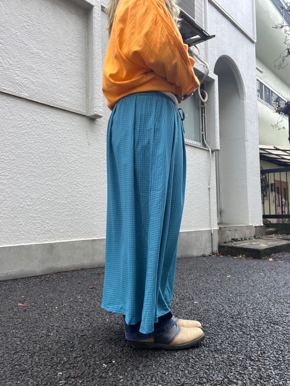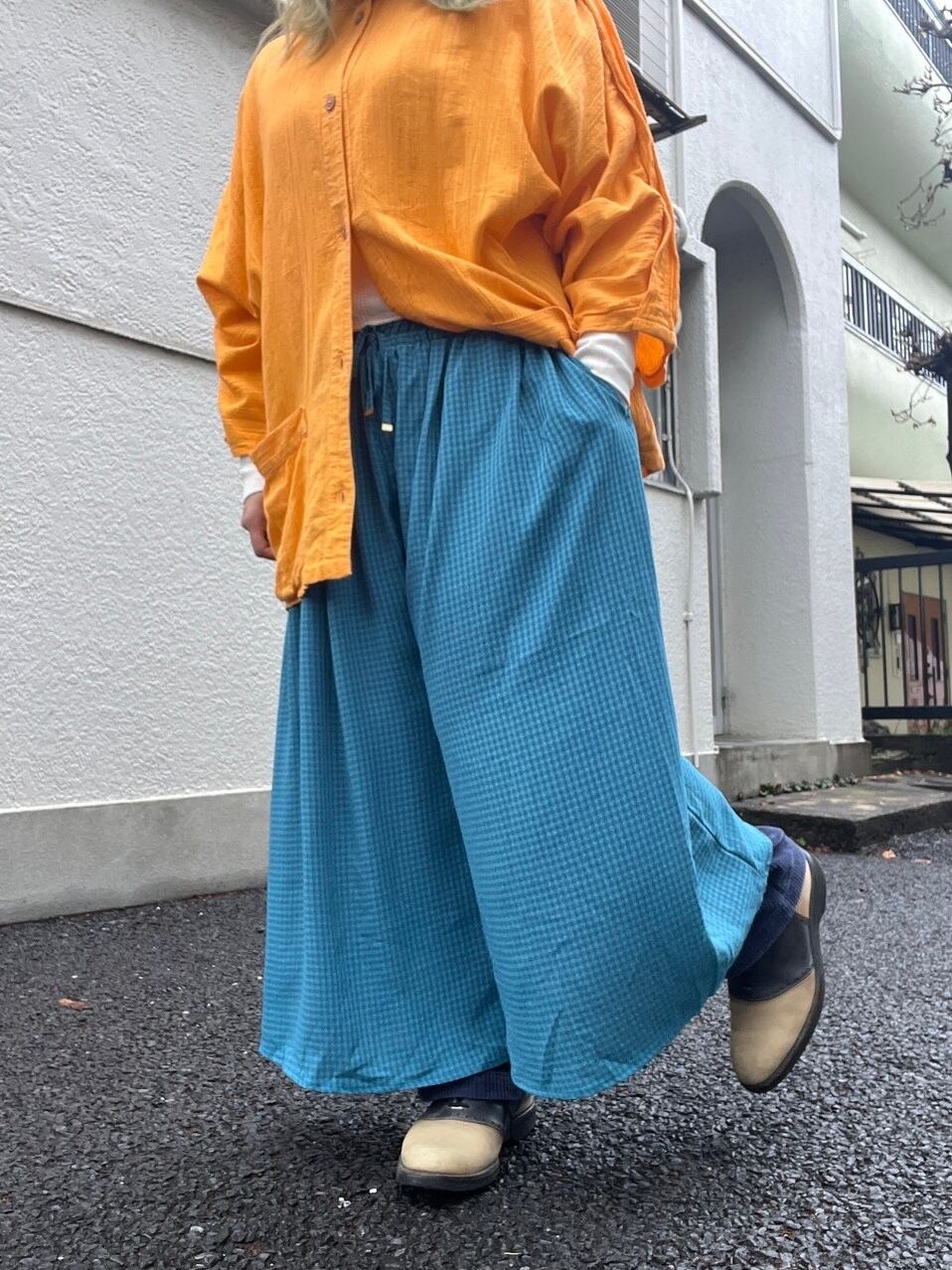 たっぷりと生地を使ったワイドなシルエット。歩くたびに、風をはらんで優雅に揺れ、その美しいドレープが目を惹きます。