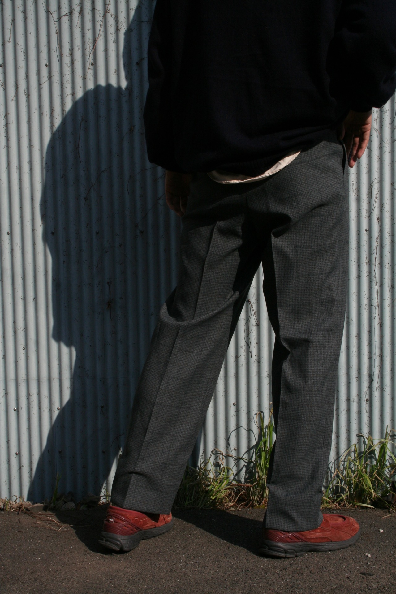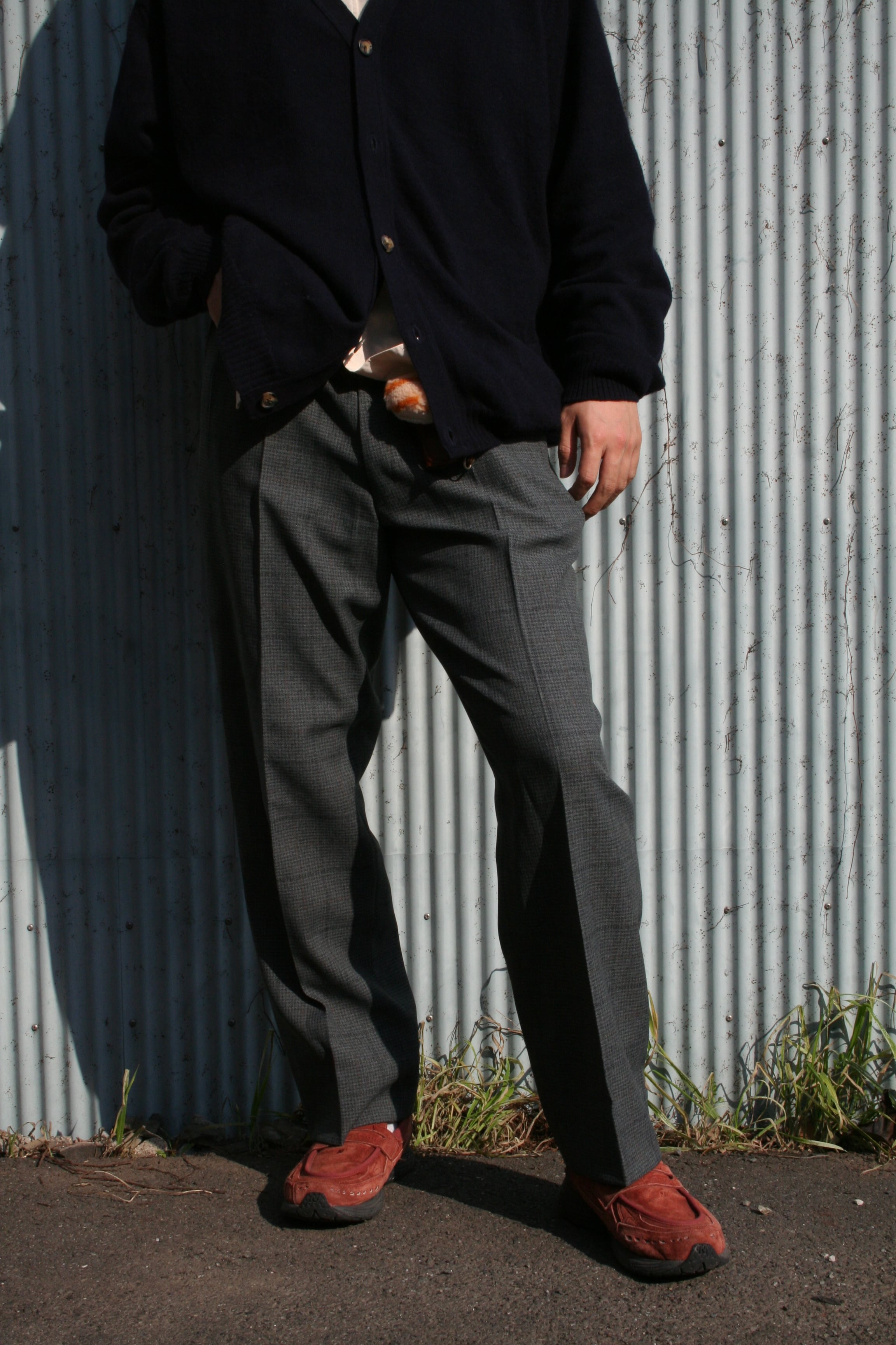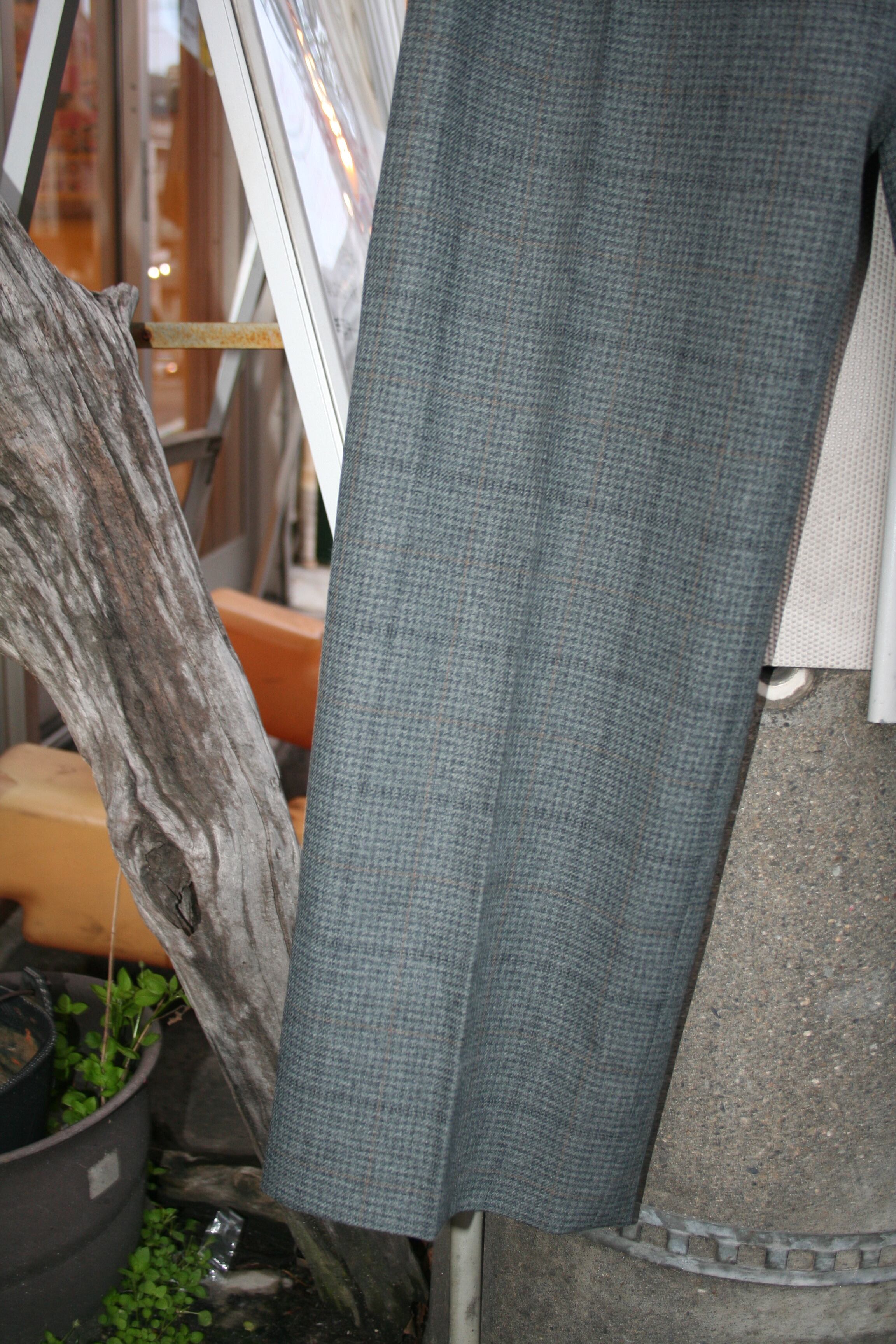 表記はないですが、恐らくウール混紡素材。この繊細なチェックパターンと、程よく使い込まれた生地の落ち感が、スラックスの堅苦しさを心地よい「抜け感」へと変えてくれます。