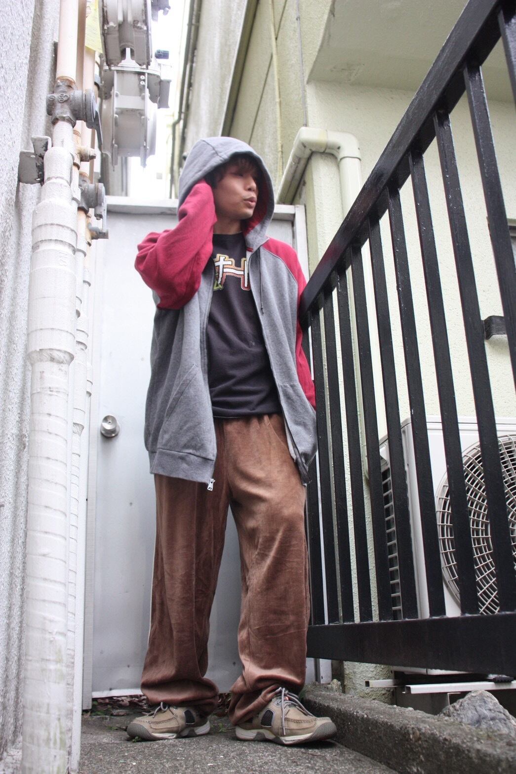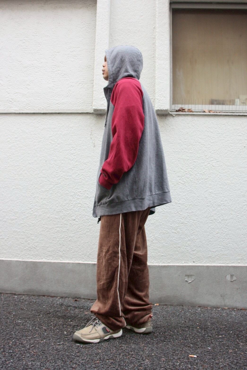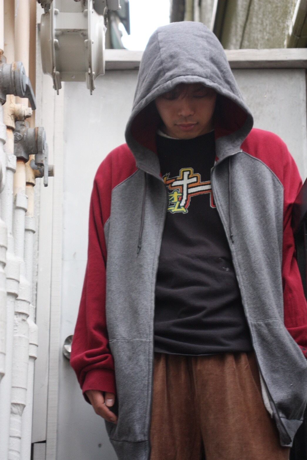 肩から袖へと大胆に色が切り替わるラグランスリーブの曲線。身体の動きに合わせてダイナミックに揺れ、平面的なパーカーに彫刻的な立体感を与えます。